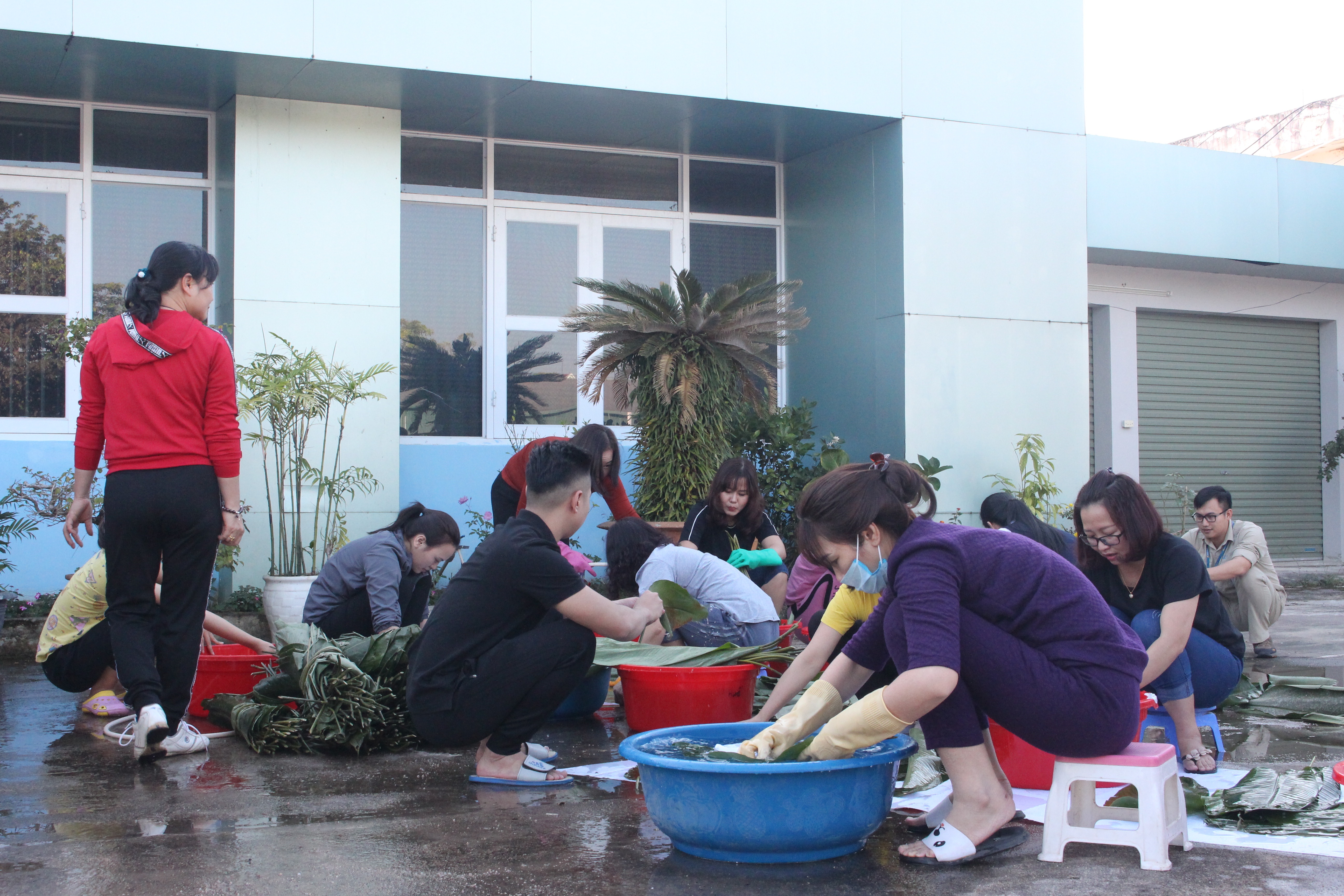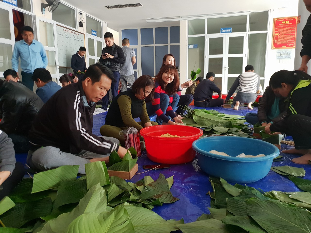 Sau giờ bay ngày 25/1, toàn thể cán bộ, nhân viên Cảng hàng không Điện Biên đã bắt đầu chuẩn bị cho công tác gói bánh chưng: người rửa lá dong, người vo gạo, người ướp thịt…
