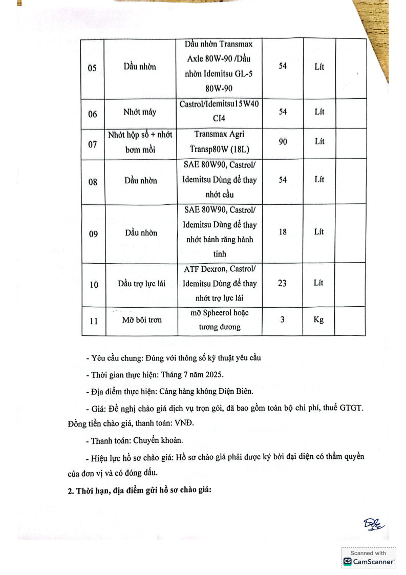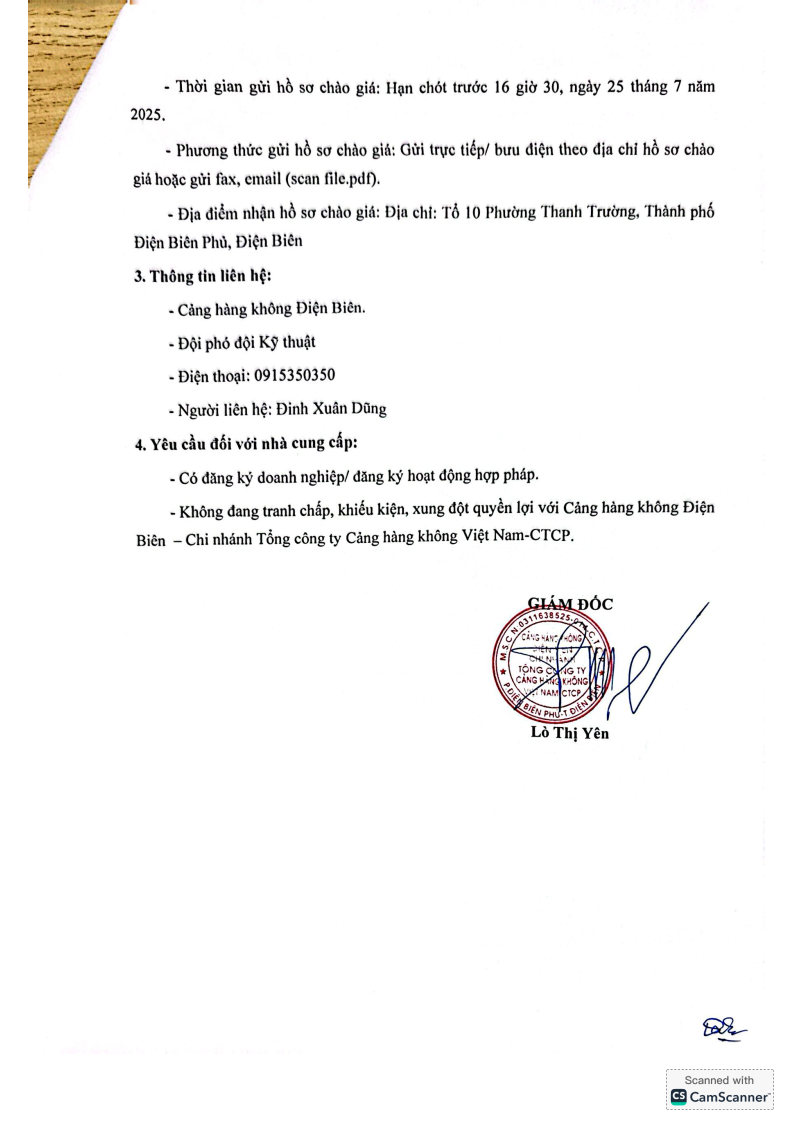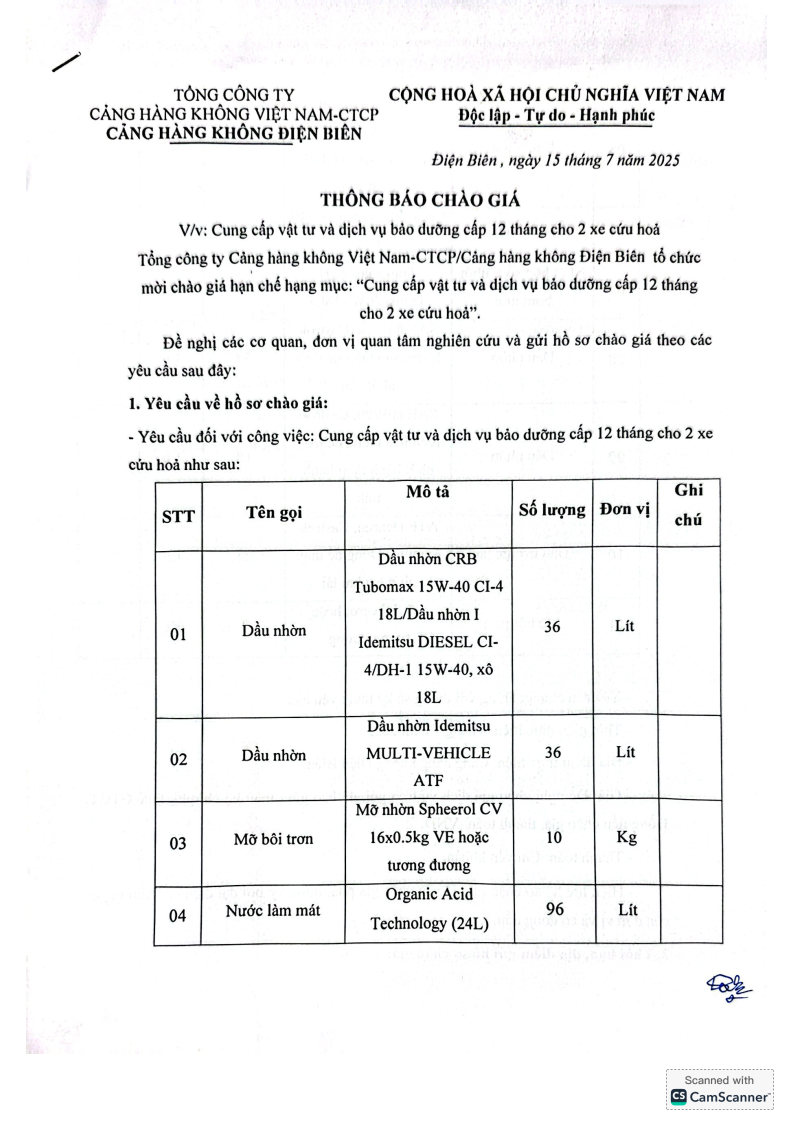 Thông báo chào giá về việc cung cấp vật tư và dịch vụ bảo dưỡng cấp 12 tháng cho 2 xe cứu hoả, Cảng hàng không Điện Biên