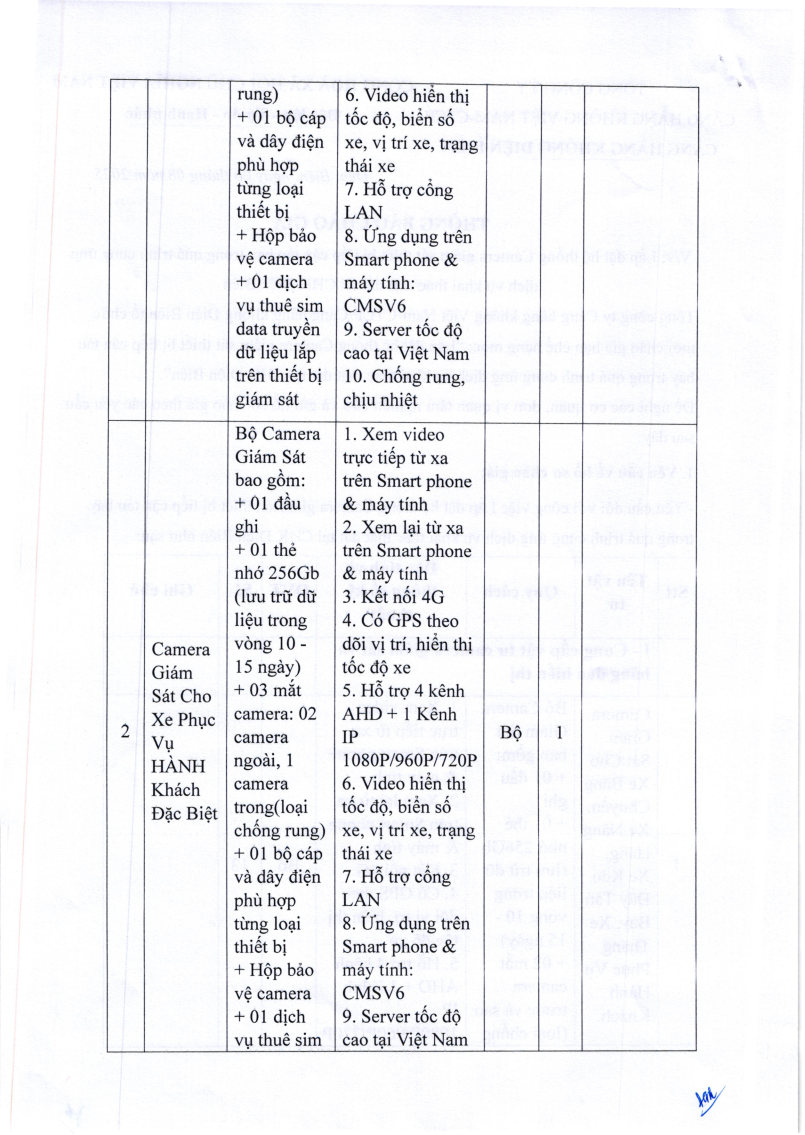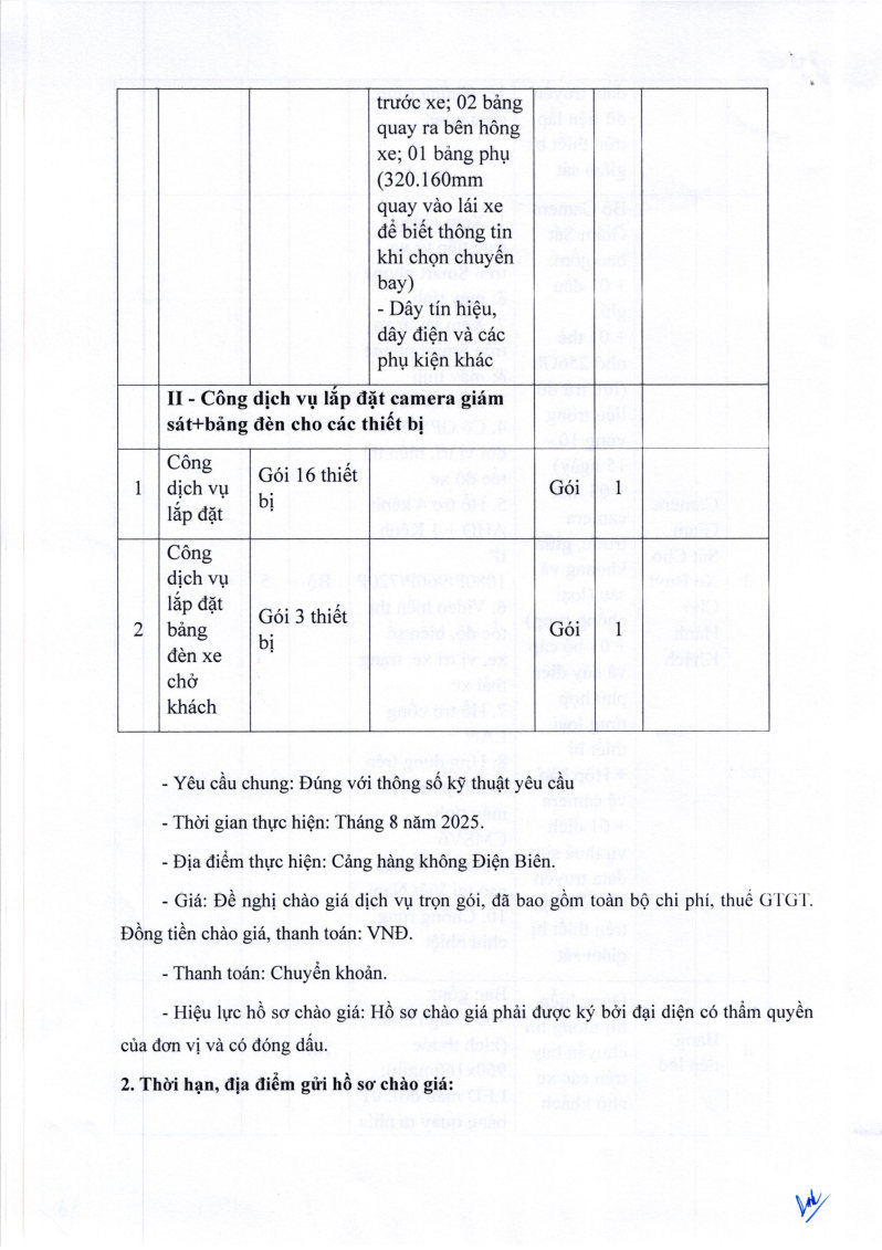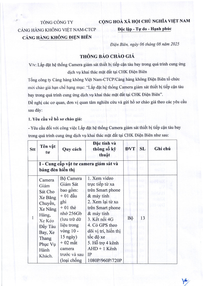 Thông báo chào giá về việc lắp đặt hệ thống Camera giám sát thiết bị tiếp cận tàu bay trong quá trình cung ứng dịch vụ khai thác mặt đất tại Cảng hàng không Điện Biên