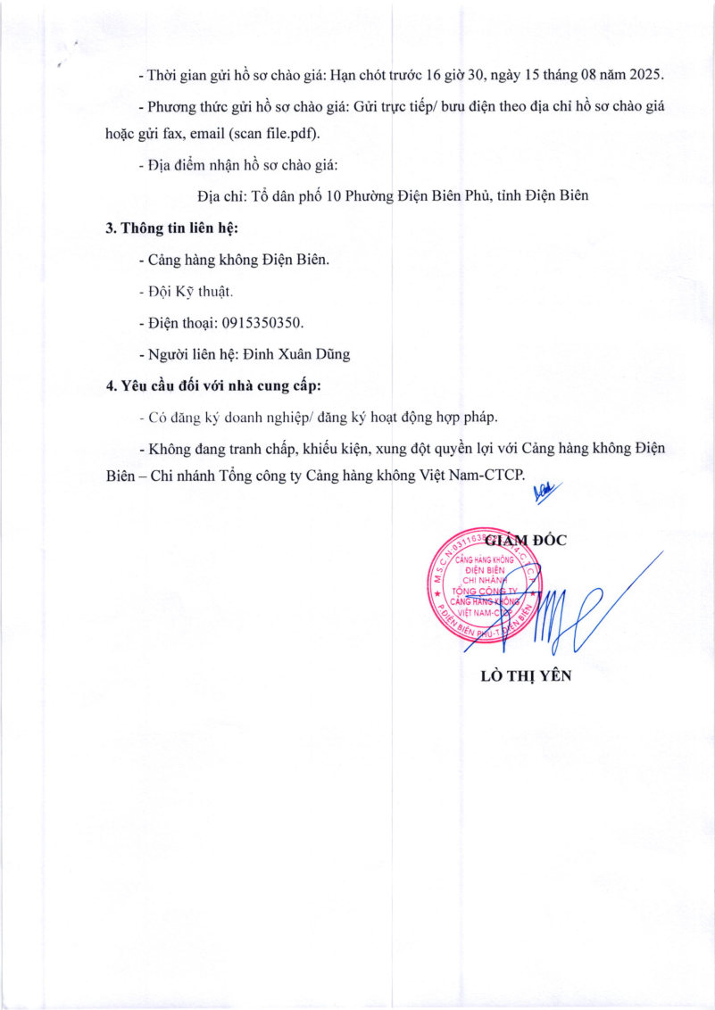 Thông báo chào giá về việc lập hồ sơ báo cáo đề xuất cấp lại giấy phép môi trường cho Cơ sở Cảng hàng không Điện Biên