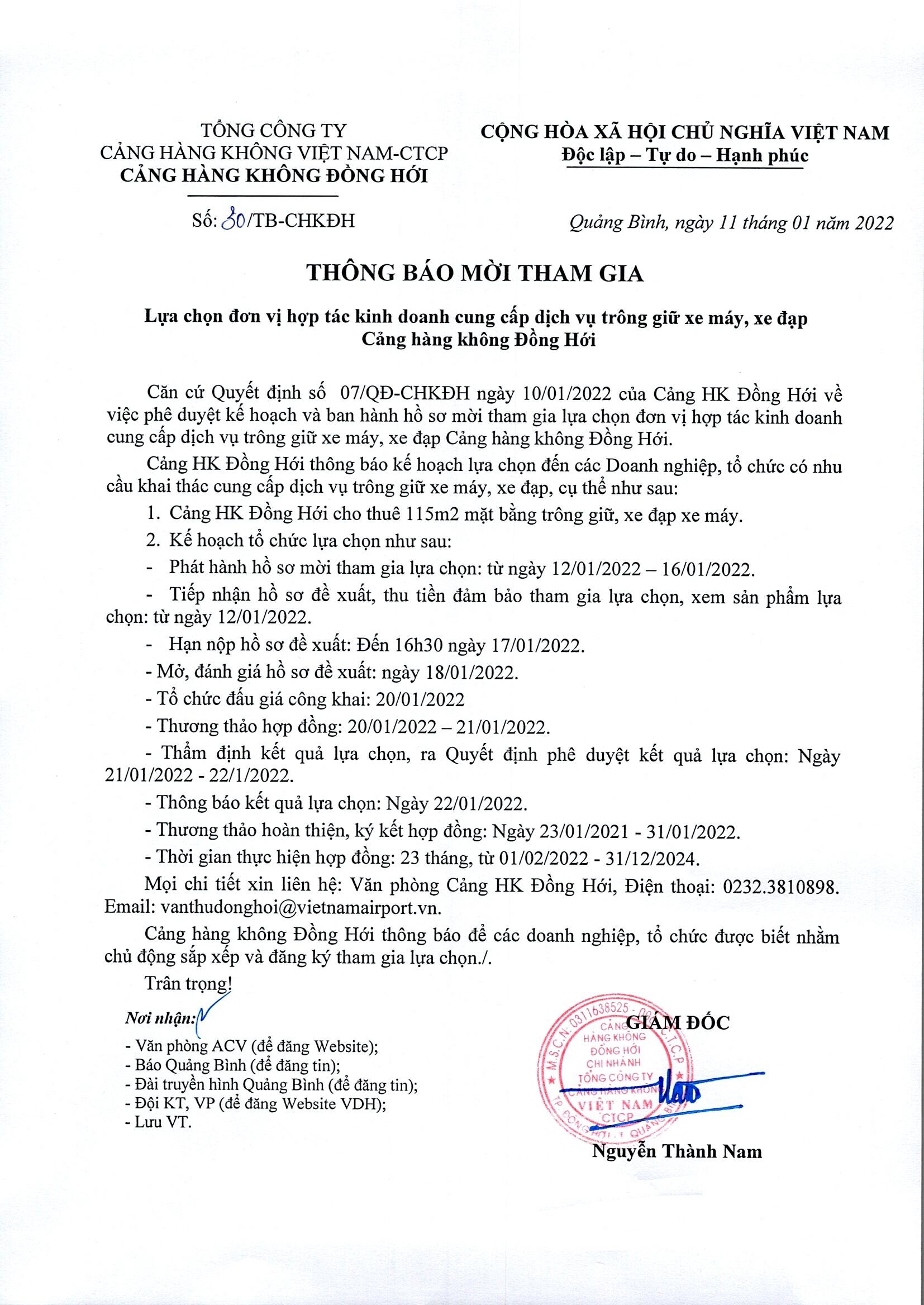 THÔNG BÁO MỜI THAM GIA LỰA CHỌN ĐƠN VỊ LỰA CHỌN KINH DOANH CUNG CẤP DỊCH VỤ TRONG GIỮ XE MÁY, XE ĐẠP CẢNG HÀNG KHÔNG ĐỒNG HỚI