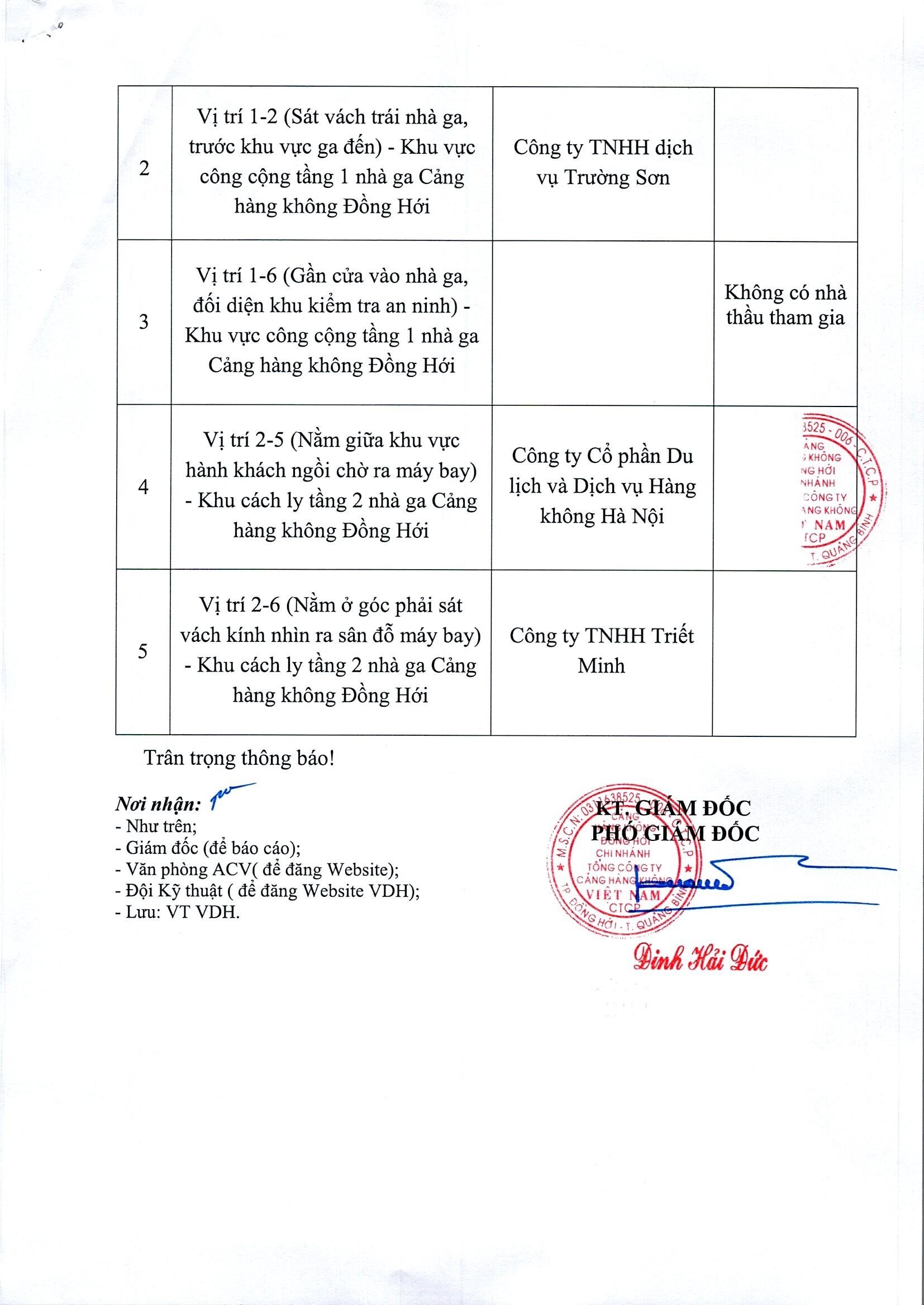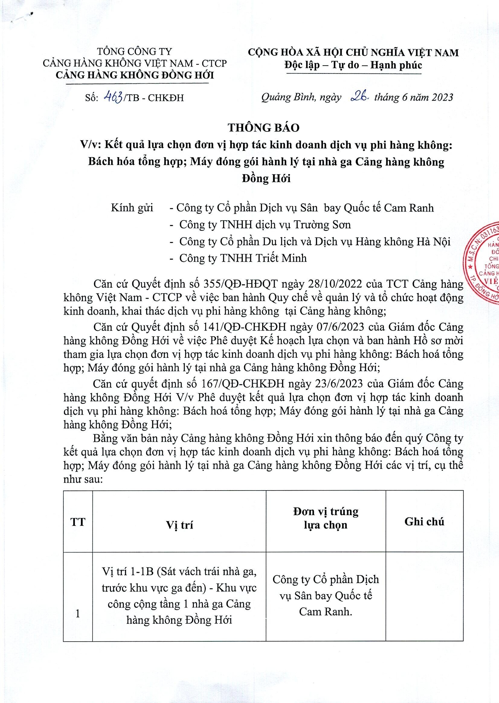 Thông báo V/v: Kết quả lựa chọn đơn vị hợp tác kinh doanh dịch vụ phi hàng không: Bách hóa tổng hợp; Máy đống gói hành lý tại nhà ga Cảng hàng không Đồng Hớ.i