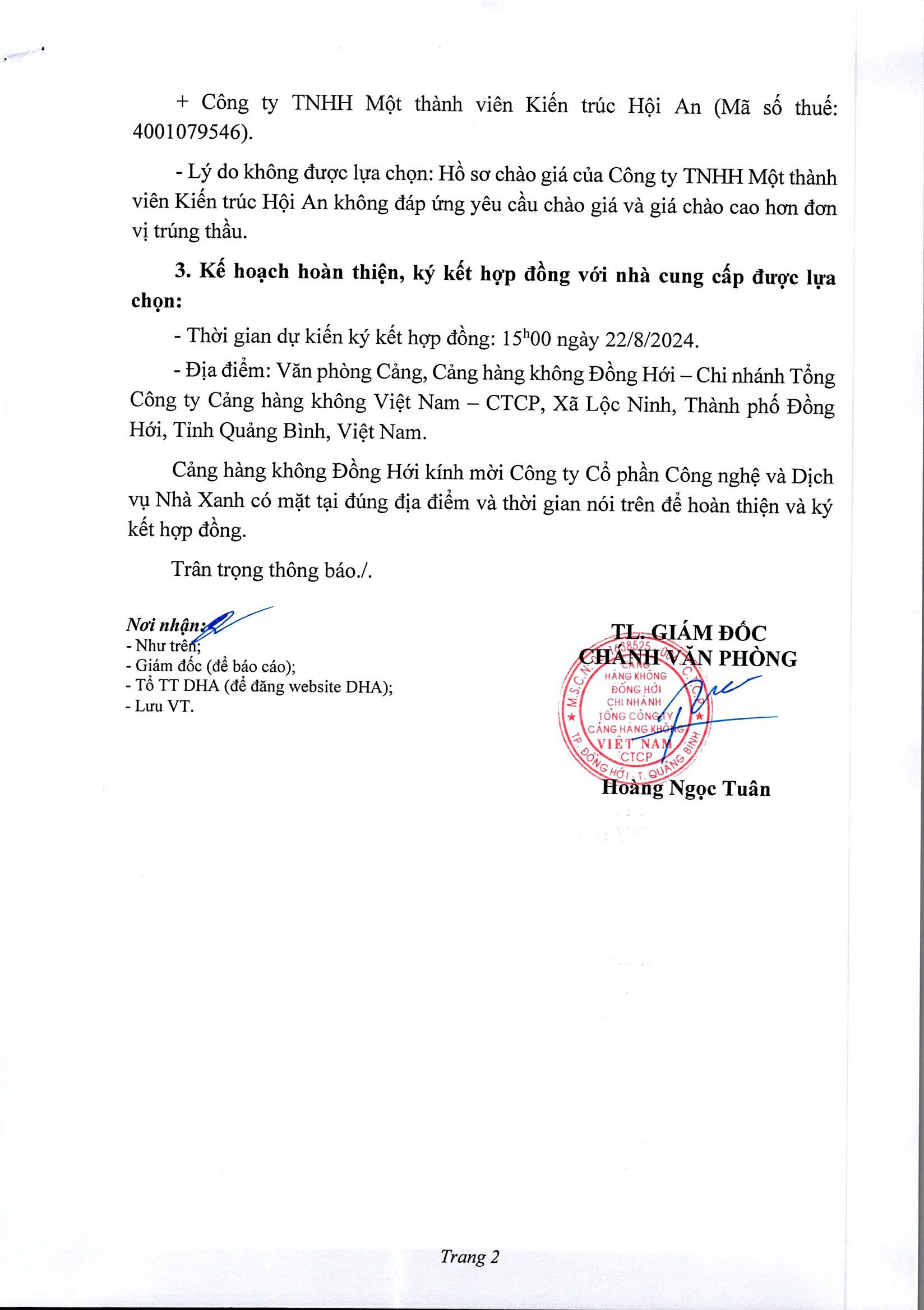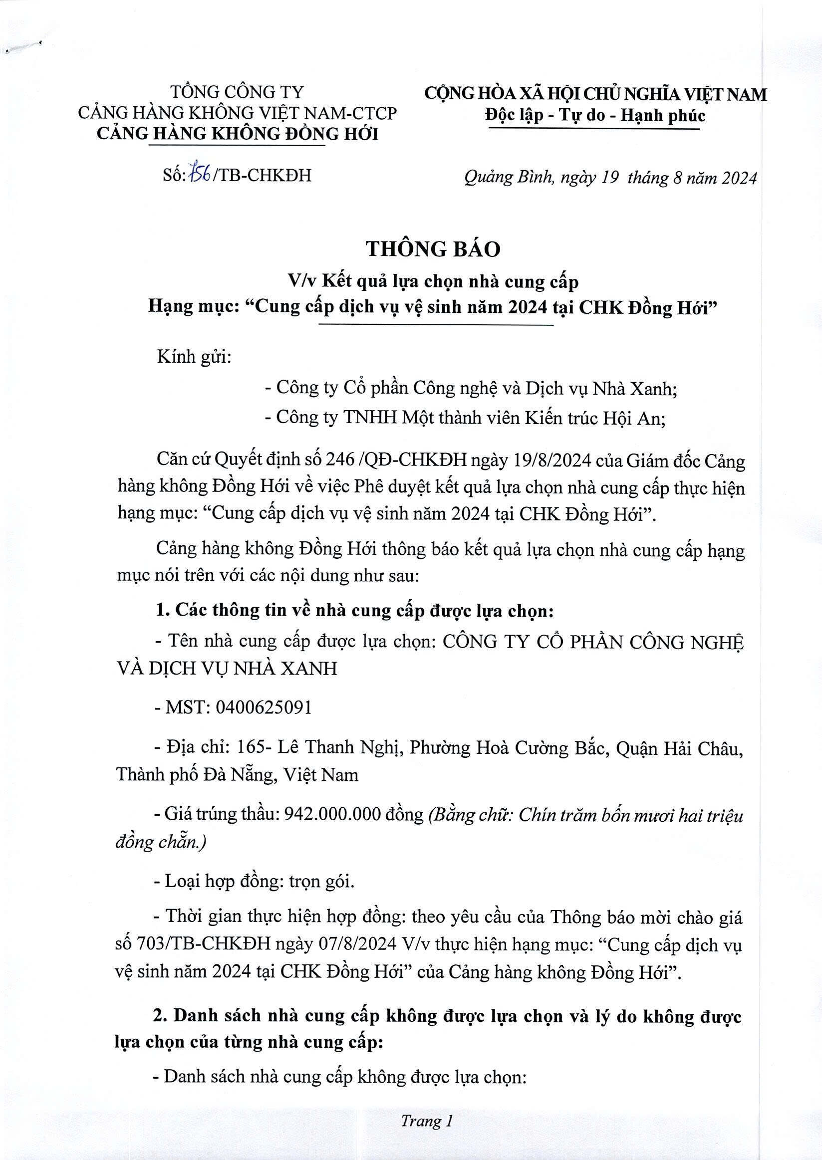 Thông báo V/v Kết quả lựa chọn nhà cung cấp Hạng mục: Cung cấp dịch vụ vệ sinh 2024 tại cảng Hàng không Đồng Hới