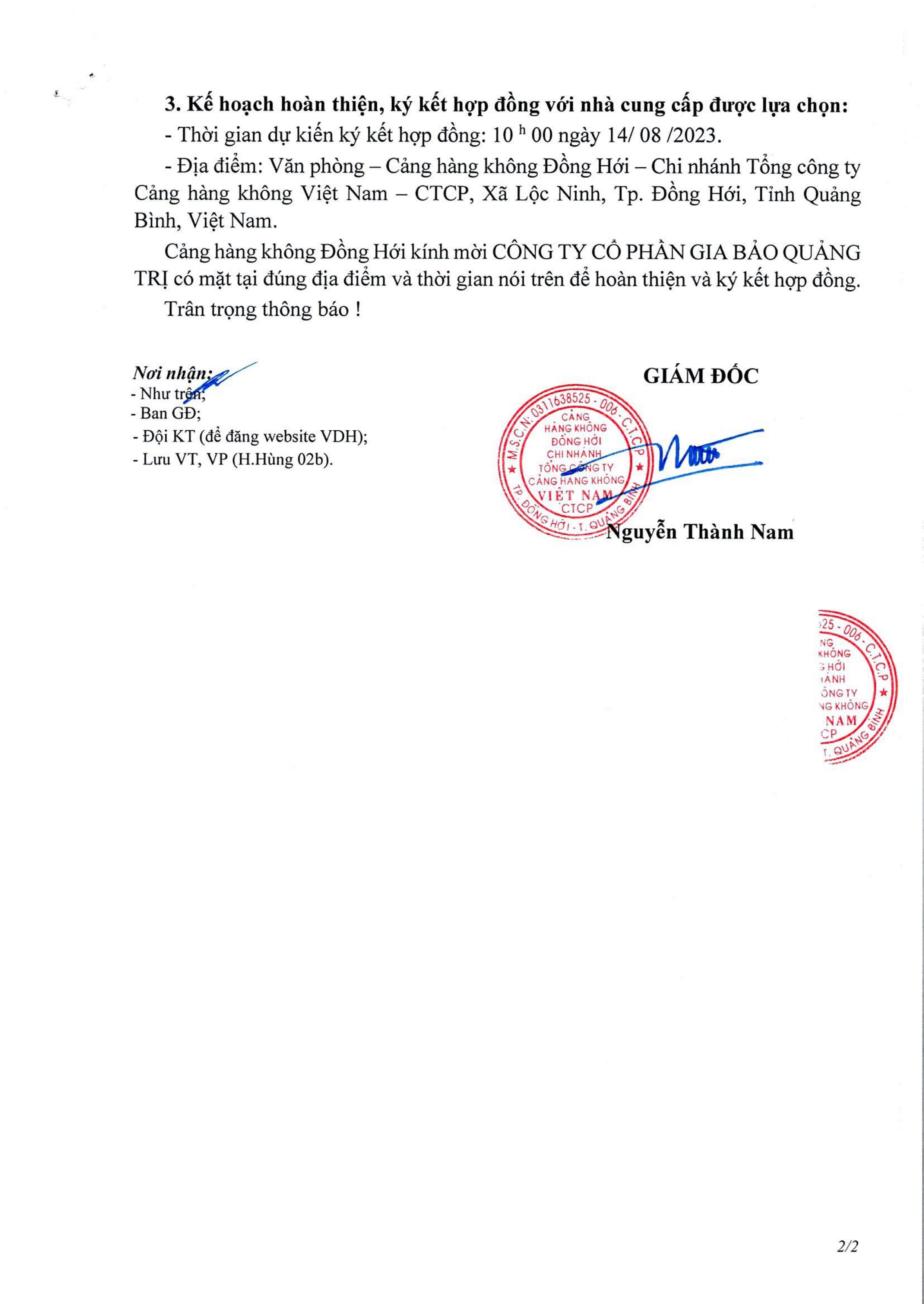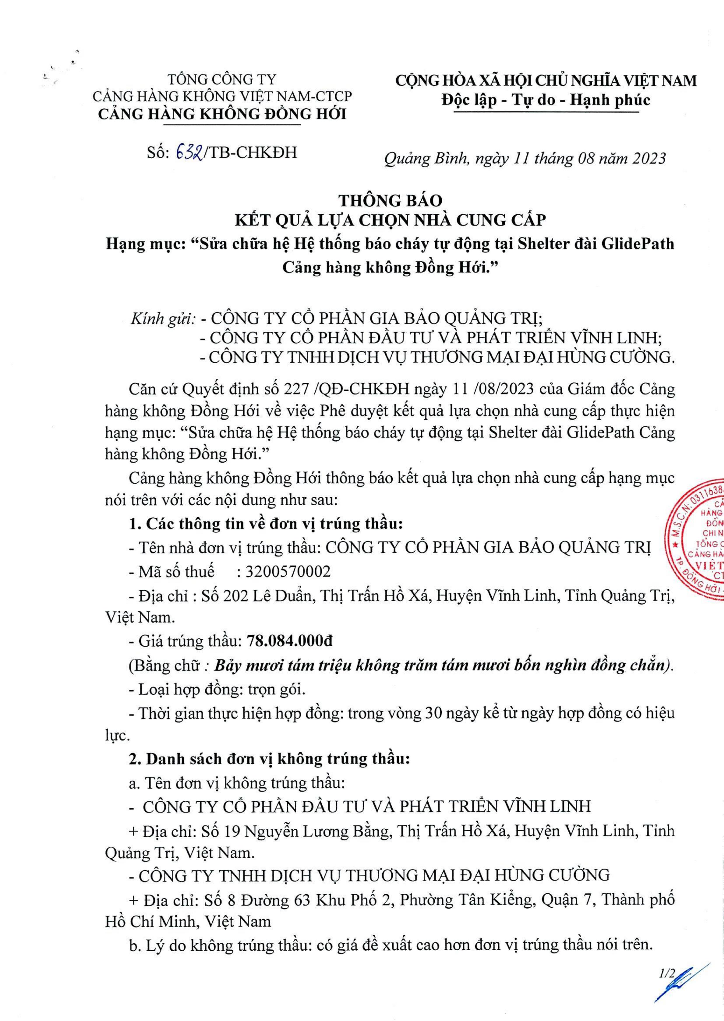 Thông báo kết quả lựa chọn nhà cung cấp hạng mục "Sửa chửa hệ thống báo cháy tự động tại Shelter đài GlidePath Cảng hàng không Đồng Hới"