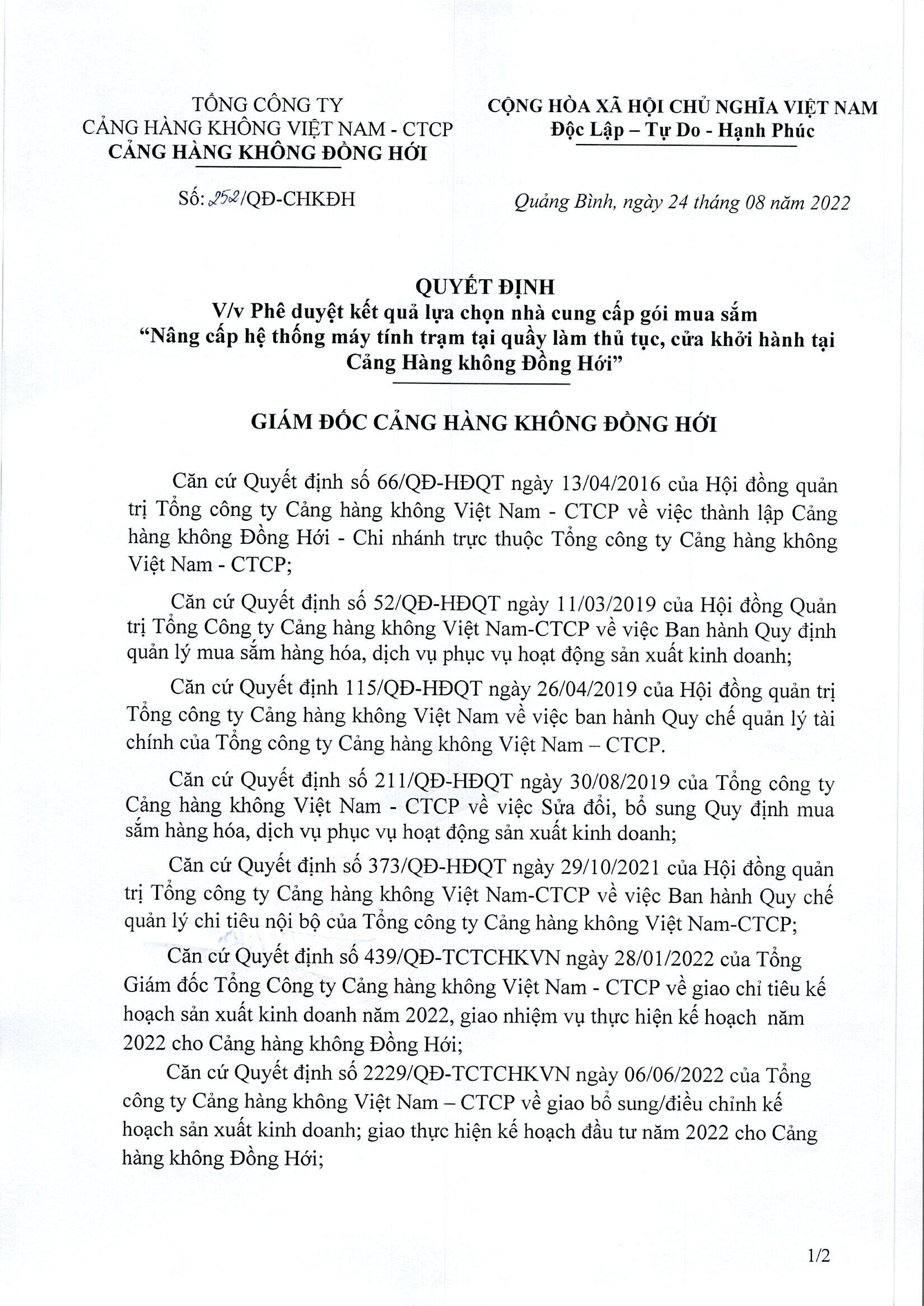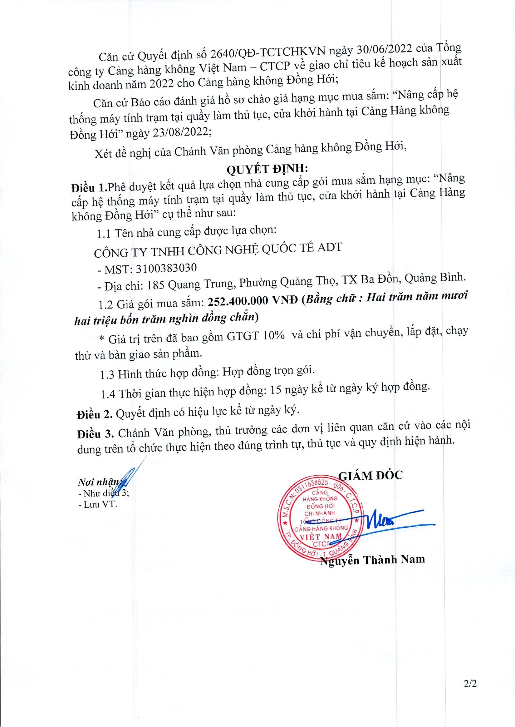 Quyết định V/v phê duyệt kết quả lựa chọn nhà cung cấp gói mua sắm "Nâng cấp hệ thống máy tính trạm tại quầy làm thủ tục, cửa khởi hành tại CHK Đồng Hới"