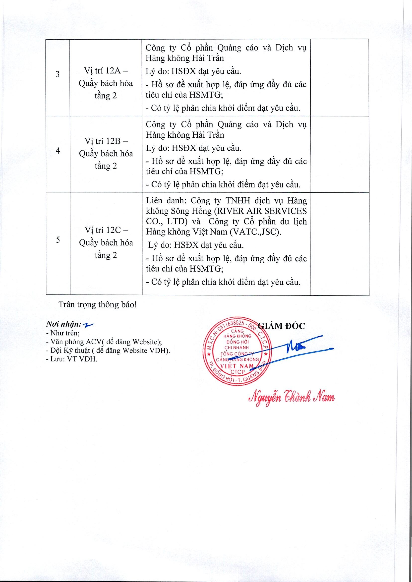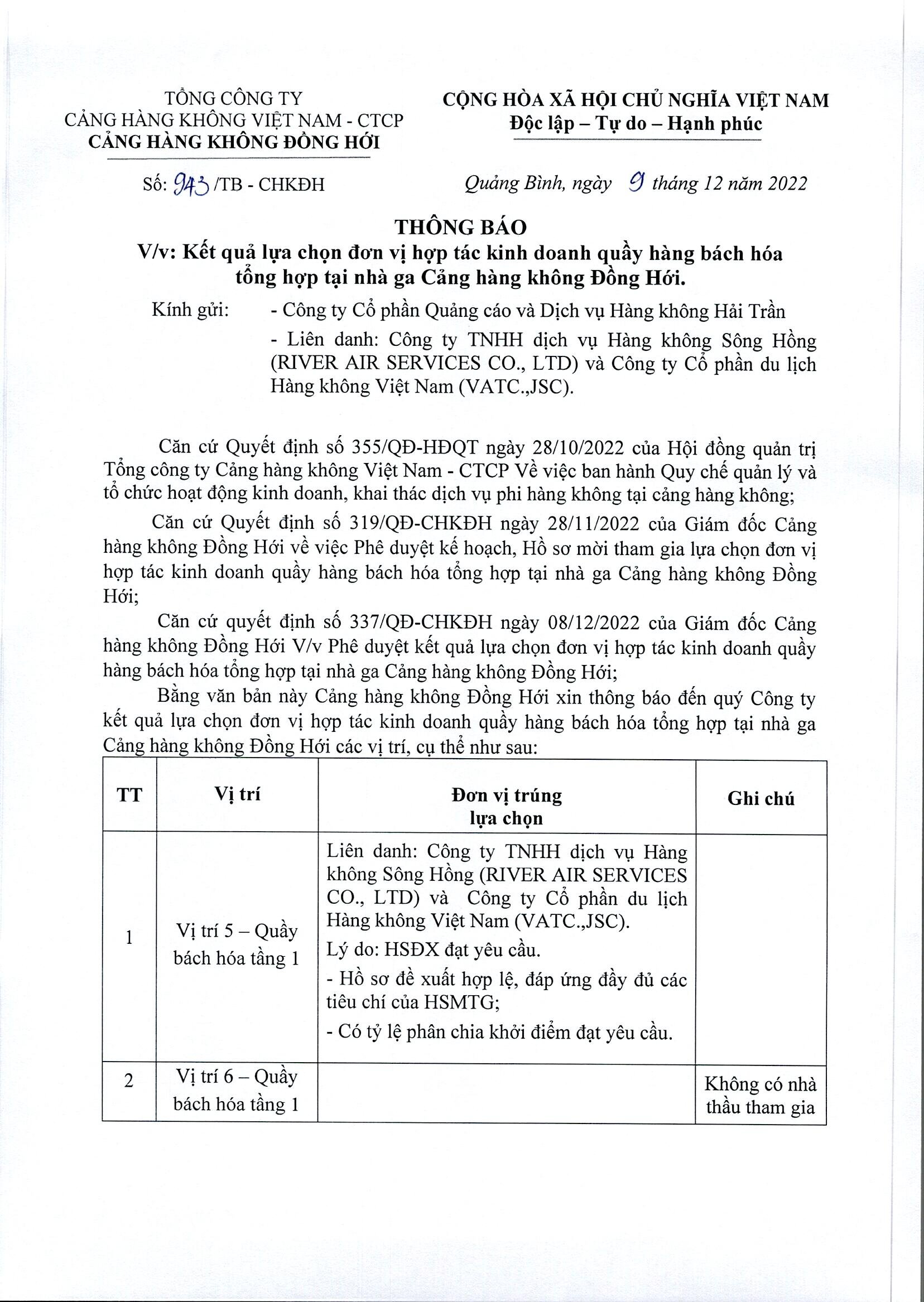 Thông báo V/v: Kết quả lựa chọn đơn vị hợp tác kinh doanh quầy bách hóa tổng hợp tại nhà ga Cảng hàng không Đồng Hới