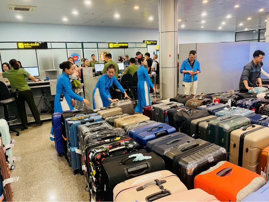 Nhân viên hàng không tận tình sắp xếp hành lý cho hành khách quốc tế đến