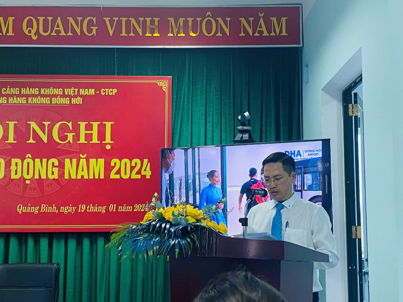 Tại hội nghị đại diện Văn phòng Cảng và Đại diện BCH Công đoàn cơ sở Cảng hàng không Đồng Hới đã trình bày Báo cáo đánh giá kết quả thực hiện nhiệm vụ năm 2023 và phương hướng nhiệm vụ năm 2024 của Cảng hàng không Đồng Hới. Theo đó năm 2023 được sự quan tâm, chỉ đạo sâu sát, kịp thời của thường vụ Đảng ủy TCT và sự nỗ lực cống hiến của tập thể cán bộ nhân viên toàn đơn vị. Cảng hàng không Đồng Hới đã hoàn thành xuất sắc mọi nhiệm vụ sản xuất kinh doanh, đảm bảo an ninh – an toàn tuyệt đối cho hoạt động khai thác, chất lượng dịch vụ được nâng tầm.