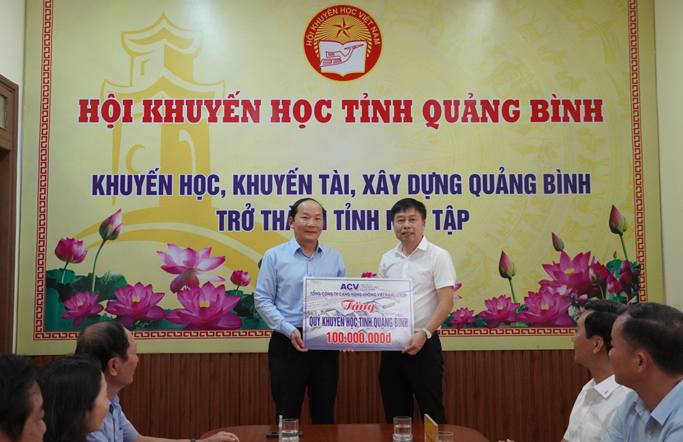 Tại buổi trao và tiếp nhận, đại diện lãnh đạo Ban Quản lý Dự án "Xây dựng nhà ga hành khách T2 và mở rộng sân đỗ máy bay - Cảng Hàng không Đồng Hới" đã trao Biển tượng trưng tặng 100.000.000 đồng ủng hộ Quỹ Khuyến học của Hội Khuyến học tỉnh.