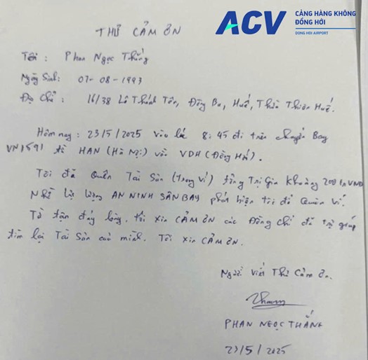 Thư cảm ơn của hành khách sau khi được trao trả tài sản
