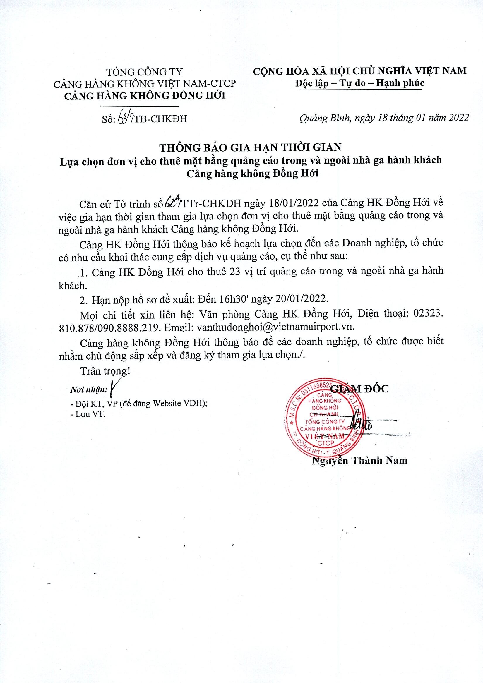 Thông báo gia hạn: Lựa chọn đơn vị cho thuê mặt bằng quảng cáo trong và ngoài nhà ga hành khách Cảng hàng không Đồng Hới