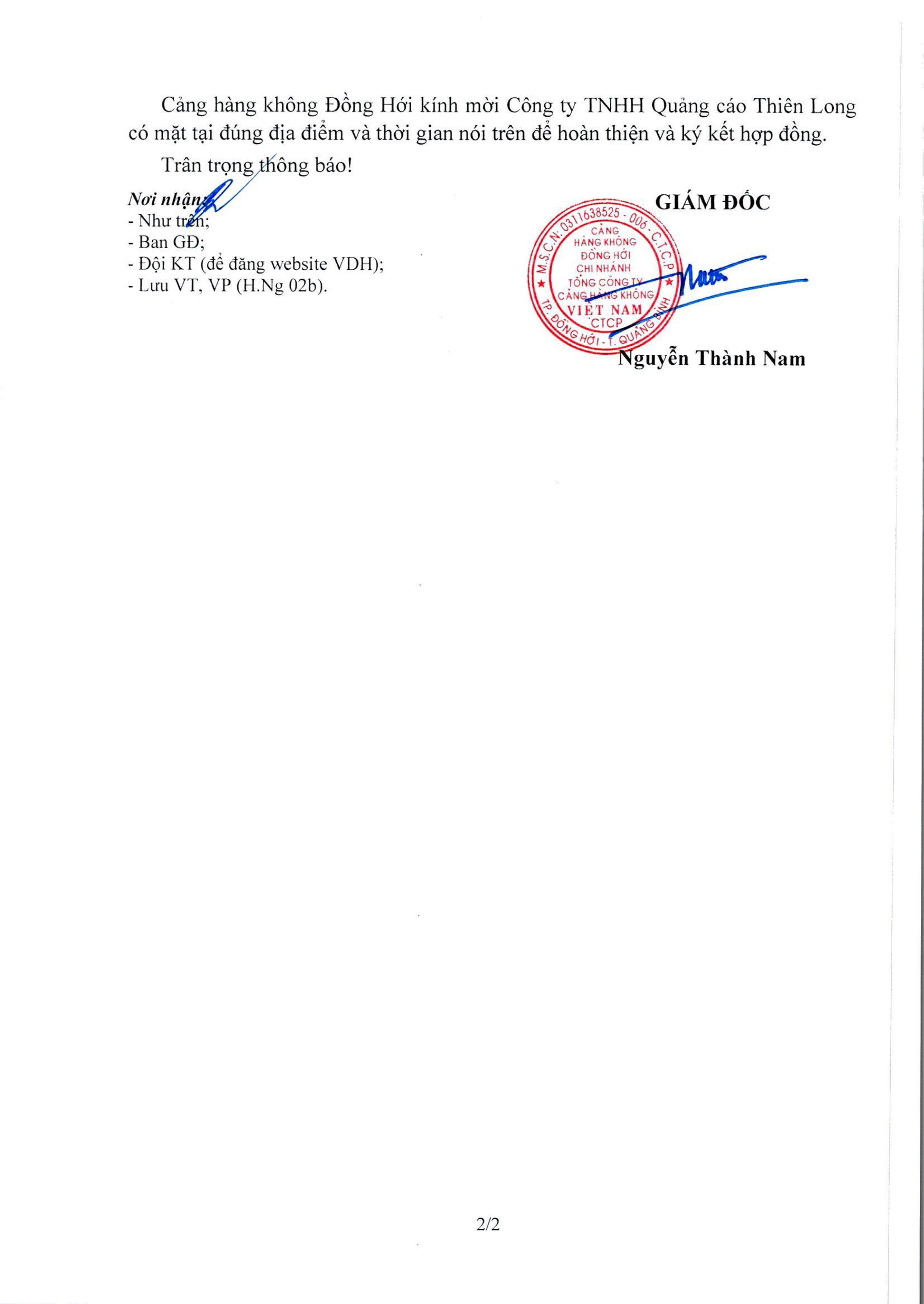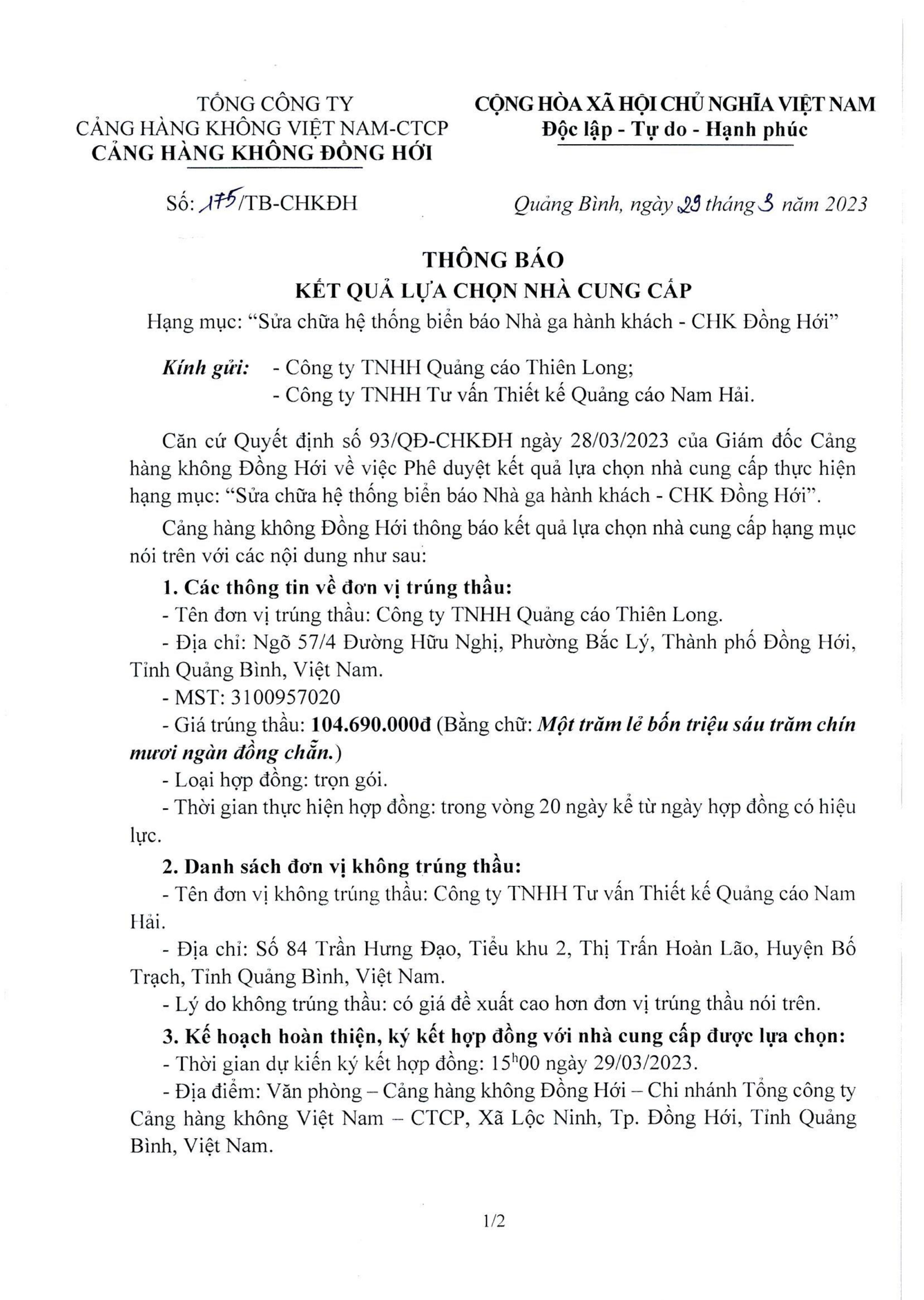 Thông báo kết quả lựa chọn nhà cung cấp hạng mục: "Sửa chữa hệ thống biển báo Nhà ga hành khách - CHK Đồng Hới"