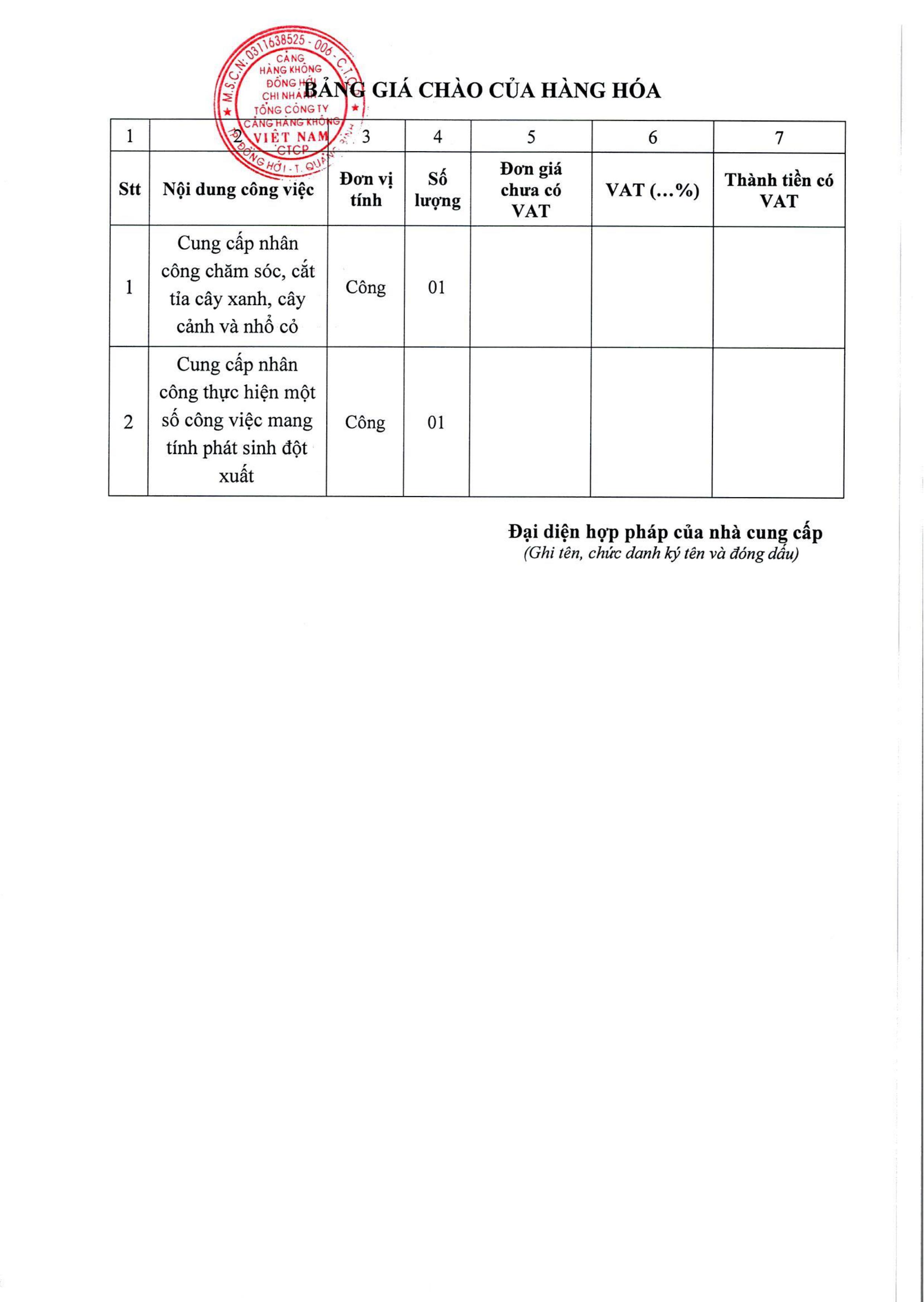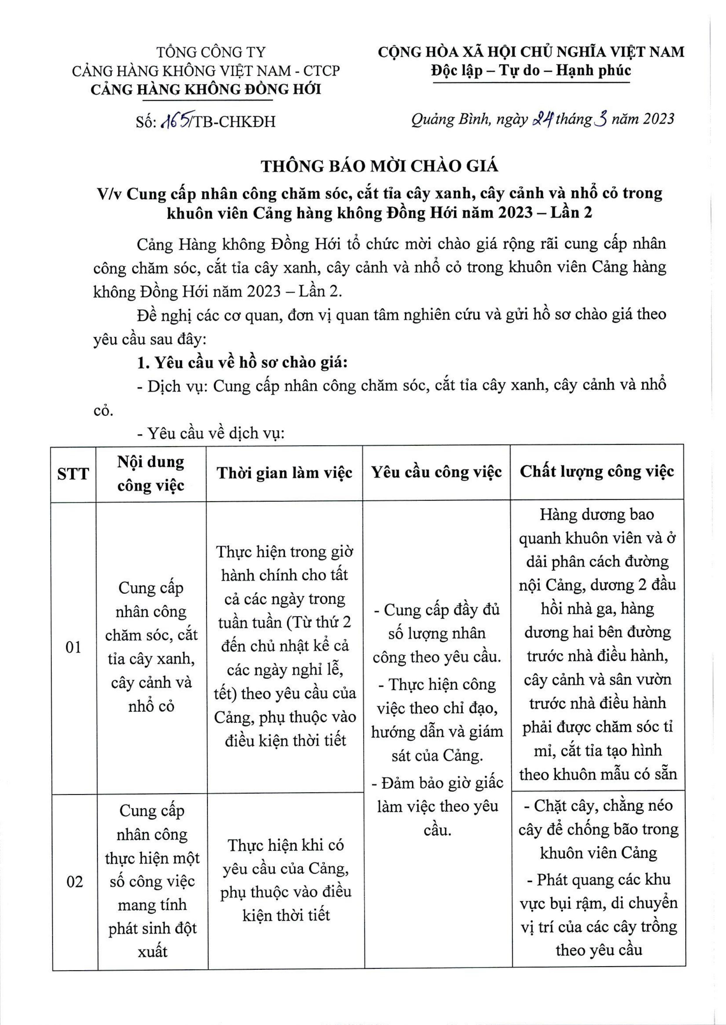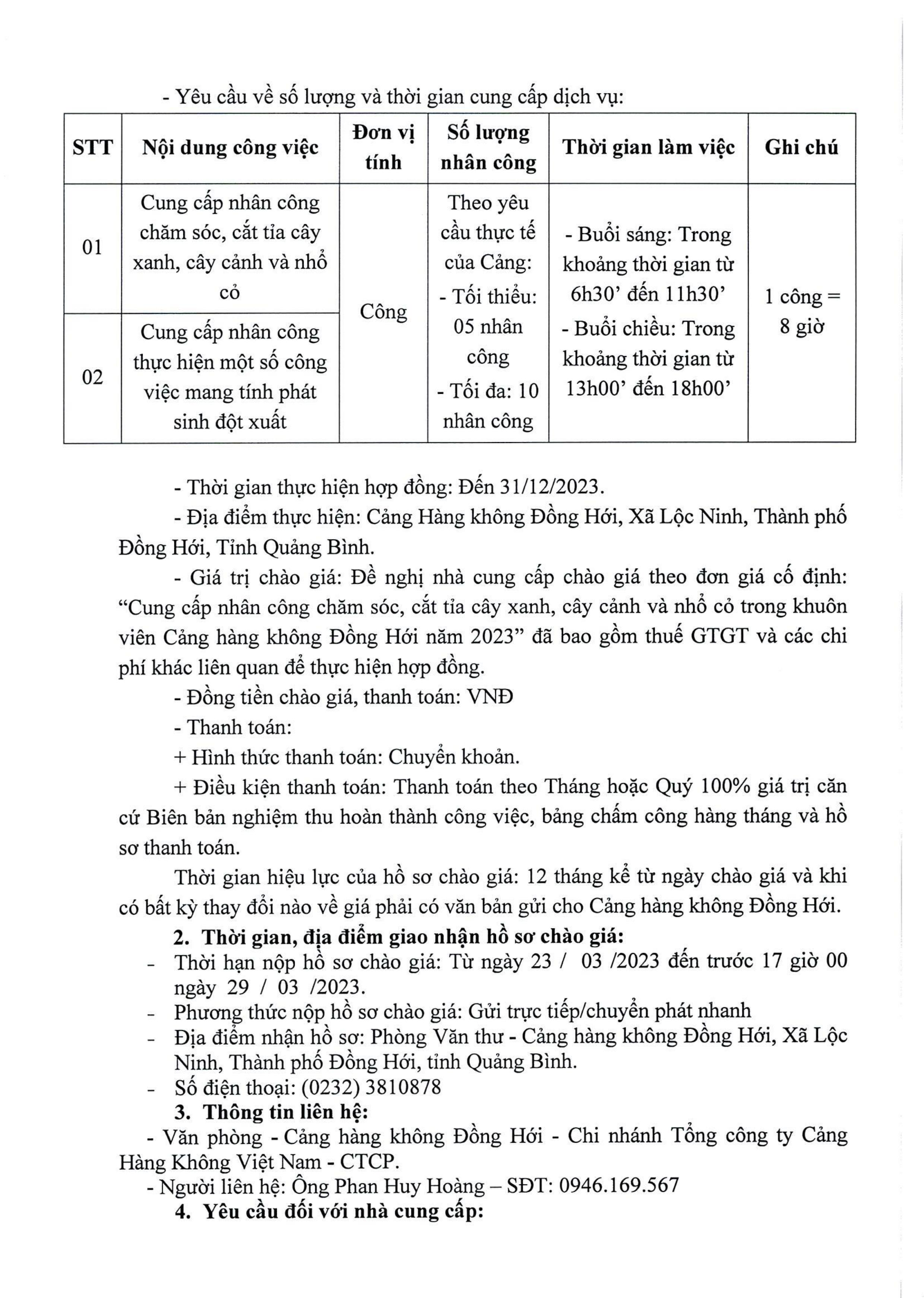 Thông báo mời chào giá: " Cung cấp nhân công chăm sóc, cắt tỉa cây xanh và nhổ cỏ trong khuôn viên Cảng hàng không Đồng Hới năm 2023 - Lần 2"