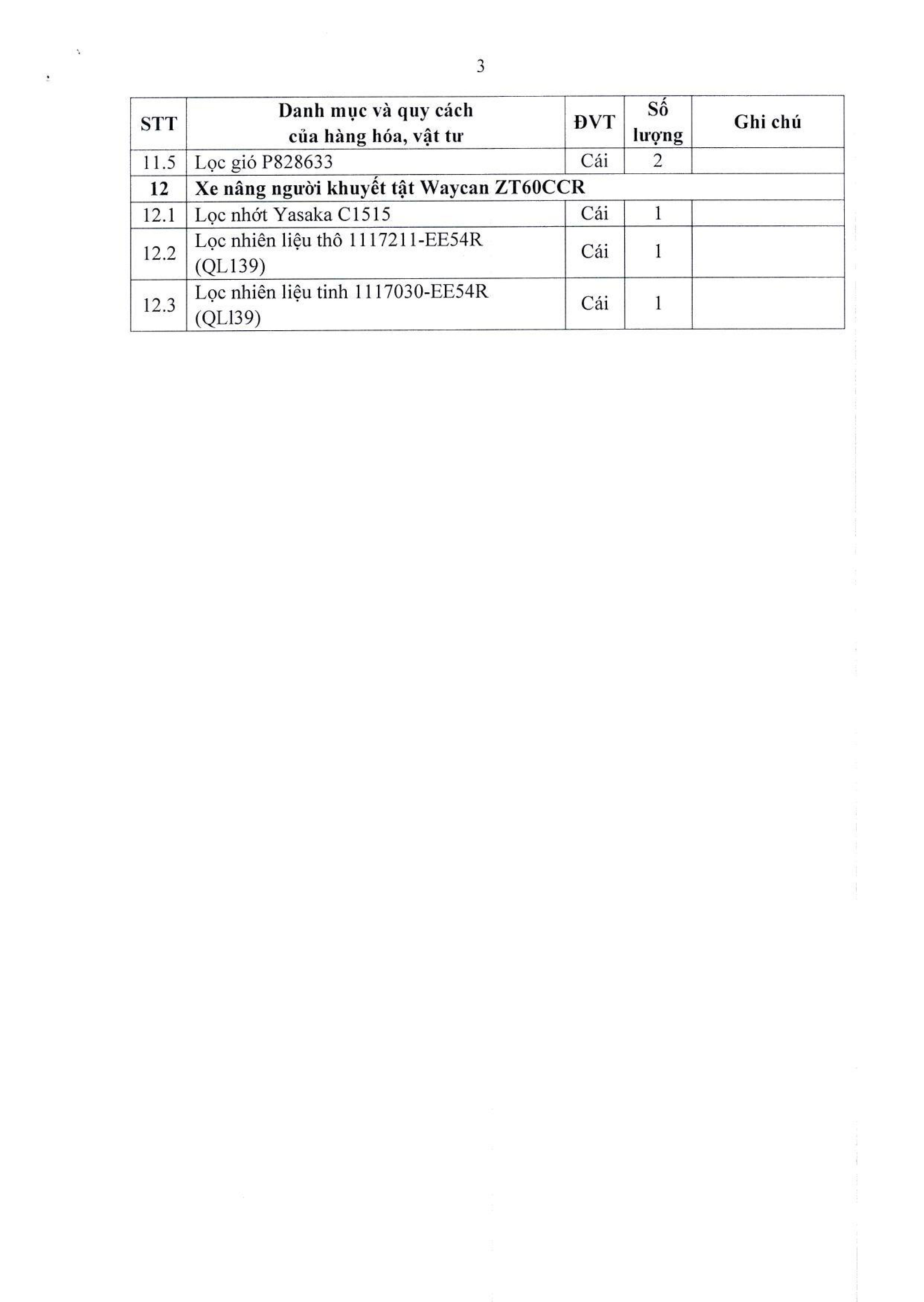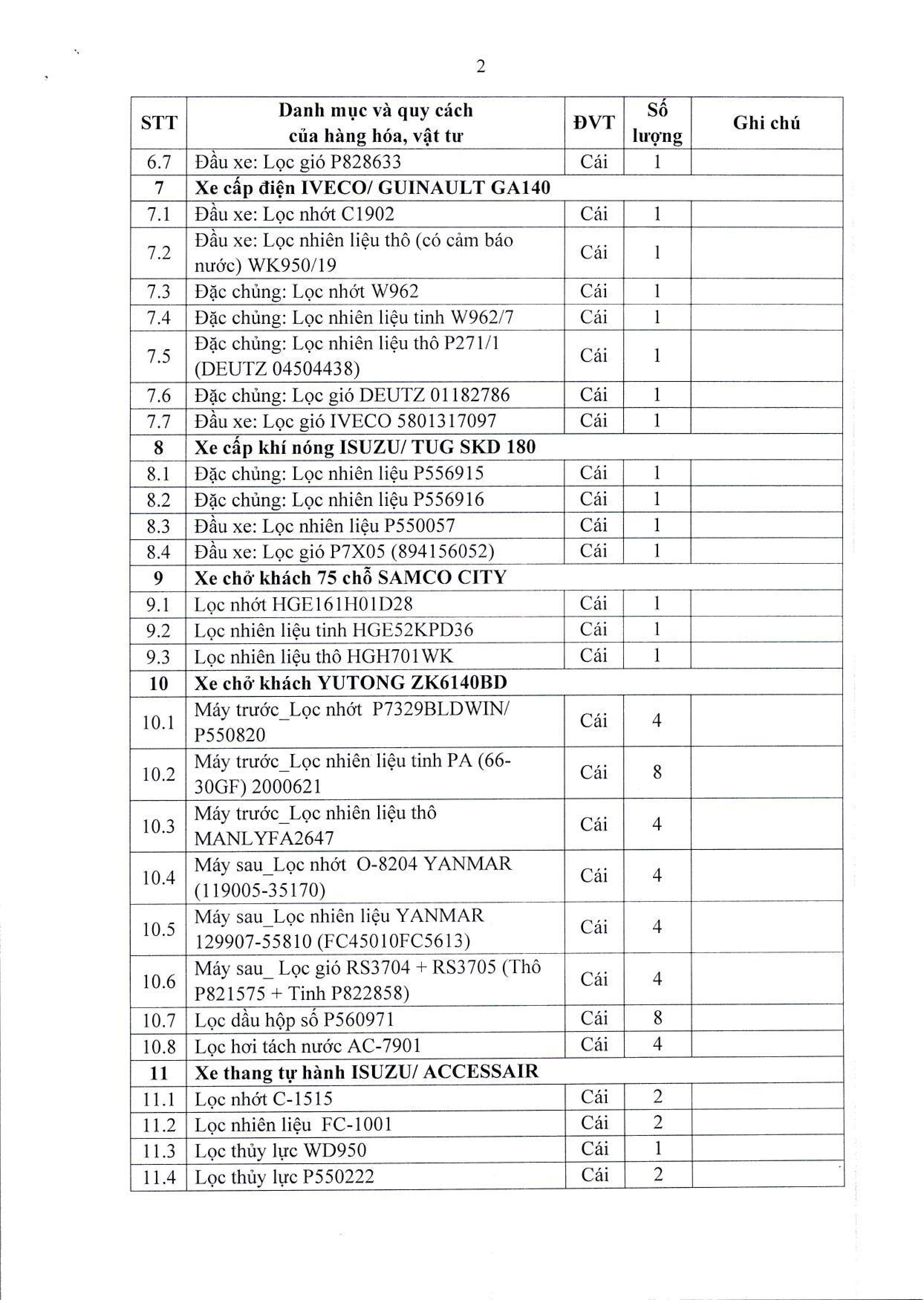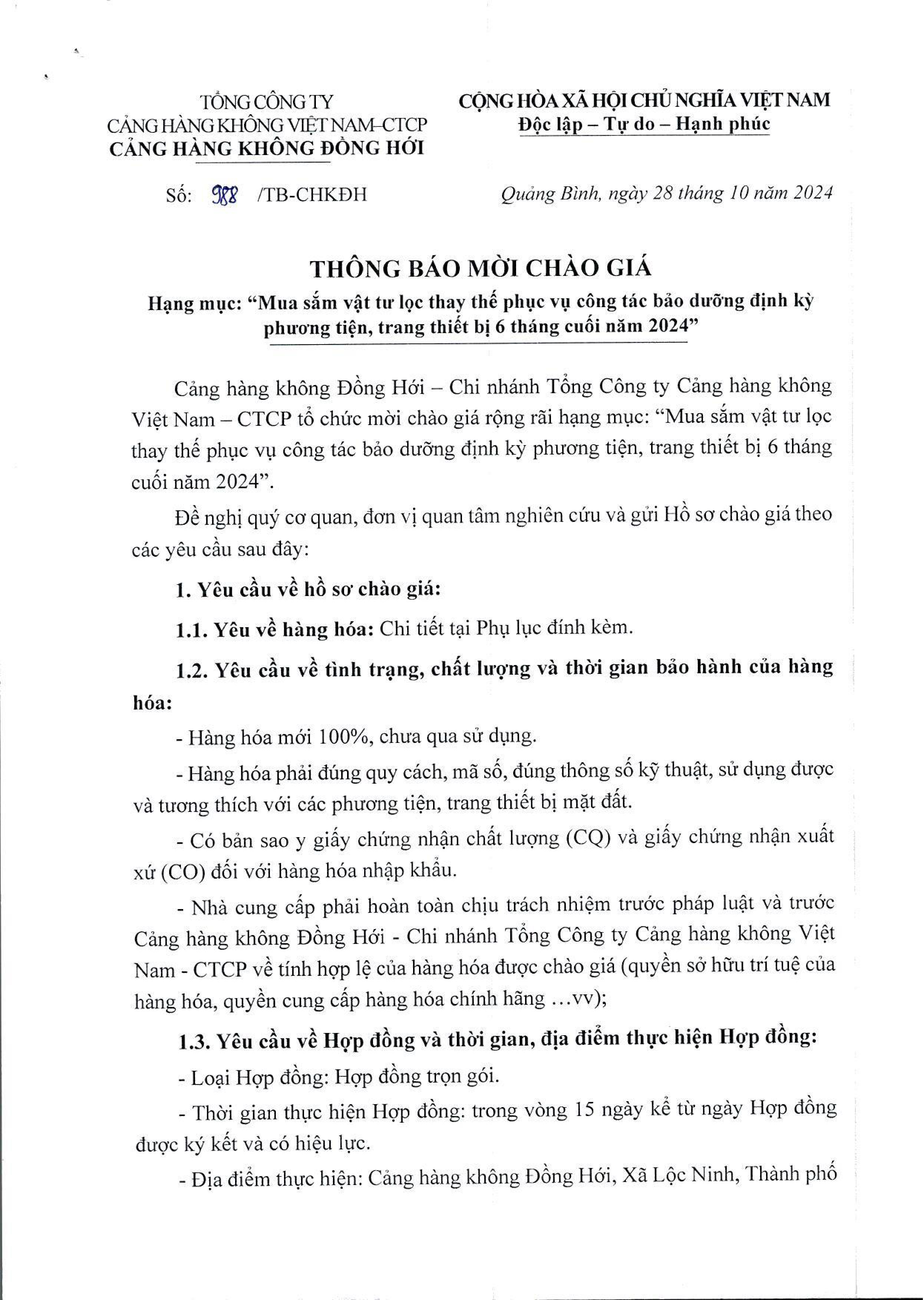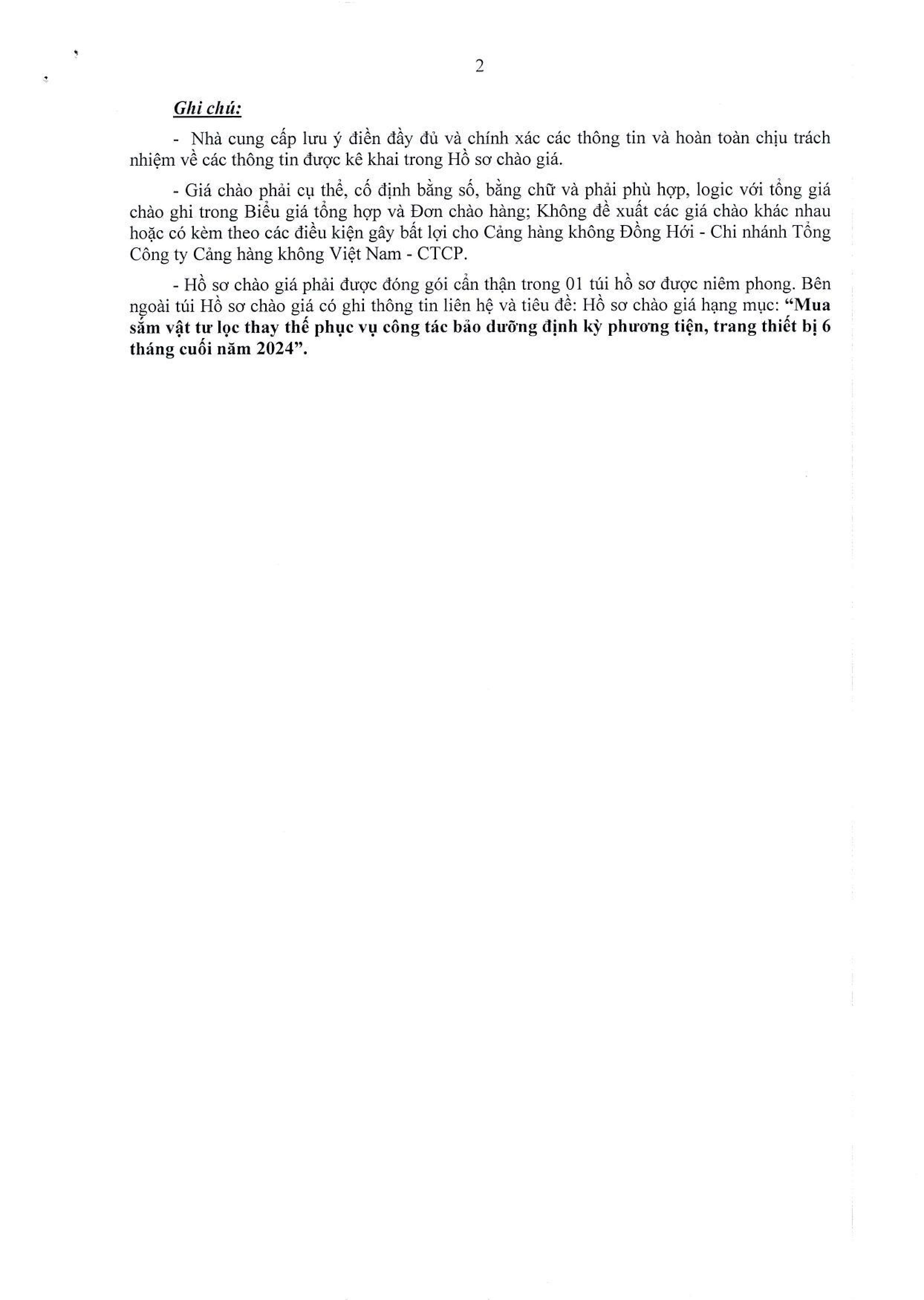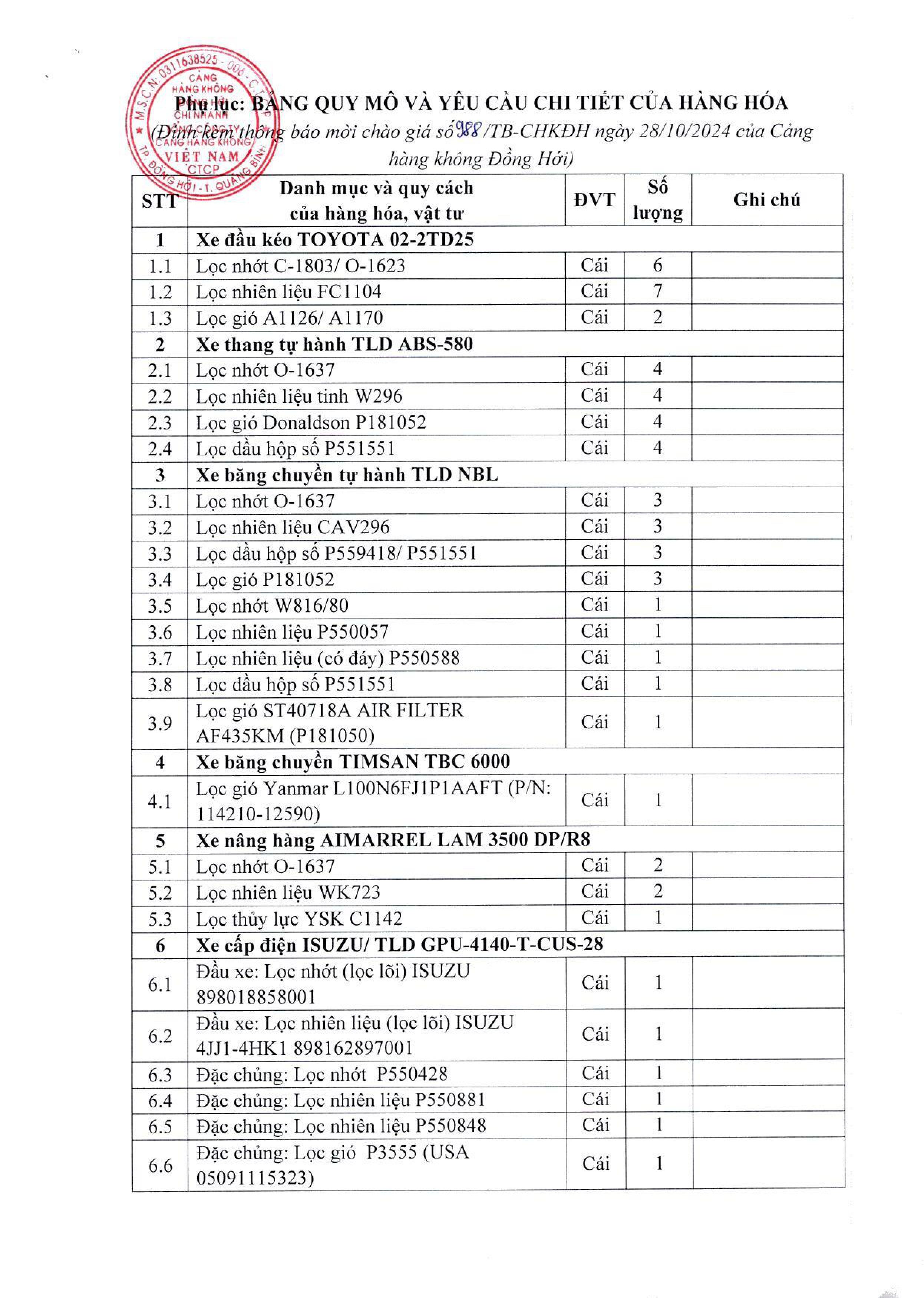 THÔNG BÁO MỜI CHÀO GIÁ Hạng mục: " Mua sắm vật tư lọc thay thế phục vụ công tác bảo dưỡng định kỳ phương tiện, trang thiết bị 6 tháng cuối năm 2024"