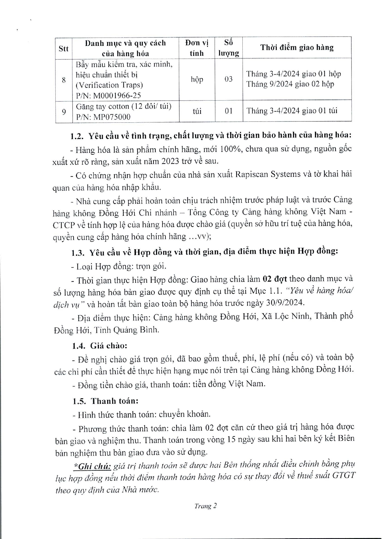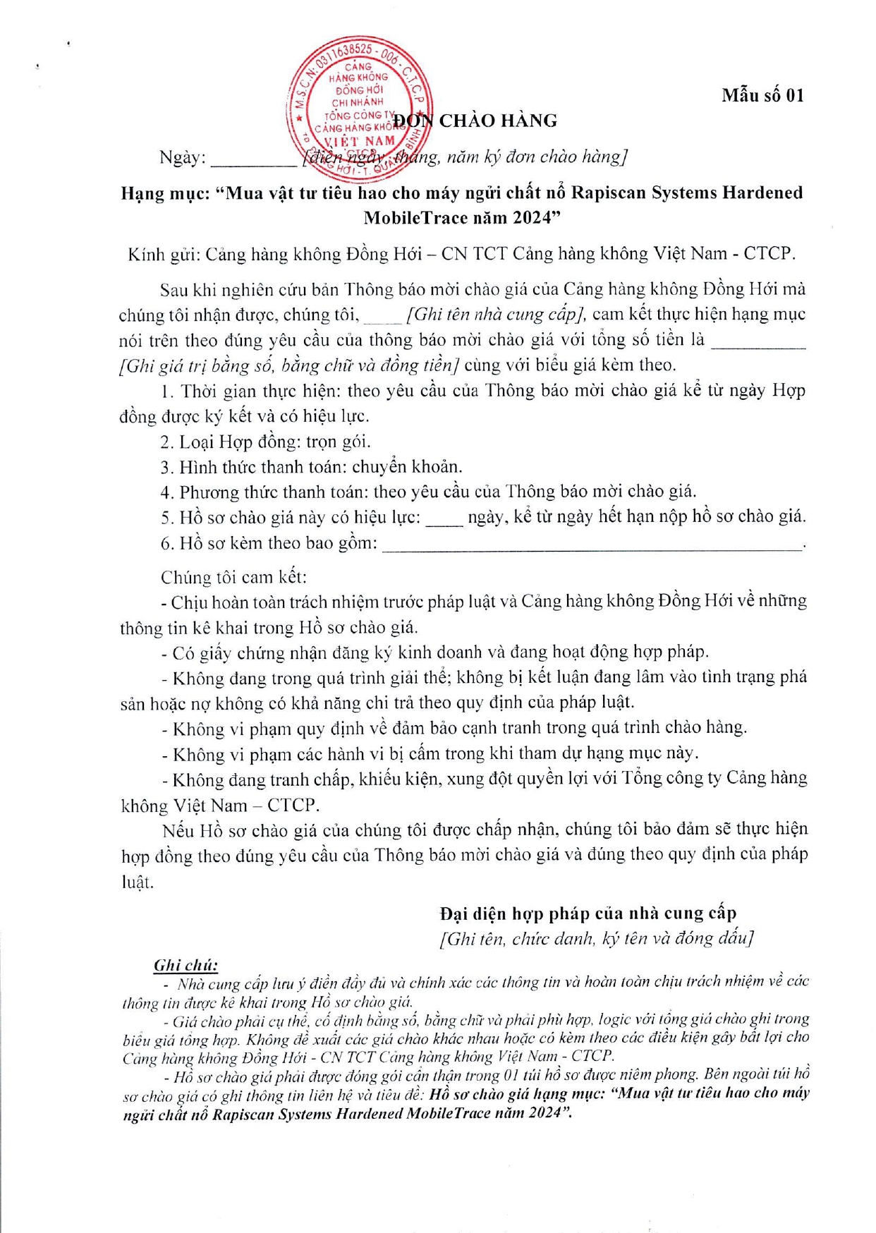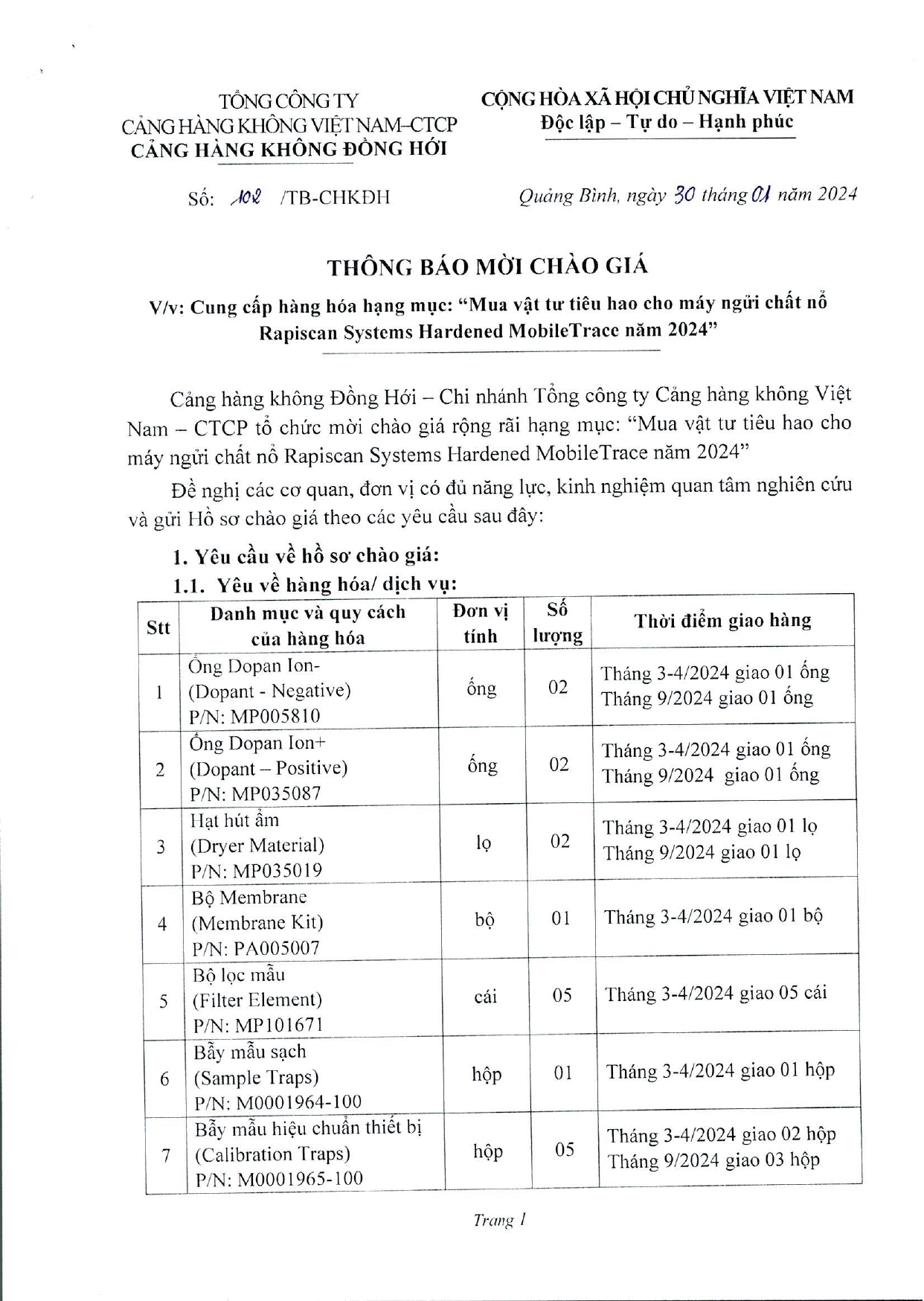 THÔNG BÁO MỜI CHÀO GIÁ " V/v Cung cấp hàng hóa hạng mục : Mua vật tư tiêu hao cho máy ngửi chất nổ Rapiscan Systems Hardened MobieTrace năm 2024 "