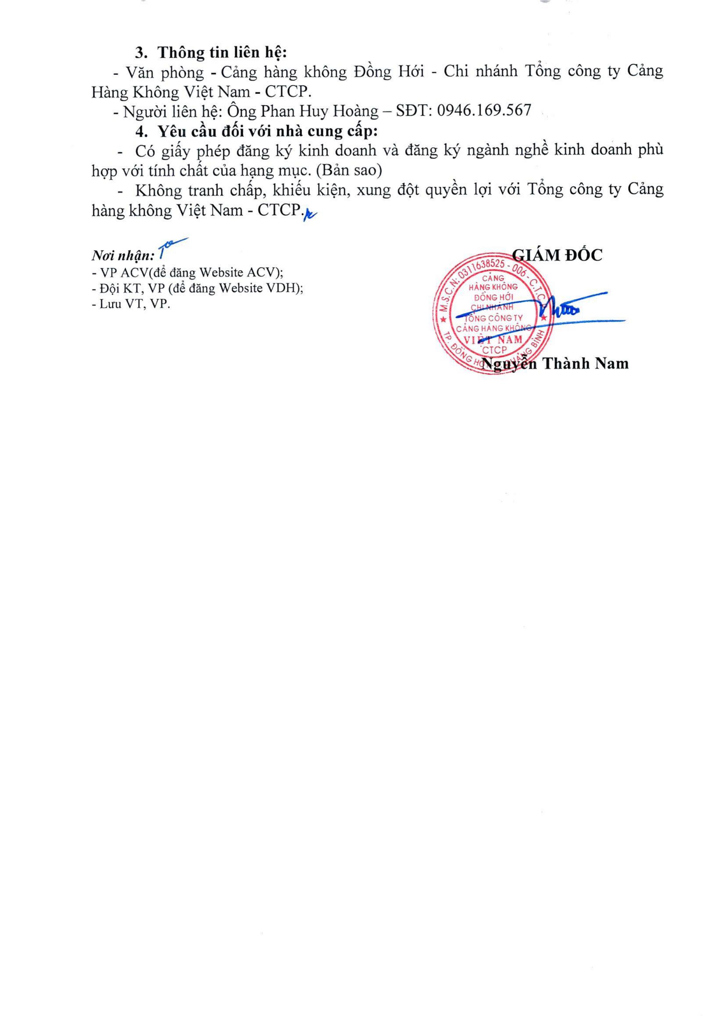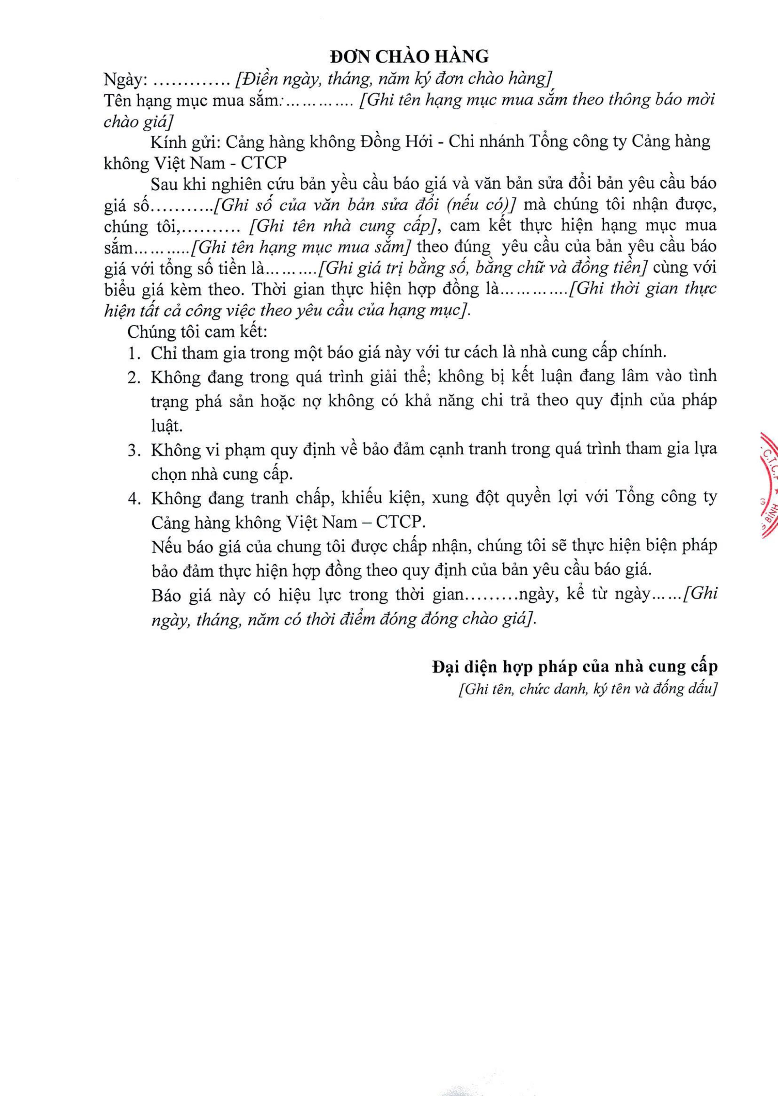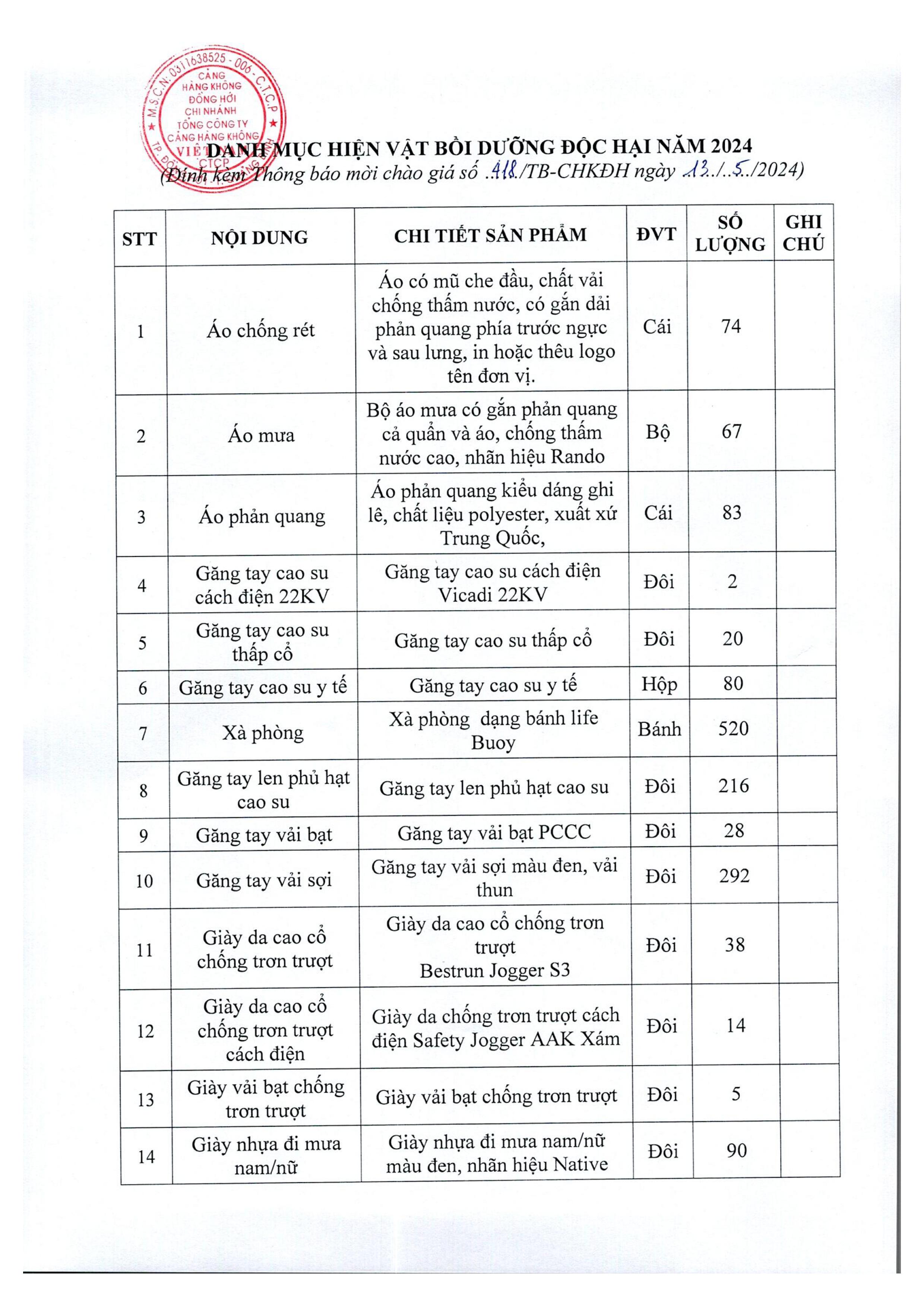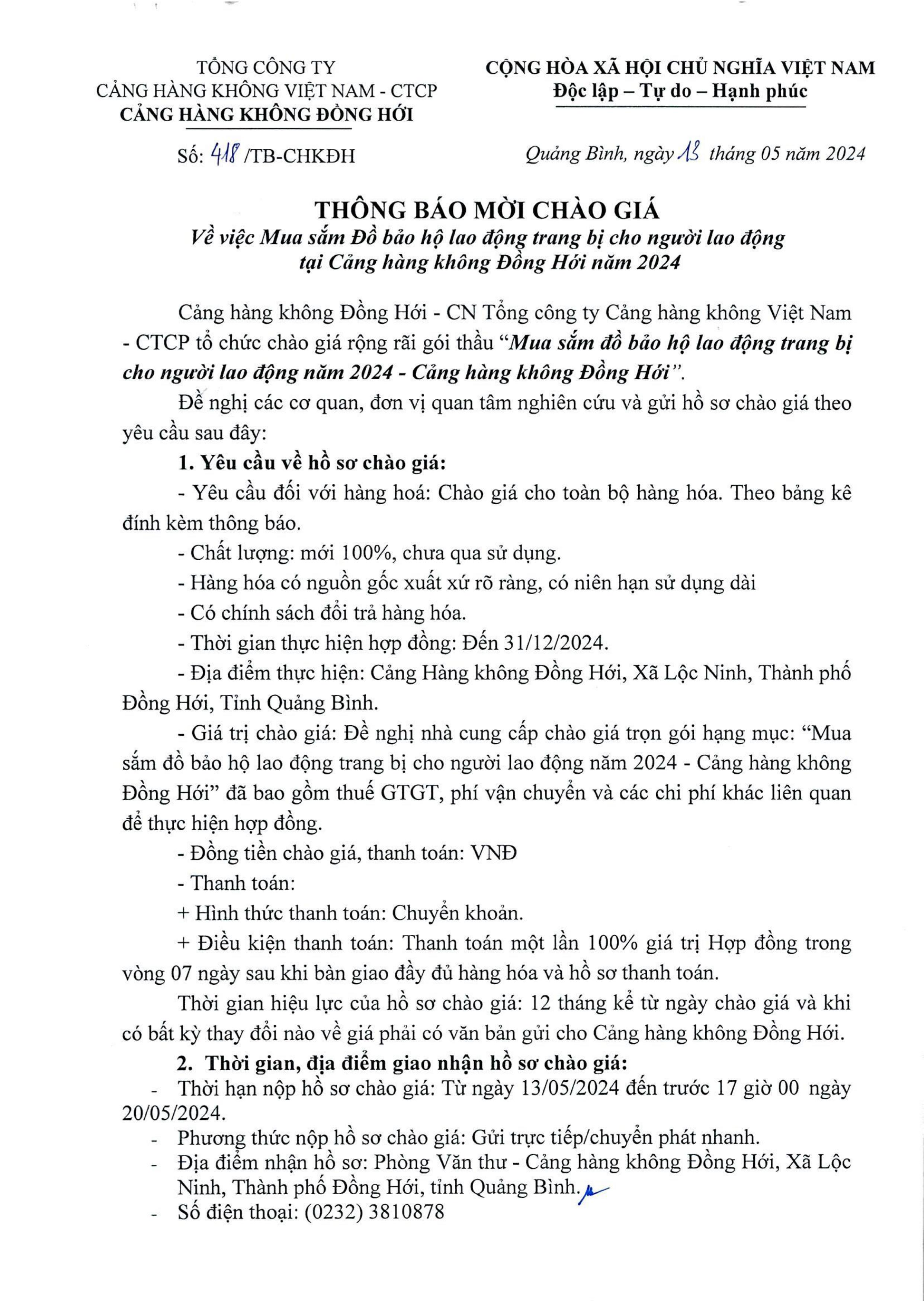 THÔNG BÁO MỜI CHÀO GIÁ " V/v Mua sắm đồ bảo hộ lao động trang bị cho người lao động tại Cảng hàng không Đồng Hới năm 2024"