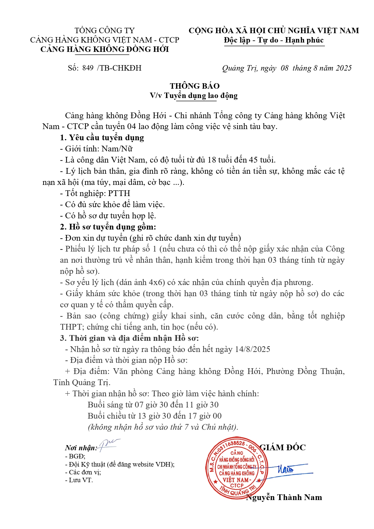 THÔNG BÁO V/v Tuyển dụng lao động thuê ngoài