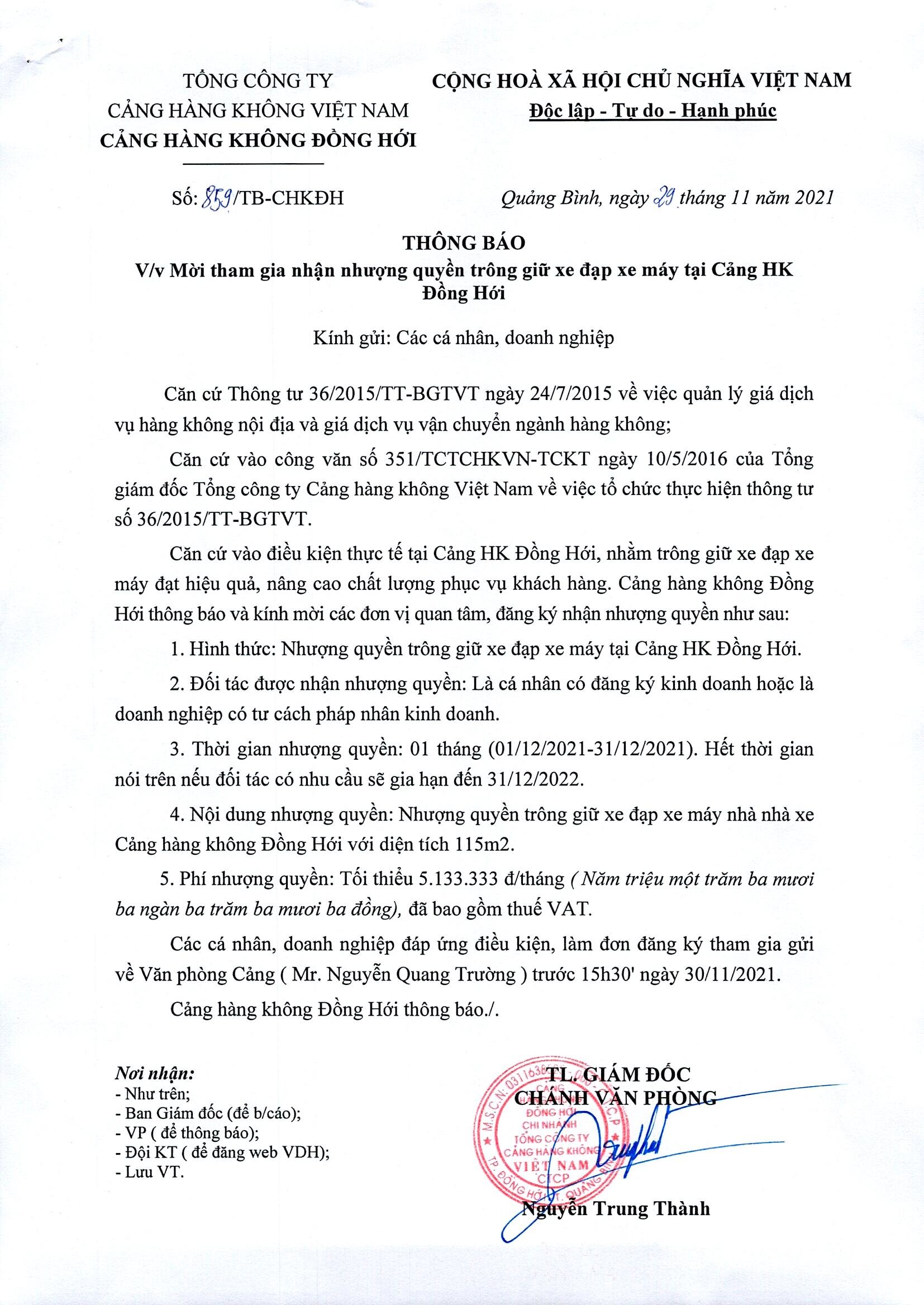 THÔNG BÁO: v/v Mời tham gia nhận nhượng quyền trông giữ xe đạp xe máy tại Cảng HK Đồng Hới