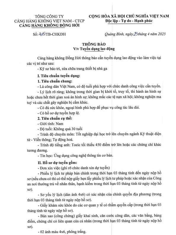 THÔNG BÁO V/v Tuyển dụng lao động thuê ngoài