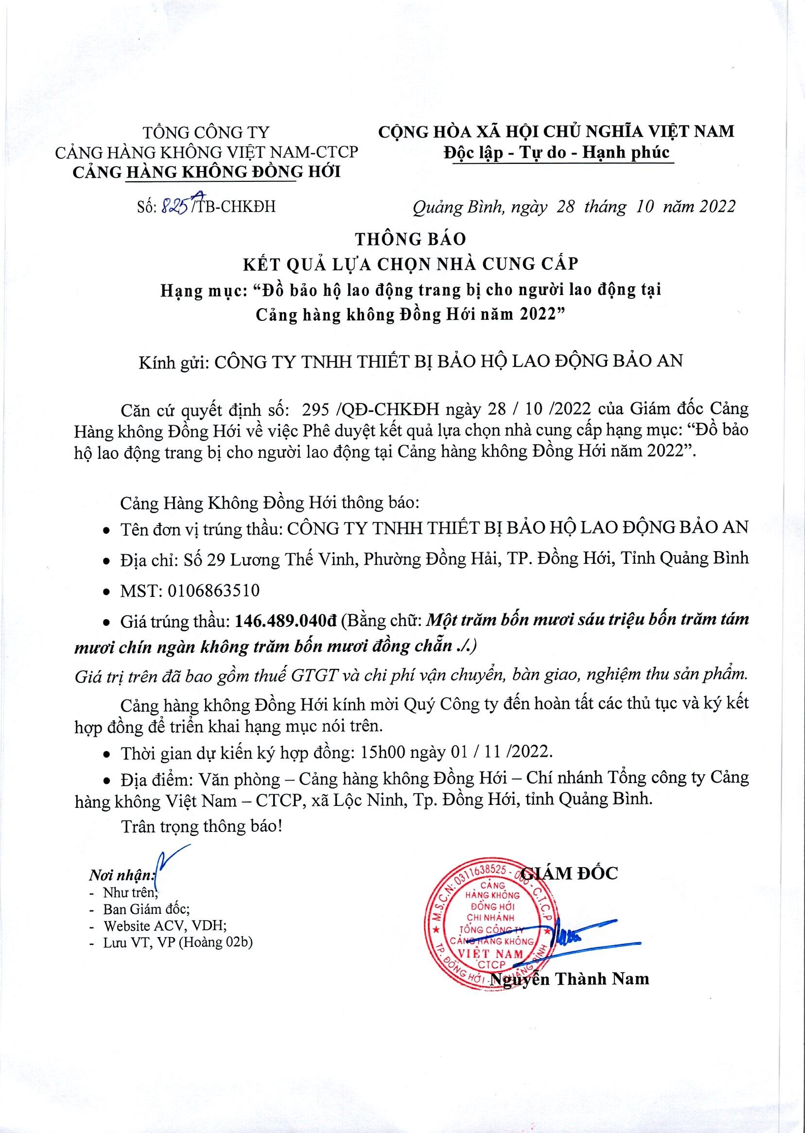 THÔNG BÁO KẾT QUẢ LỰA CHỌN NHÀ CUNG CẤP ĐỒ BẢO HỘ LAO ĐỘNG