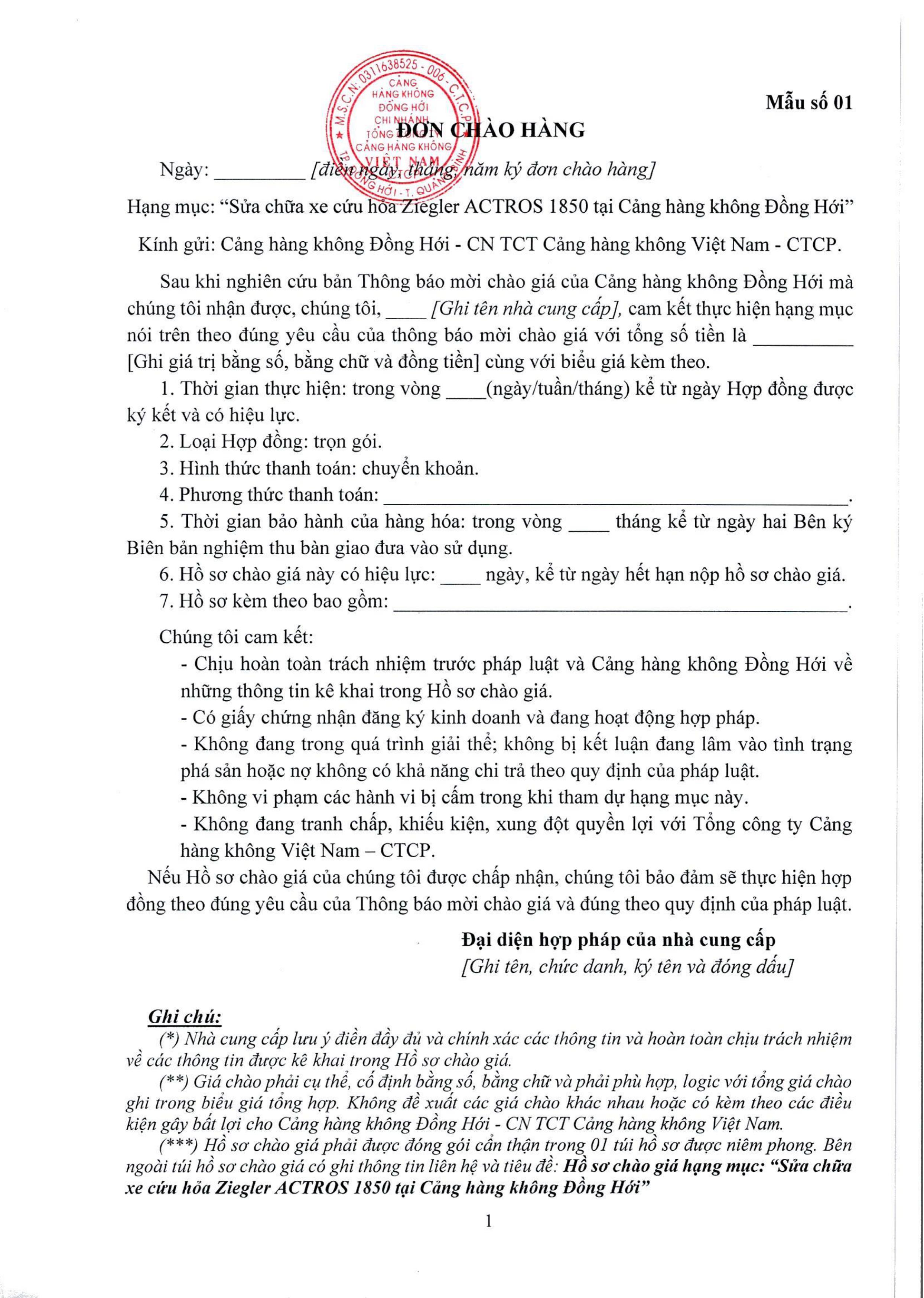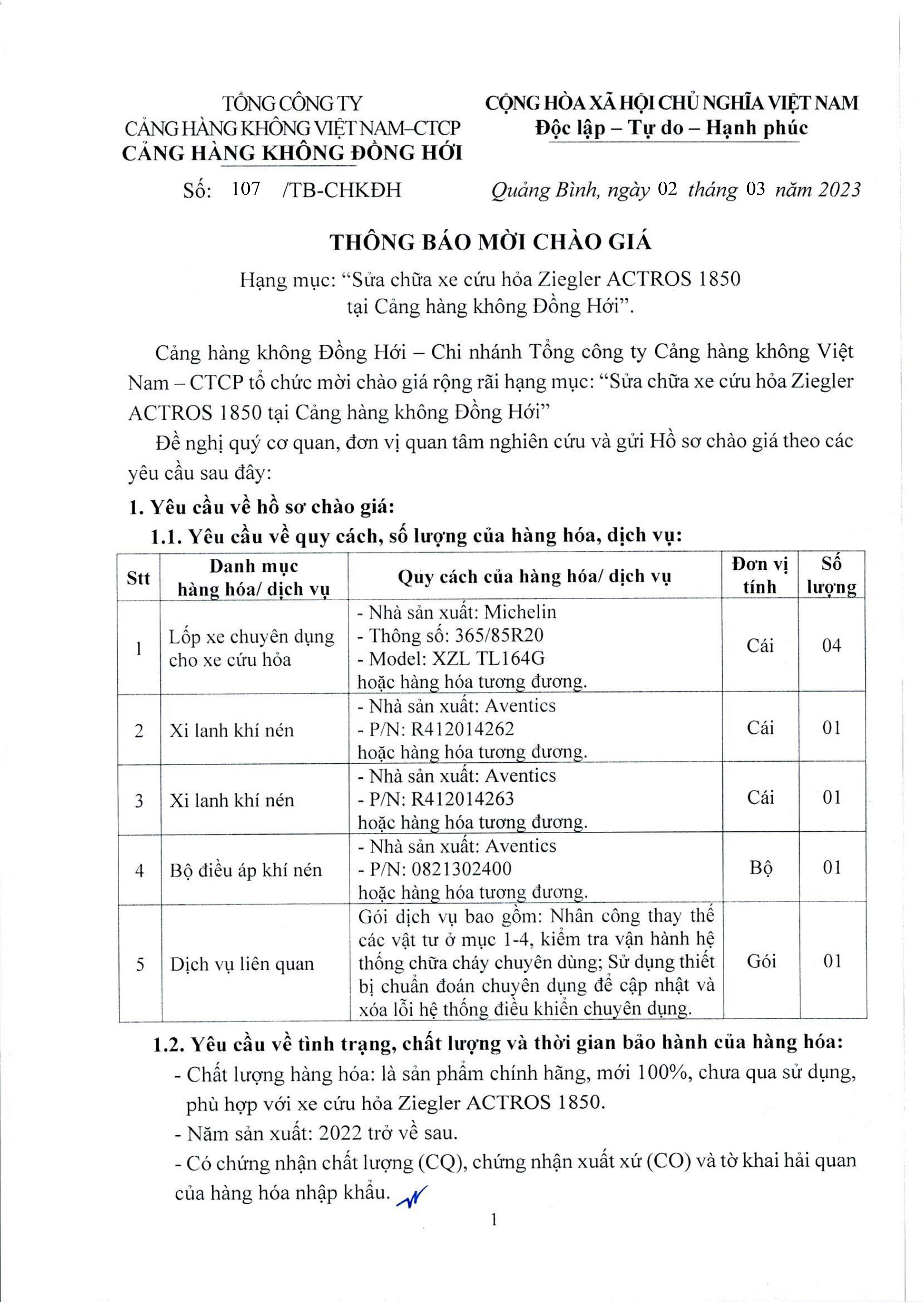 Thông báo mời chào giá "Sửa chữa xe cứu hỏa Ziegler ACTROS 1850 tại Cảng hàng không Đồng Hới"