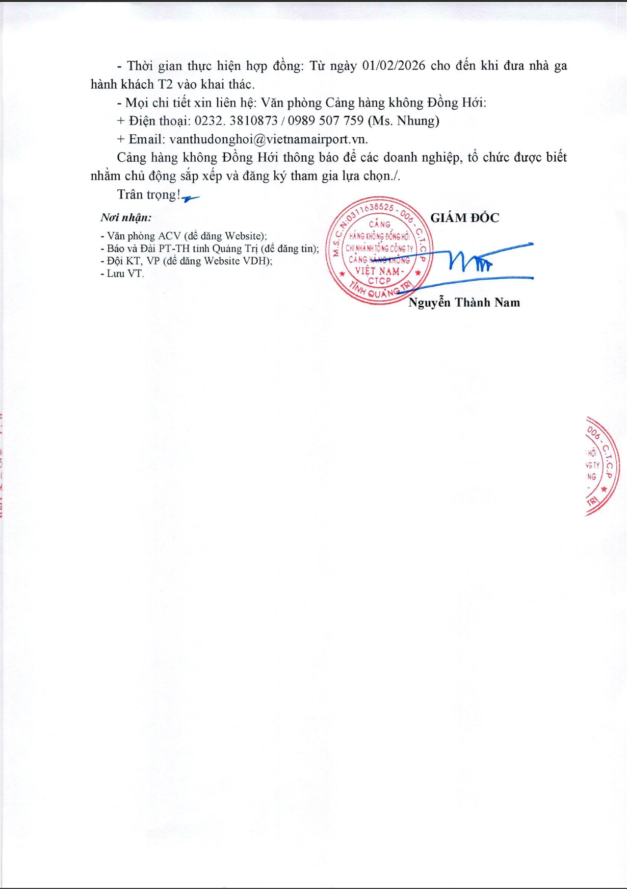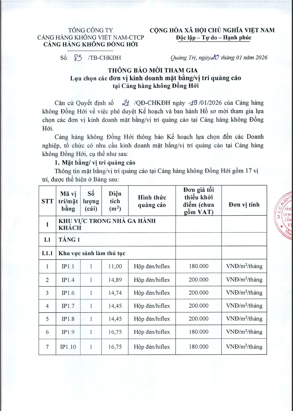 THÔNG BÁO MỜI THAM GIA Lựa chọn các đơn vị kinh doanh mặt bằng/vị trí quảng cáo tại Cảng hàng không Đồng Hới