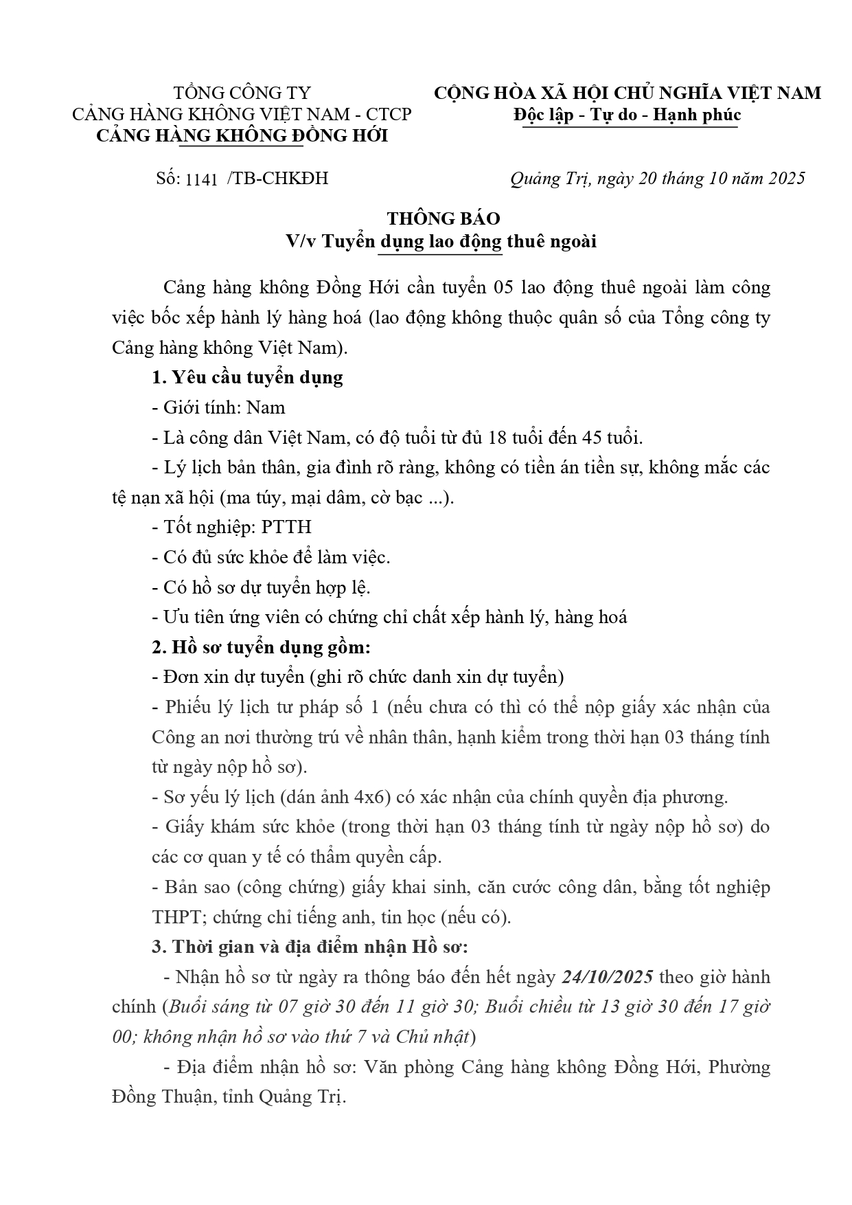 THÔNG BÁO V/v Tuyển dụng lao động thuê ngoài
