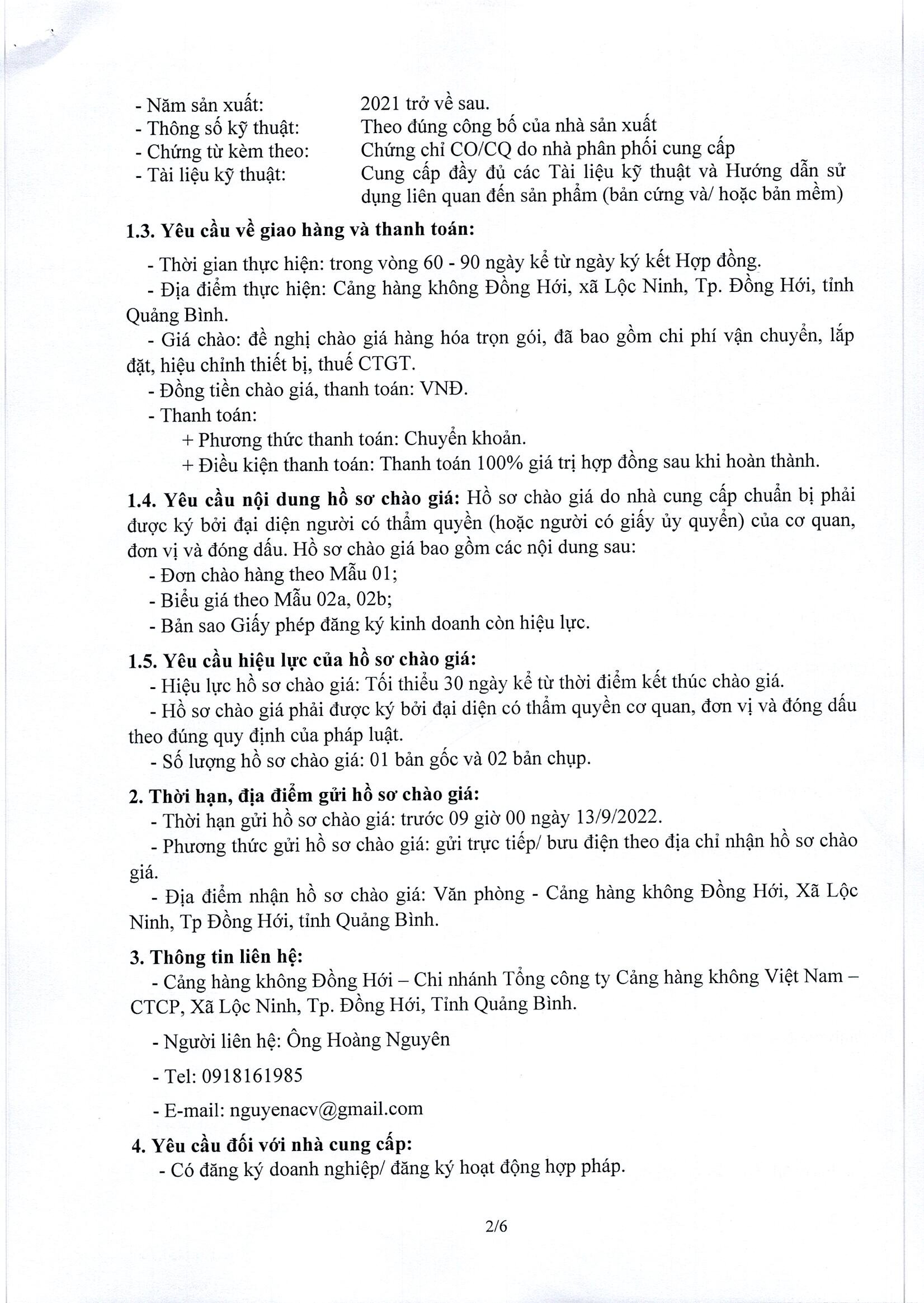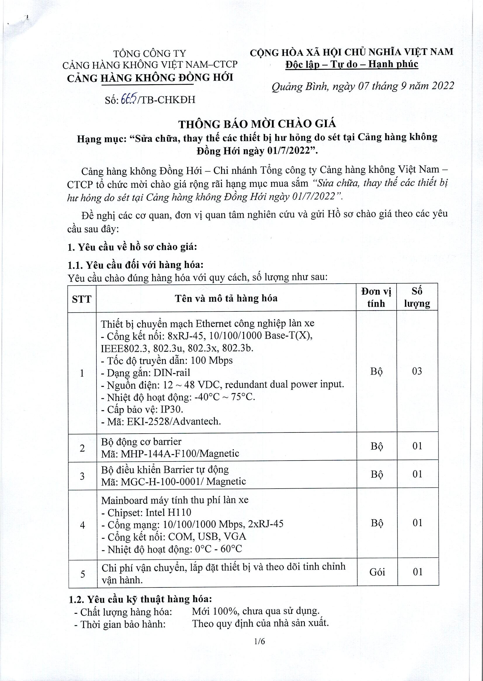 Thông báo hàng mời chào giá: Hạng mục "Sữa chửa, thay thế các thiết bị hư hổng do sét tại Cảng hàng không Đồng Hới ngày 1/7/2022"
