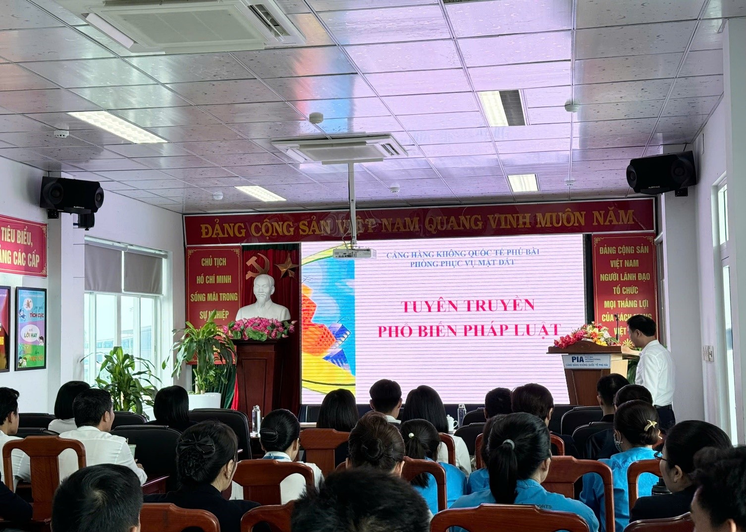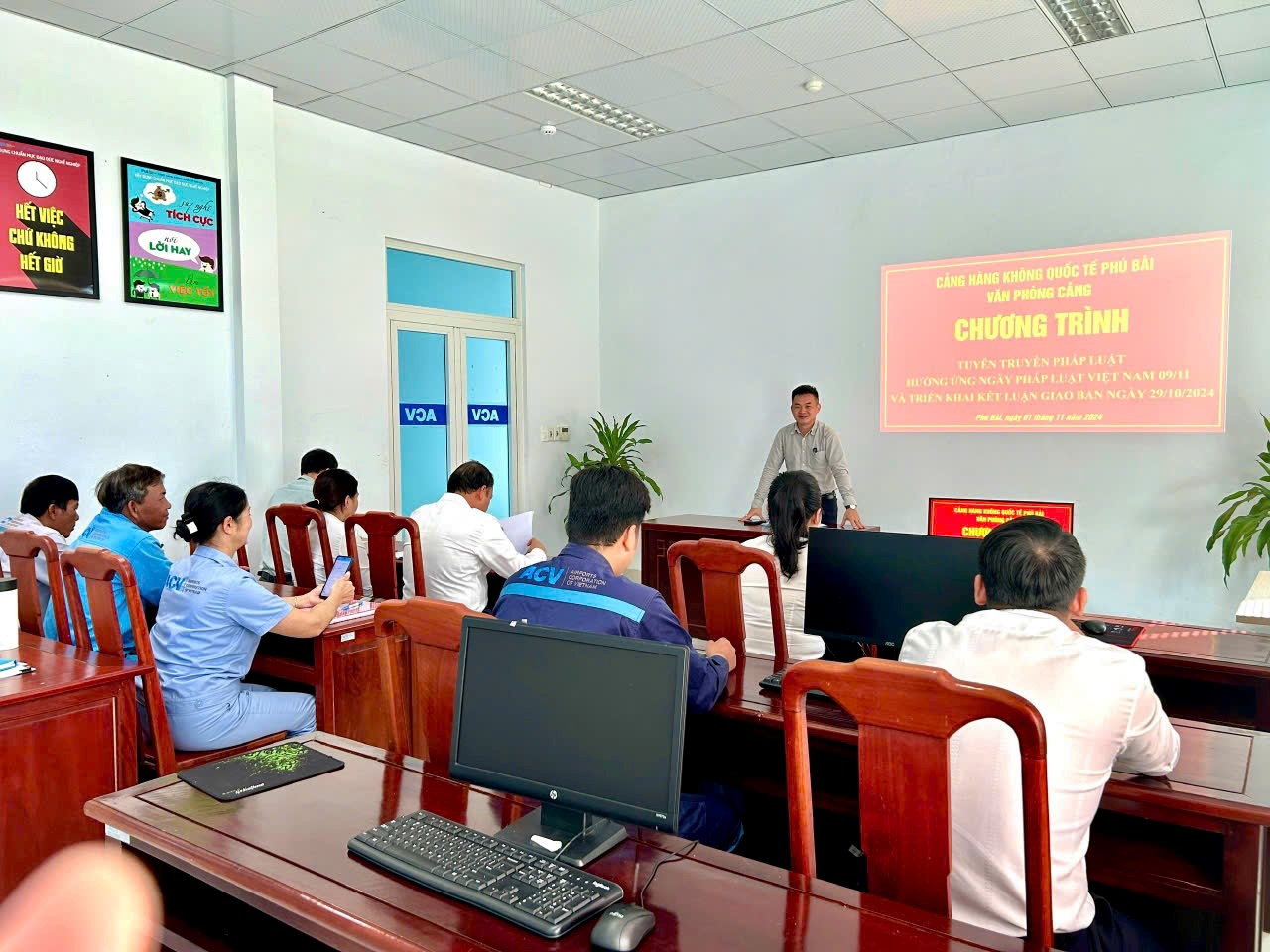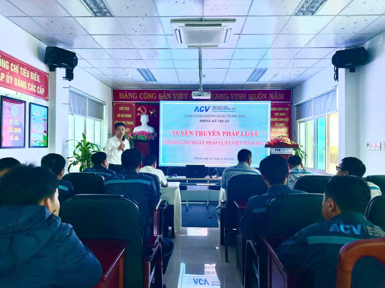 Thực hiện Chỉ thị 457/CT-HĐQT ngày 10/10/2024 của Chủ tịch Hội đồng quản trị Tổng công ty Cảng hàng không Việt Nam-CTCP về việc tuyên truyển, phổ biến giáo dục Pháp luật và Hưởng ứng Ngày pháp luật Việt Nam 9/11. Nhằm cụ thể Hoạt động tuyên truyền hưởng ứng về Ngày Pháp luật Việt Nam. Ngày 18/10/2024, Cảng hàng không quốc tế Phú Bài tổ chức xây dựng Kế hoạch số 1075/KH-CHKQTPB phân công trách nhiệm cụ thể cho các phòng trực thuộc để triển khai thực hiện, đã tổ chức nhiều cuộc tuyên truyền với hình thức phong phú, đa dạng.