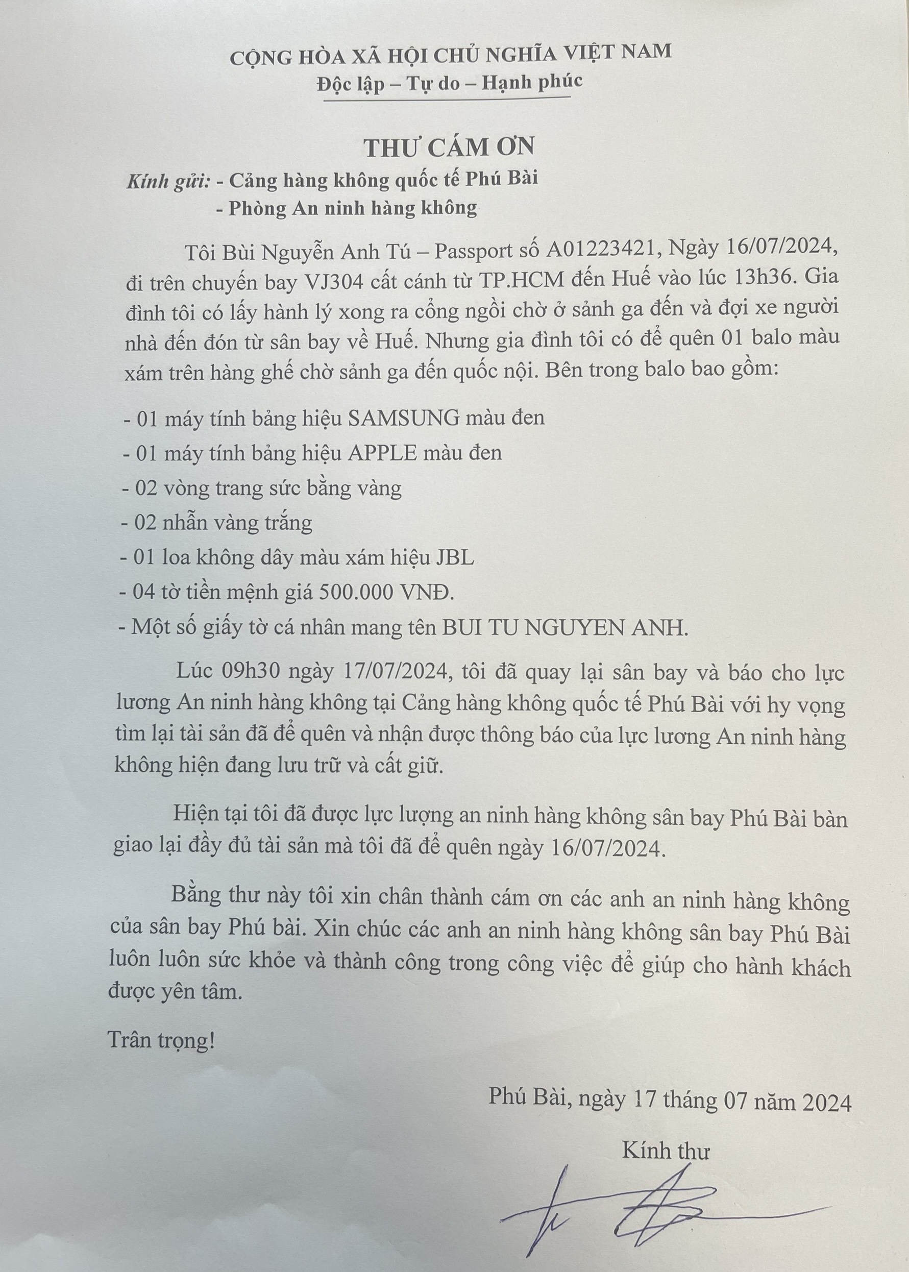 Vào lúc 13h50 ngày 16/7/2024, trong quá tuần tra bảo đảm an ninh hàng không, an ninh trật tự tại Cảng HKQT Phú Bài, lực lượng An ninh Cơ động phát hiện 01 Balo màu xám tại sảnh ga đến nhà ga hành khách T2, lực lượng An ninh Cơ động tiến hành kiểm tra, phát hiện bên trong có 01 máy tính bảng hiệu SAMSUNG, 01 máy tính bảng hiệu APPLE, 02 vòng trang sức bằng vàng, 02 nhẫn vàng trắng, 01 loa không dây hiệu JBL, 04 tờ tiền mệnh giá 500.000 VNĐ (tổng tài sản trên 50.000.000 VNĐ). Ngay lập tức tổ chức xác minh đã tìm được chủ nhân là anh Bùi Nguyễn Anh Tú đi trên chuyến bay VJ304 (từ TP.HCM đến Huế vào lúc 13h36 ngày 16/7/2024) và tiến hành trao trả toàn bộ tài sản lại cho hành khách.