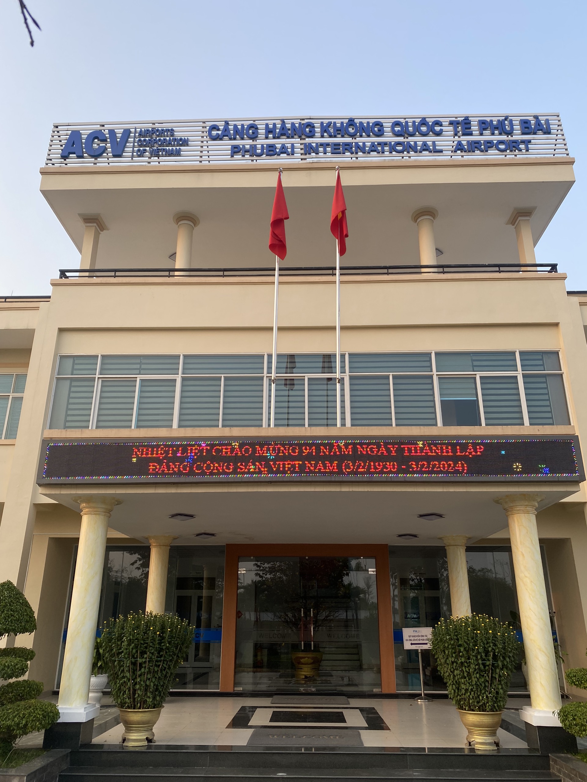 Cảng hàng không quốc tế Phú Bài lung linh, rực rỡ sắc màu bởi các cụm đèn trang trí, màn hình Led tuyên truyền kỷ niệm 94 năm Ngày thành lập Đảng Cộng sản Việt Nam và chào mừng Xuân Giáp Thìn.