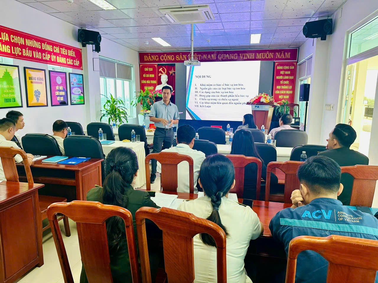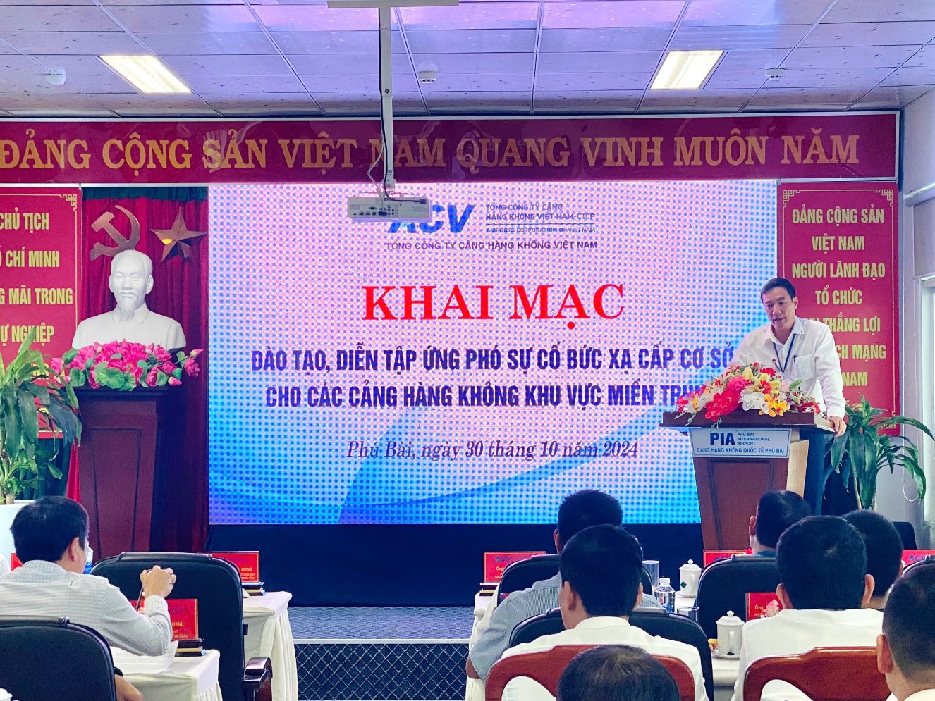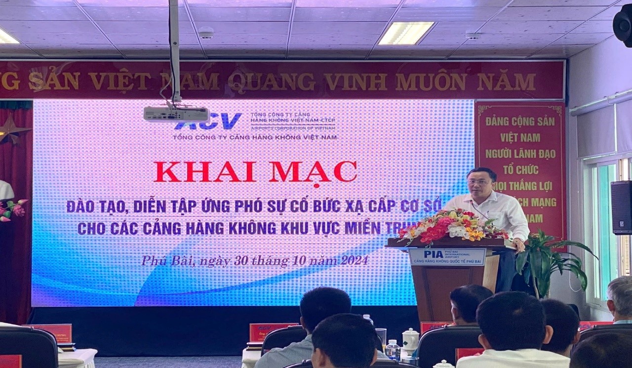 Ông Phan Kiều Hưng - Ủy viên Ban Chấp hành Đảng bộ Tổng công ty Cảng hàng không Việt Nam - Bí thư Đảng ủy, Giám đốc Cảng hàng không quốc tế Đà Nẵng, Người được Tổng Giám đốc Tổng công ty Cảng hàng không Việt Nam ủy quyền phụ trách về an toàn bức xạ các cảng hàng không miềm trung, tuyên bố khai mạc lớp đào tạo và tổ chức diễn tập ứng phó sự cố bức xạ cấp cư sở cho các cảng hàng không miền trung tại Cảng hàng không quốc tế Phú Bài