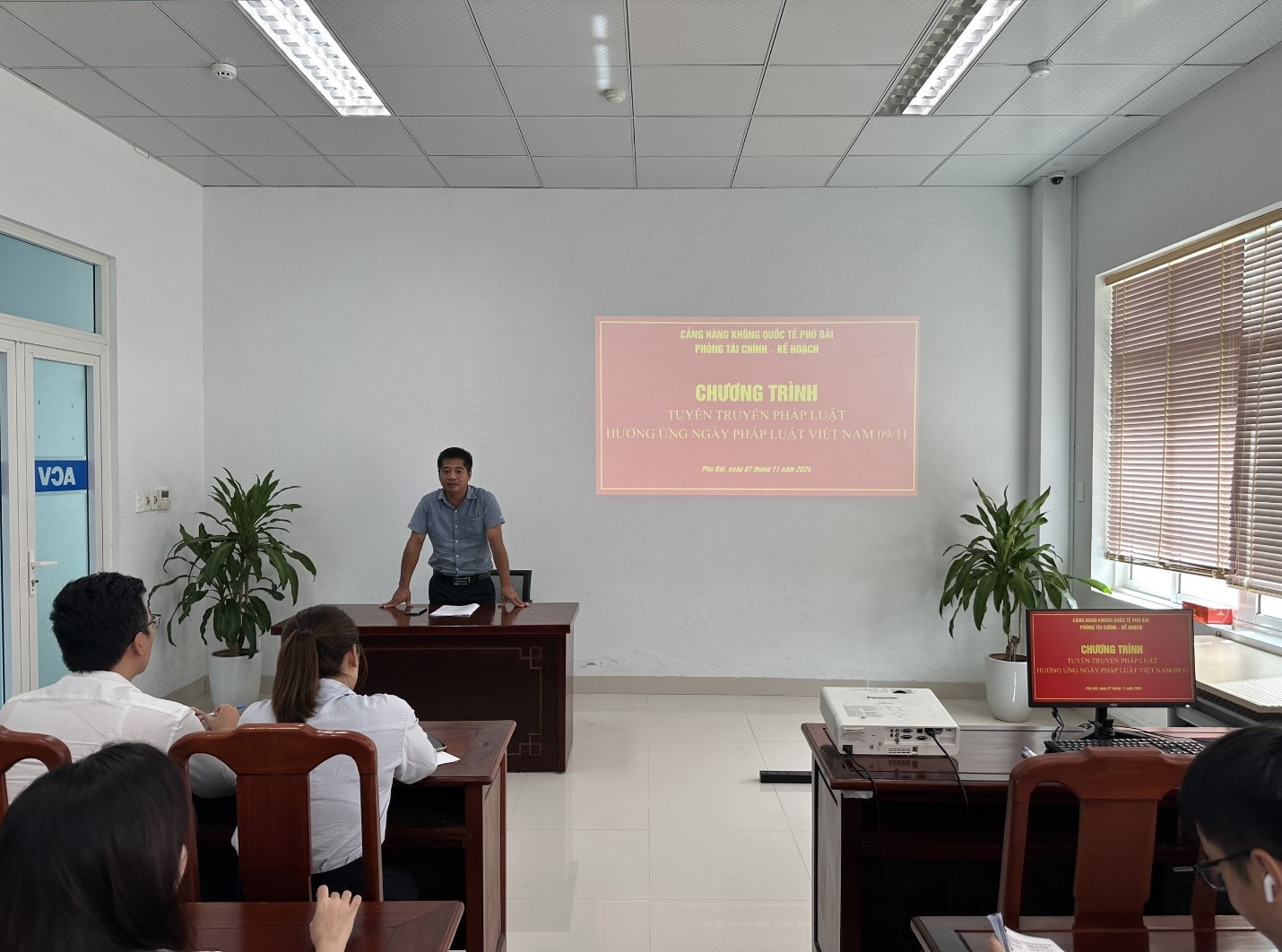 Thực hiện Chỉ thị 457/CT-HĐQT ngày 10/10/2024 của Chủ tịch Hội đồng quản trị Tổng công ty Cảng hàng không Việt Nam-CTCP về việc tuyên truyển, phổ biến giáo dục Pháp luật và Hưởng ứng Ngày pháp luật Việt Nam 9/11. Nhằm cụ thể Hoạt động tuyên truyền hưởng ứng về Ngày Pháp luật Việt Nam. Ngày 18/10/2024, Cảng hàng không quốc tế Phú Bài tổ chức xây dựng Kế hoạch số 1075/KH-CHKQTPB phân công trách nhiệm cụ thể cho các phòng trực thuộc để triển khai thực hiện, đã tổ chức nhiều cuộc tuyên truyền với hình thức phong phú, đa dạng.