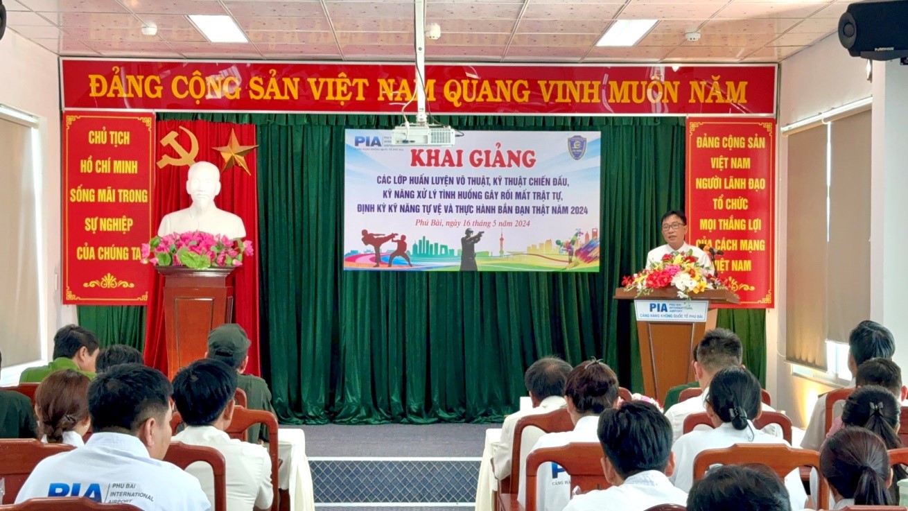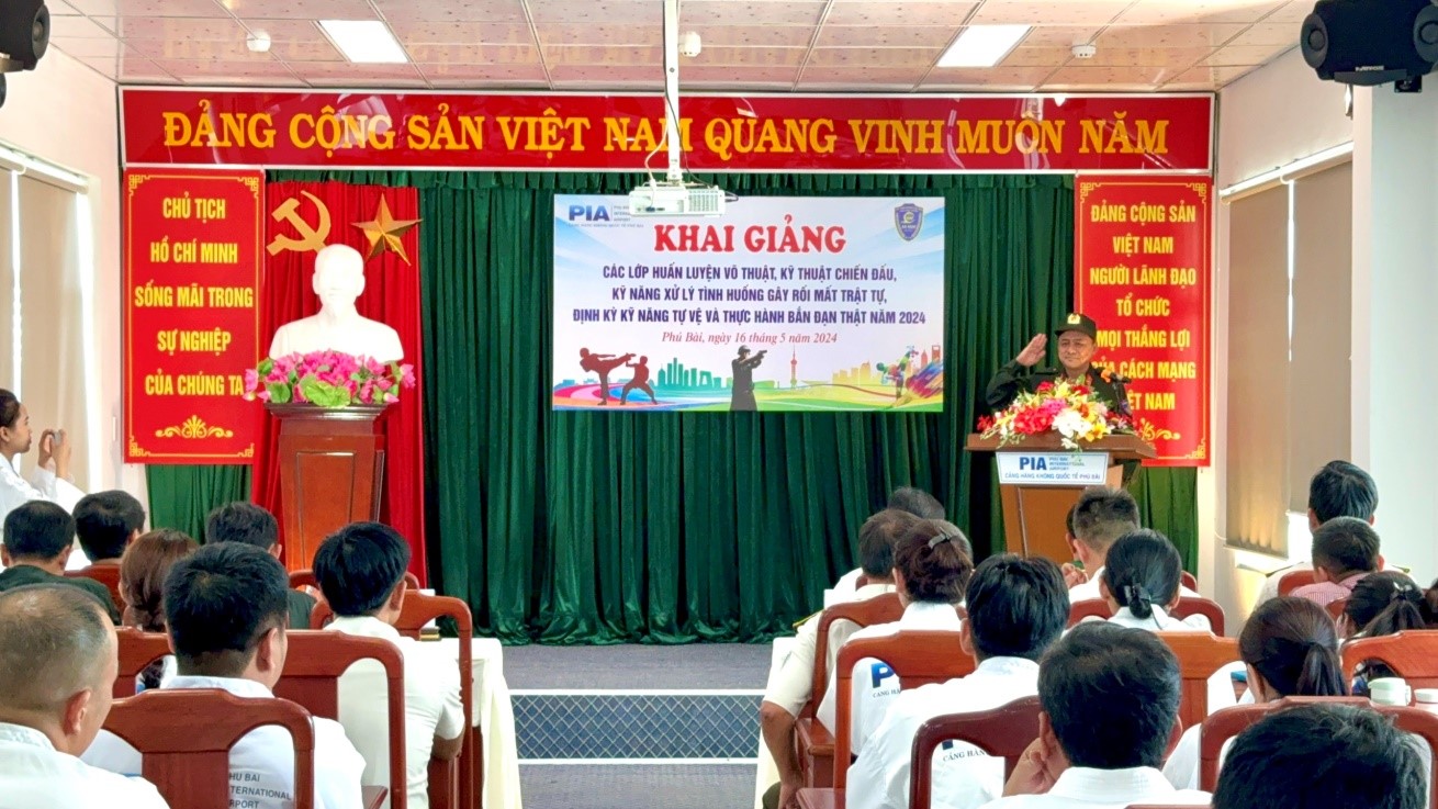 Thực hiện Chỉ thị số 06/CT-TTg ngày 24/02/2023 của Chính phủ về nâng cao năng lực công tác đảm bảo an ninh, an toàn hàng không trong tình hình mới và Quyết định số 2683/QĐ-TCTCHKVN ngày 31/8/2021 của Tổng Công ty Cảng hàng không Việt Nam-CTCP về việc ban hành Đề án nâng cao năng lực bảo đảm an ninh hàng không giai đoạn 2021-2025. Được sự nhất trí của Đảng ủy, Lãnh đạo Tổng công ty Cảng hàng không Việt Nam – CTCP. Ngày 16/5/2024, Cảng HKQT Phú Bài đã tổ chức Lễ khai giảng các lớp huấn luyện võ thuật, kỹ thuật chiến đấu, kỹ năng xử lý tình huống gây rối mất trật tự, thực hành bắn đạn thật và định kỳ kỹ năng tự vệ năm 2024. Ông Đỗ Anh Đào - Phó Giám đốc Cảng HKQT Phú Bài chủ trì Lễ Khai giảng, tham dự Lễ có Thượng tá Phan Xuân Lịch - Trung đoàn trưởng Trung đoàn 176, Thượng tá Ngô Mơ - Trưởng phòng Cảnh sát cơ động (PK02)- CA tỉnh TT. Huế, Thượng tá Đinh Xuân Đại - Trưởng CA thị xã Hương Thủy cùng các cán bộ huấn luyện và cán bộ, nhân viên Phòng An ninh hàng không - Cảng HKQT Phú Bài.