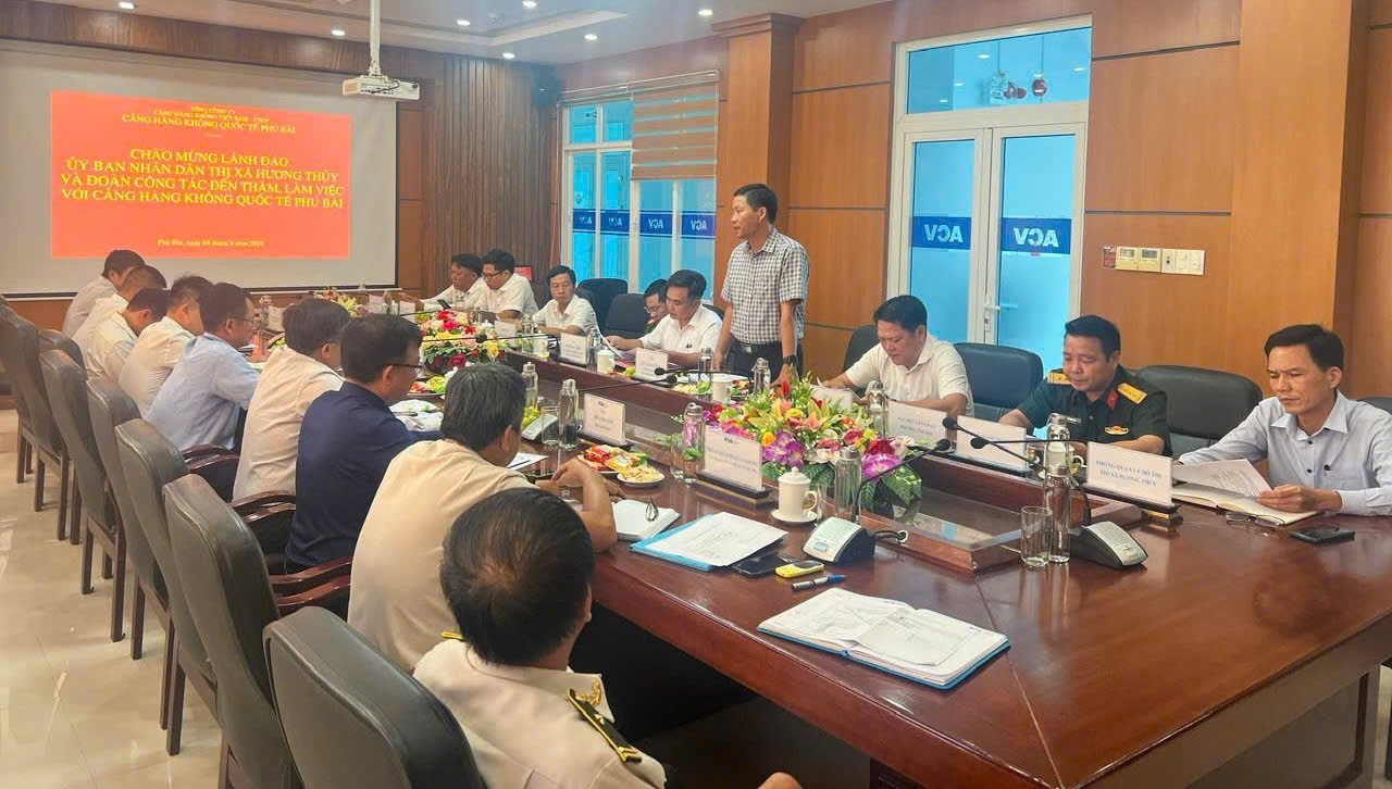 Ngày 04/9/2024, Cảng hàng không quốc tế Phú Bài làm việc với Uỷ ban nhân dân thị xã Hương Thủy về công tác đảm bảo an ninh, an toàn hàng không tại khu vực giáp ranh sân bay và xác định địa giới quy hoạch khu hoạt đông bay. Đến dự với buổi làm việc có Đ/c Lê Văn Cường Chủ tịch UBND thị xã Hương Thủy, Đ/c Ngô Văn Vinh Phó Chủ tịch UBND thị xã Hương Thủy, đại diện Công an thị xã Hương Thủy, đại diện Ban chỉ huy quân sự thị xã Hương Thủy, Ban Giám đốc Cảng HKQT Phú Bài cùng các đồng chí là lãnh đạo của hai đơn vị.