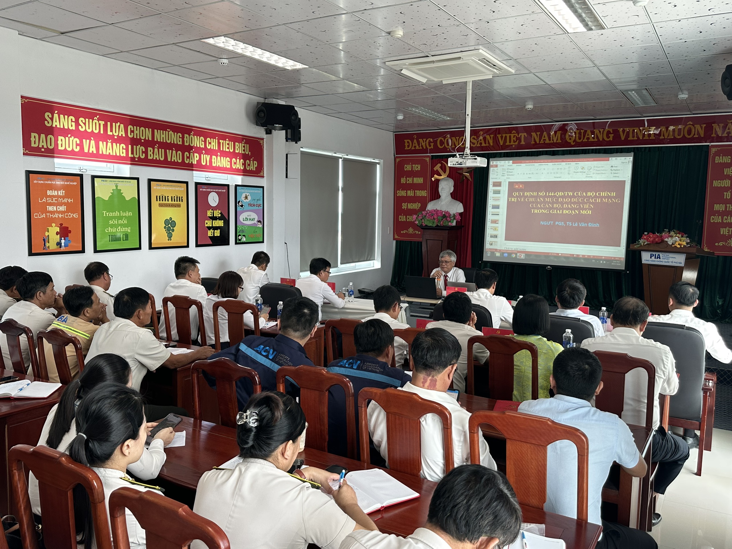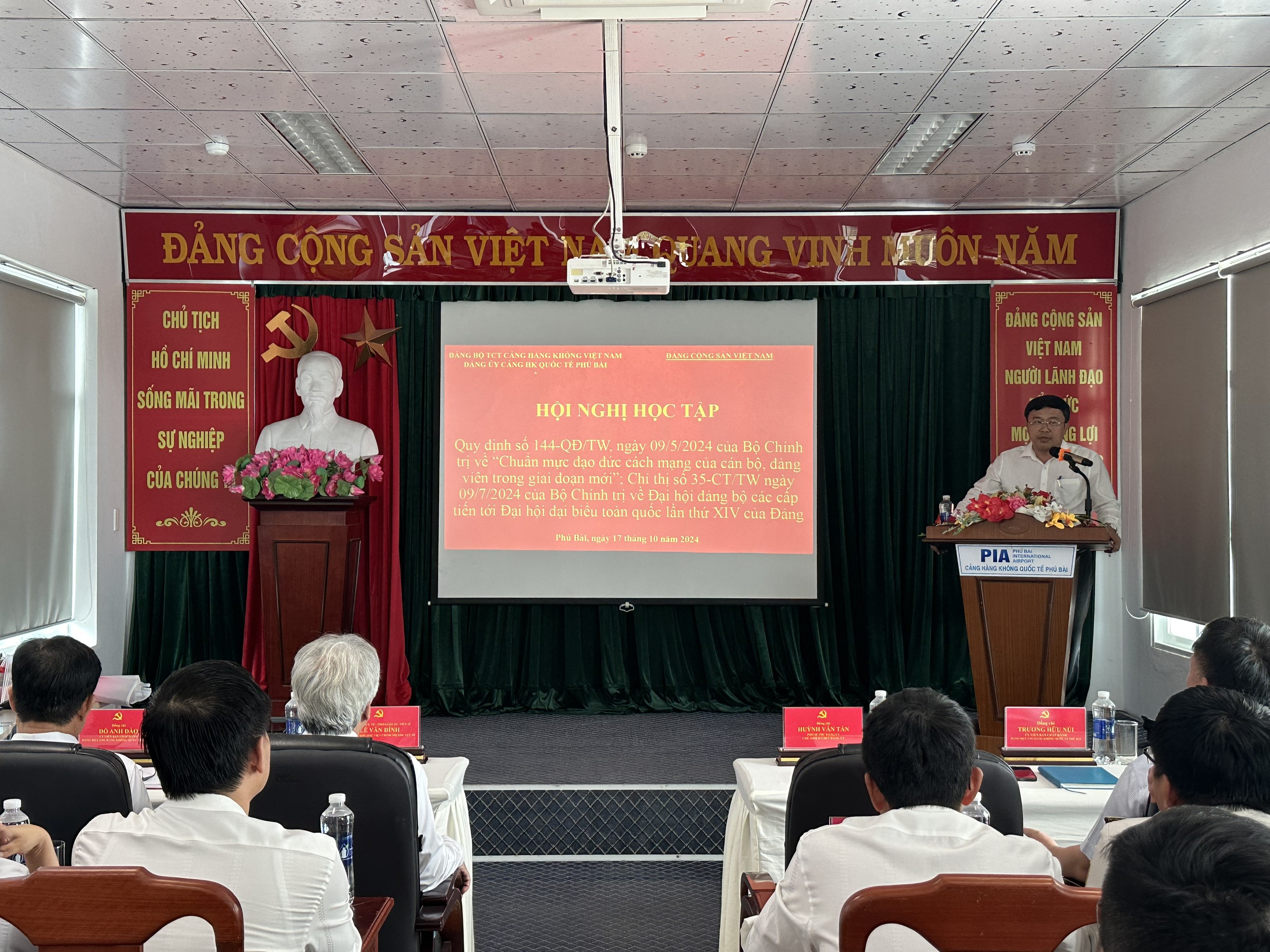 Chiều ngày 17 tháng 10 năm 2024, Đảng bộ Cảng hàng không quốc tế Phú Bài đã tổ chức Hội nghị học tập chuyên đề về Quy định số 144-QĐ/TW, ngày 09/5/2024, của Bộ Chính trị về “Chuẩn mực đạo đức cách mạng của cán bộ, đảng viên trong giai đoạn mới” và Chỉ thị số 35-CT/TW ngày 09/7/2024 của Bộ Chính trị về Đại hội đảng bộ các cấp tiến tới Đại hội đại biểu toàn quốc lần thứ XIV của Đảng. Tham dự hội nghị có Ban chấp hành Đảng bộ Cảng hàng không quốc tế Phú Bài, cấp ủy các Chi bộ trực thuộc và 60 đảng viên.