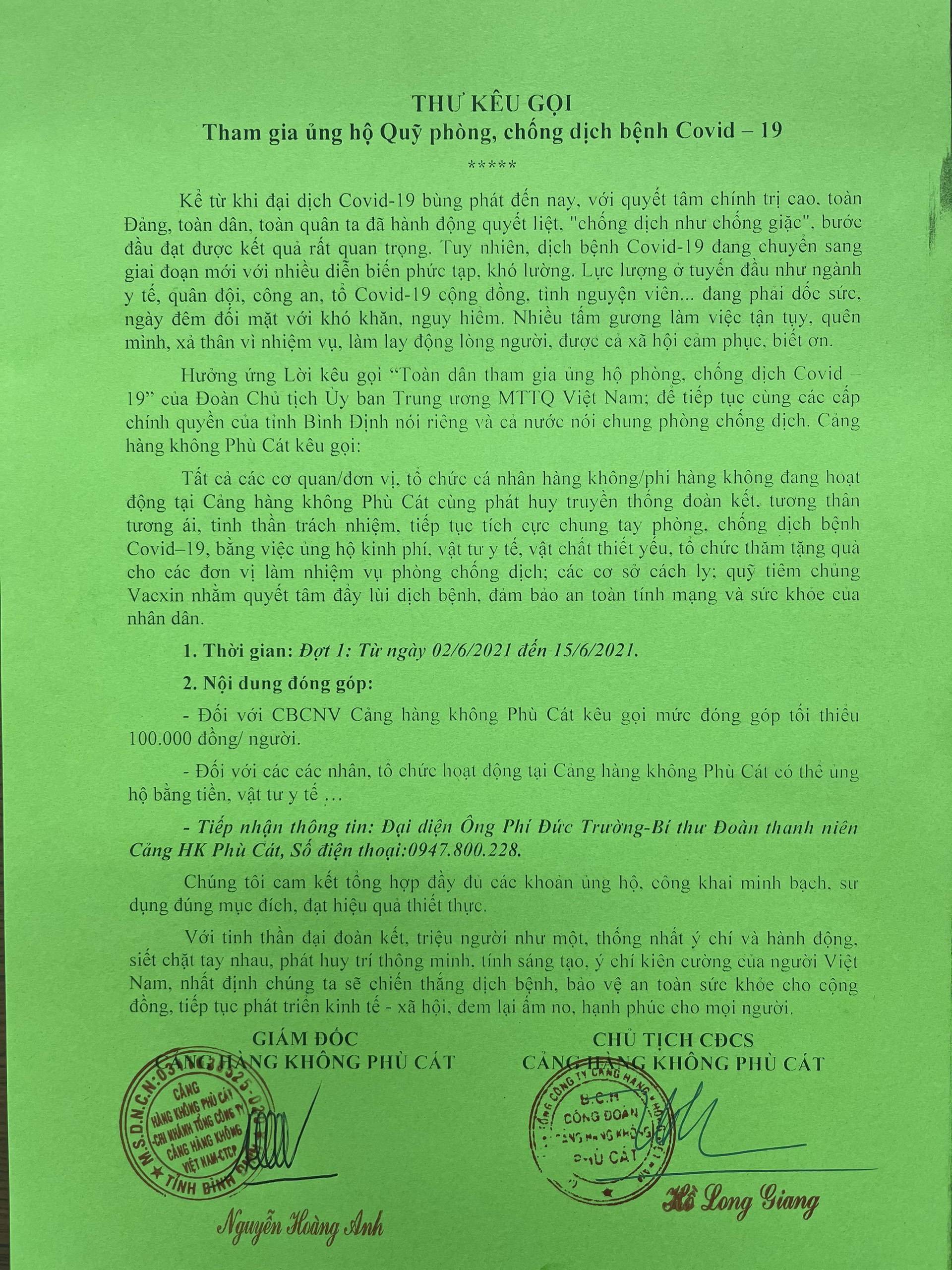 Ngày 02/06/2021, Đại diện Chính quyền-Công đoàn cơ sở Cảng hàng không Phù Cát đã có Thư kêu gọi CBCNV-NLĐ của tất cả các đơn vị đang hoạt động tại Cảng hàng không Phù Cát tham gia ủng hộ Quỹ phòng chống dịch bệnh Covid-19 của tỉnh Bình Định.