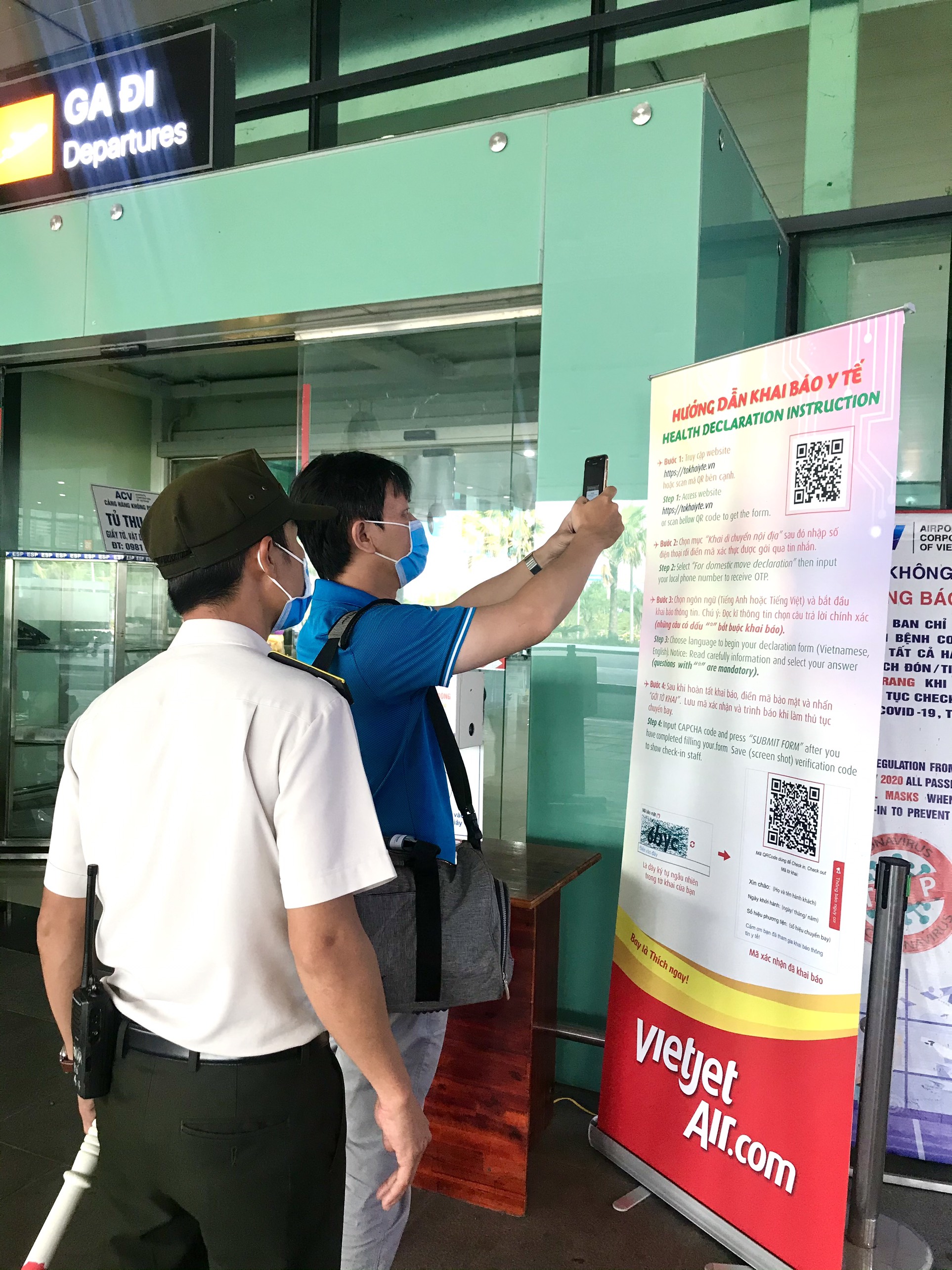 Nhân viên An ninh hàng không hướng dẫn hành khách thực hiện khai báo y tế theo thông báo cáo Hãng tại Cảng hàng không Phù Cát