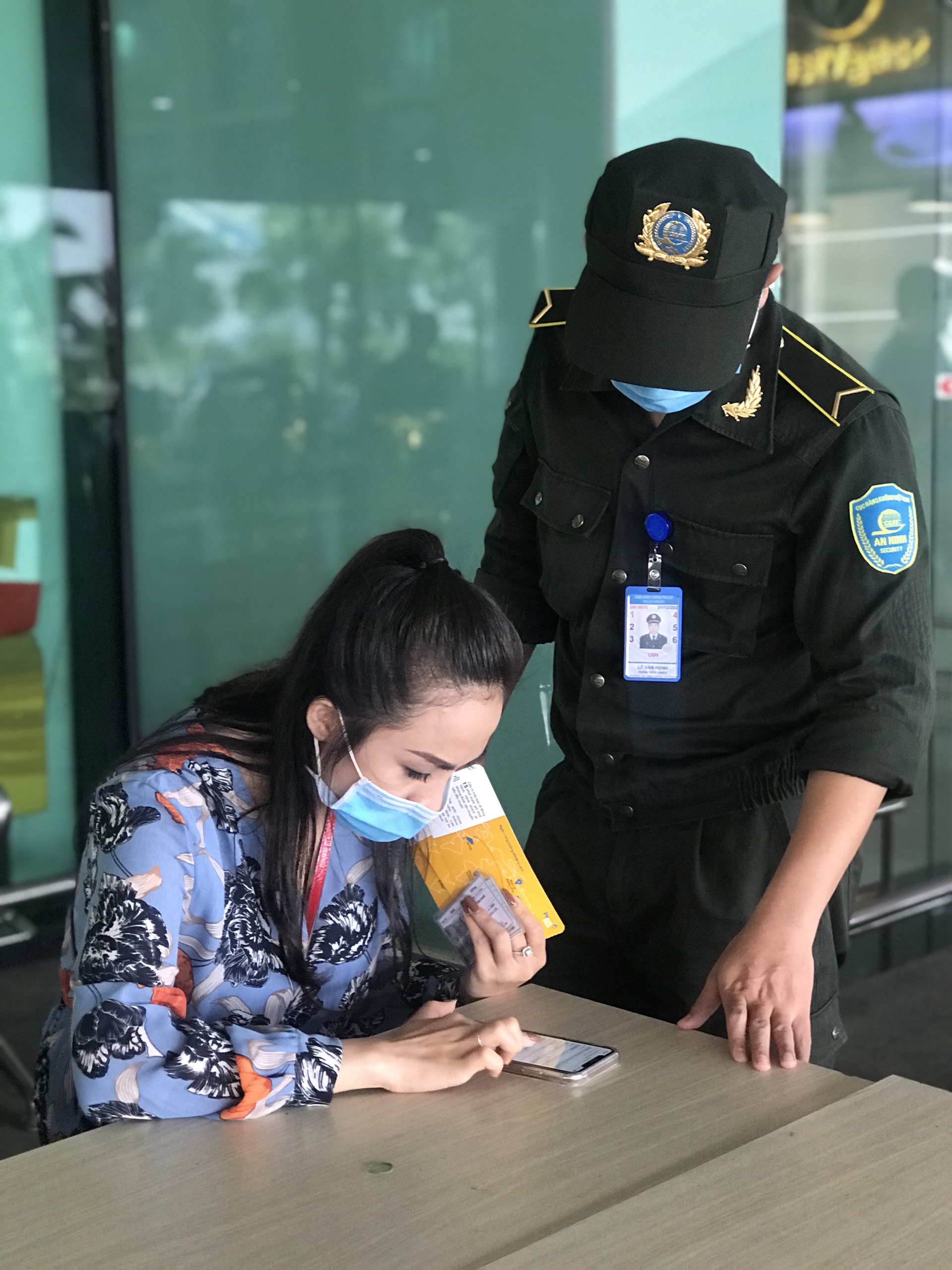 Nhân viên ANHK hỗ trợ hành khách tại bàn khai báo y tế tại khu vực bàn đặt trước cửa nhà ga đi T1-Cảng hàng không Phù Cát