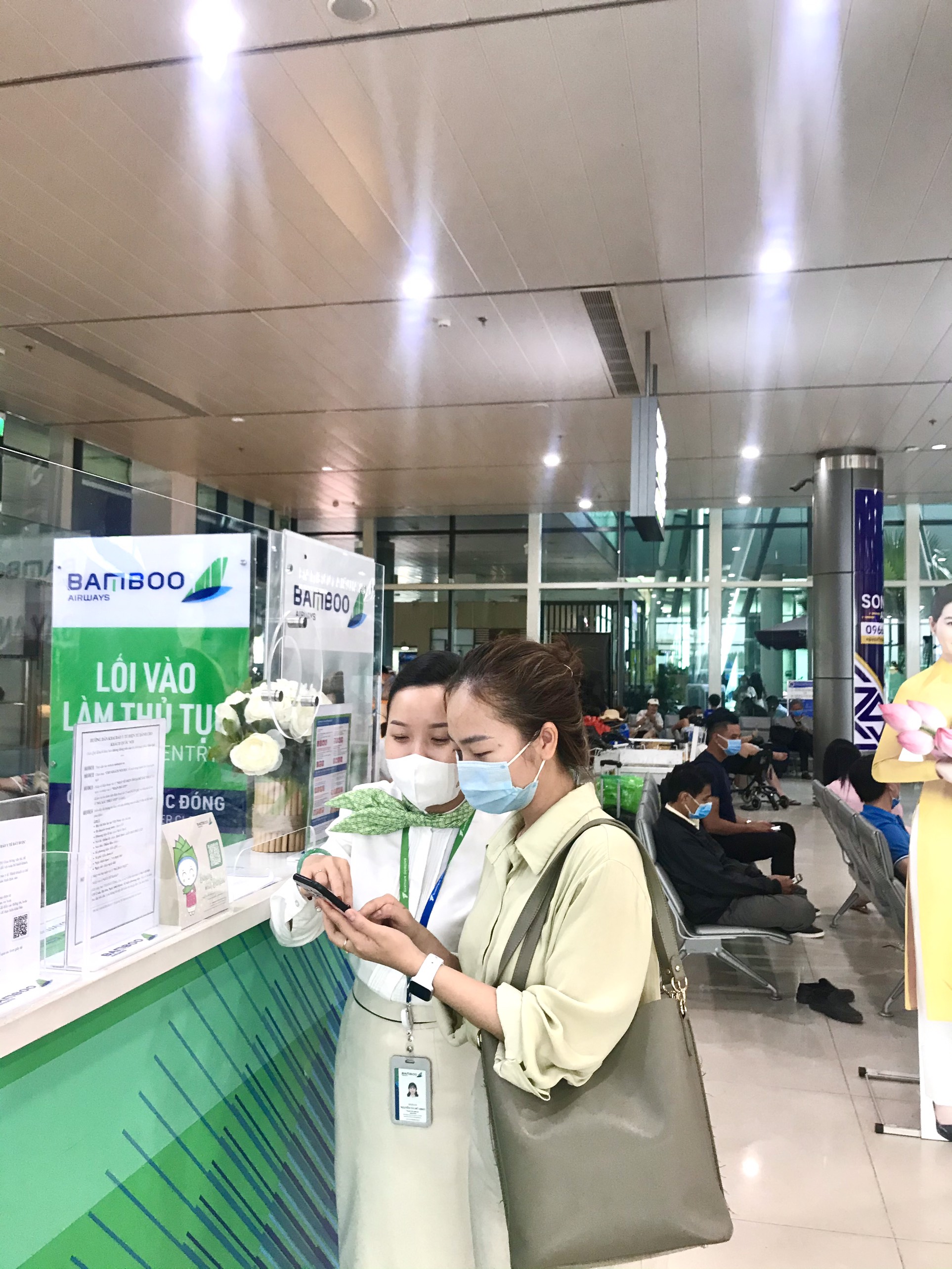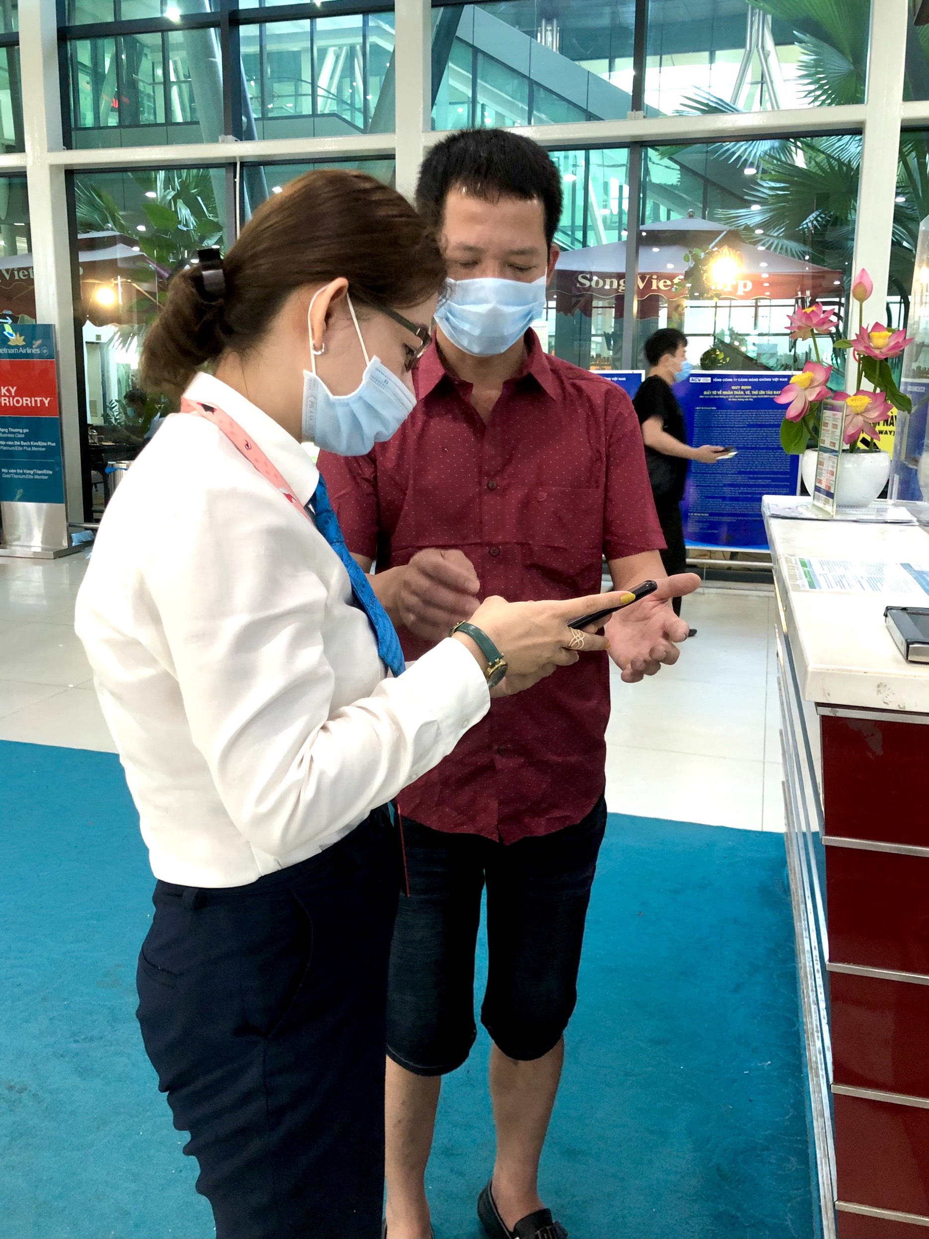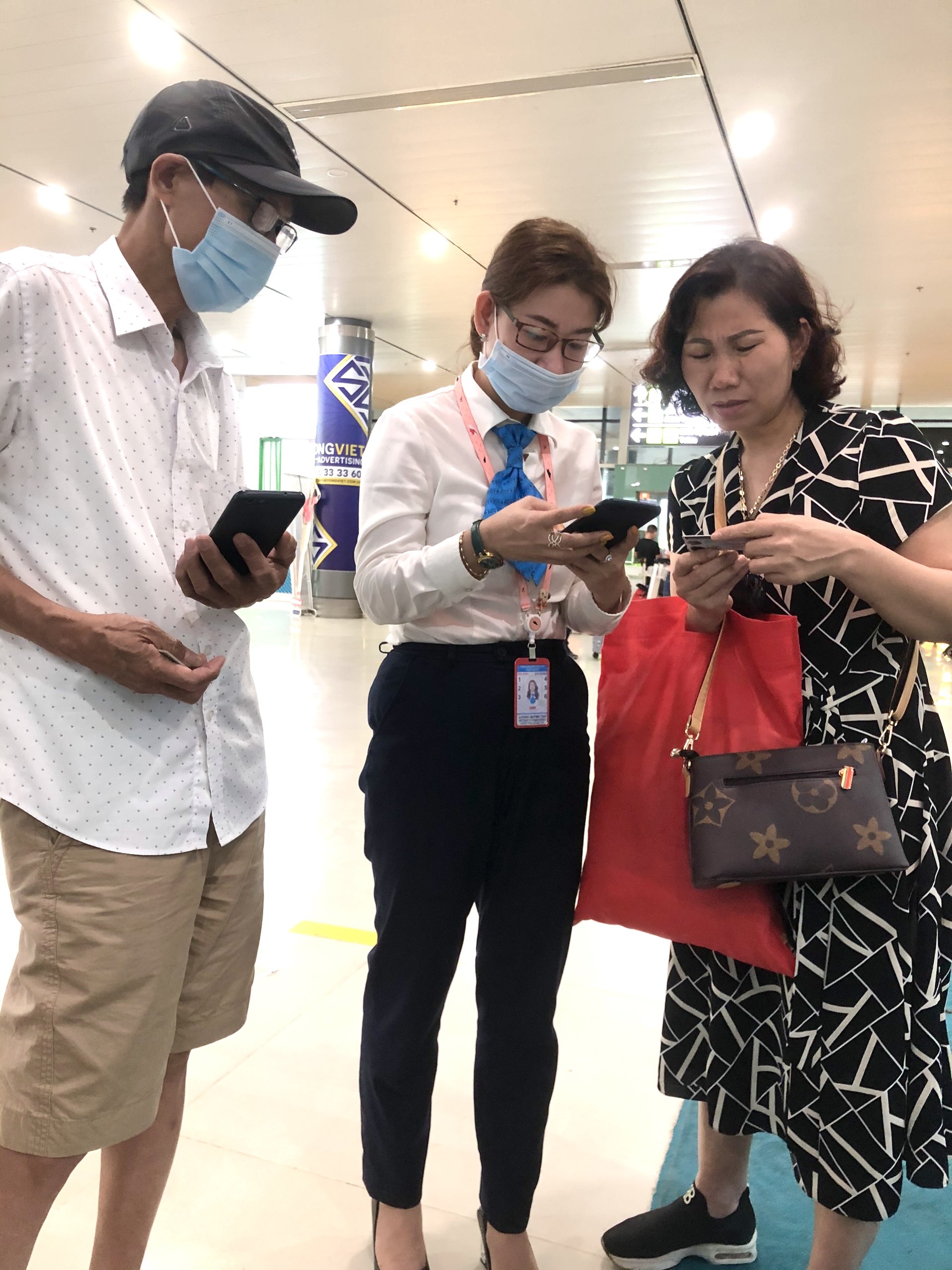 Nhân viên Hãng hàng không Bamboo Airways hướng dẫn hành khách khai báo y tế điện tử-tại Cảng hàng không Phù Cát