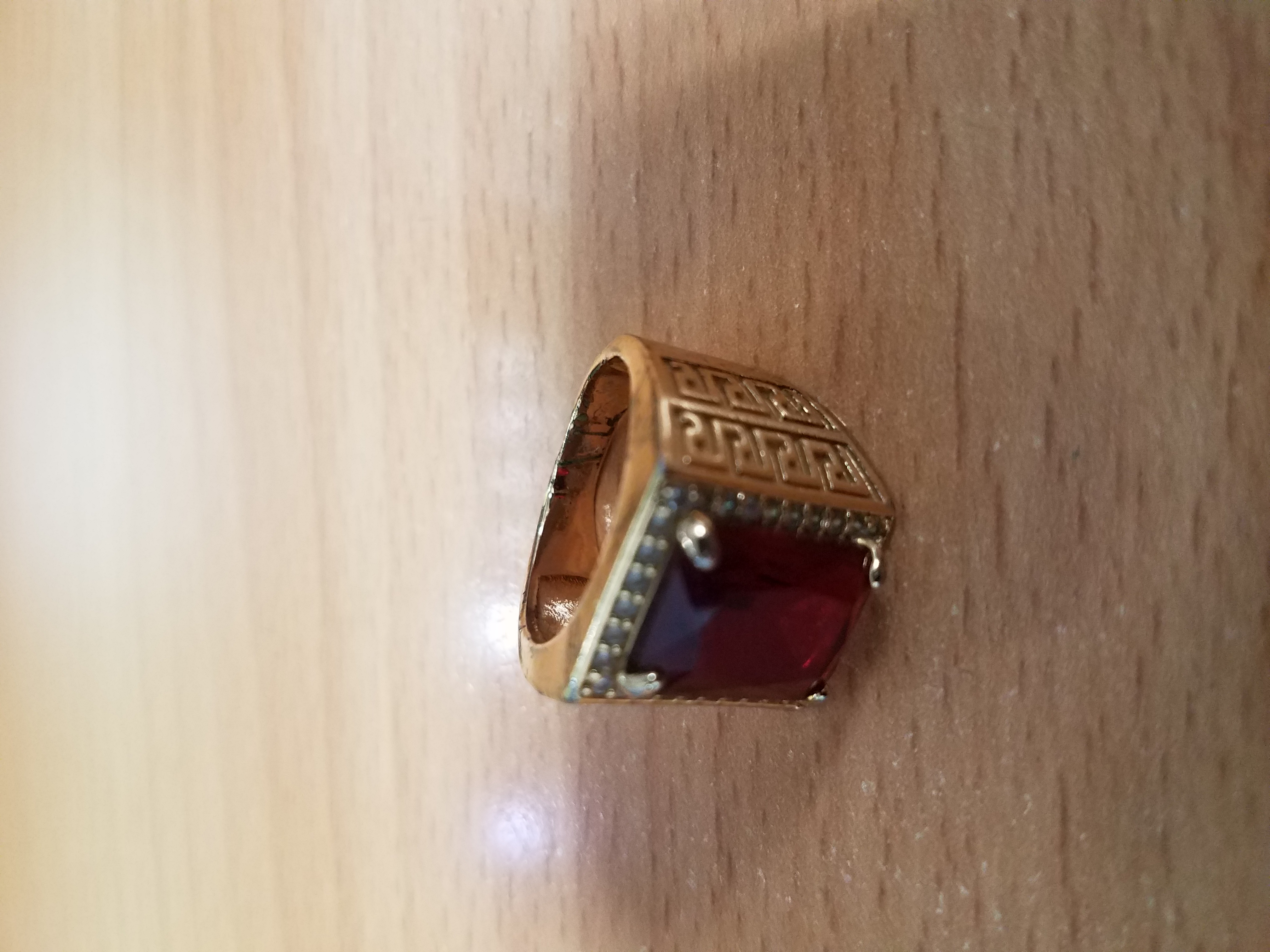 01 nhẫn kim loại màu vàng đính đá màu đỏ, ngày 31/05/2023