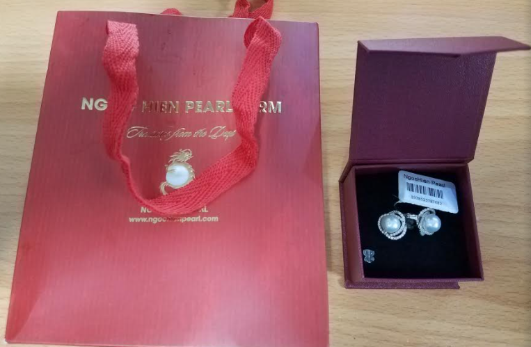 01 túi giấy nhỏ màu đỏ (Ngọc Hiền Pearl), bên trong có 01 hộp màu đỏ có 01 đôi hoa tai màu bạc, khách quên ở ANSC HLXT quốc nội.