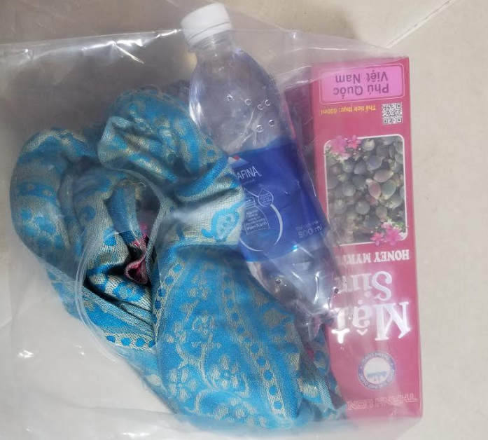 01 túi nilon, bên trong có 01 chai mật sim, nước suối, 01 khăn quàng, khách quên tại phòng cách ly quốc nội.