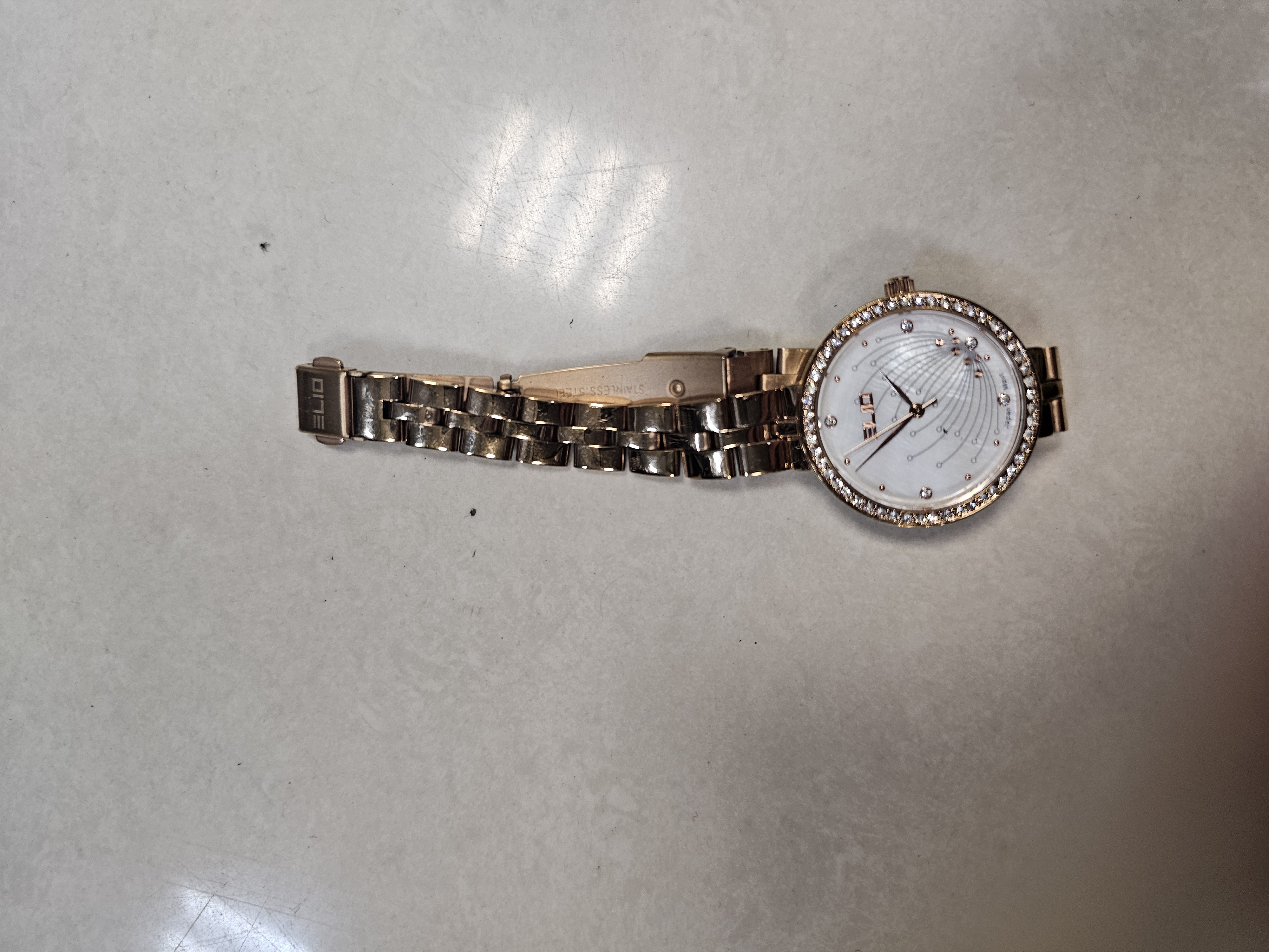 01 đồng hồ kim loại màu vàng hiệu Elio, ngày 01/01/2024