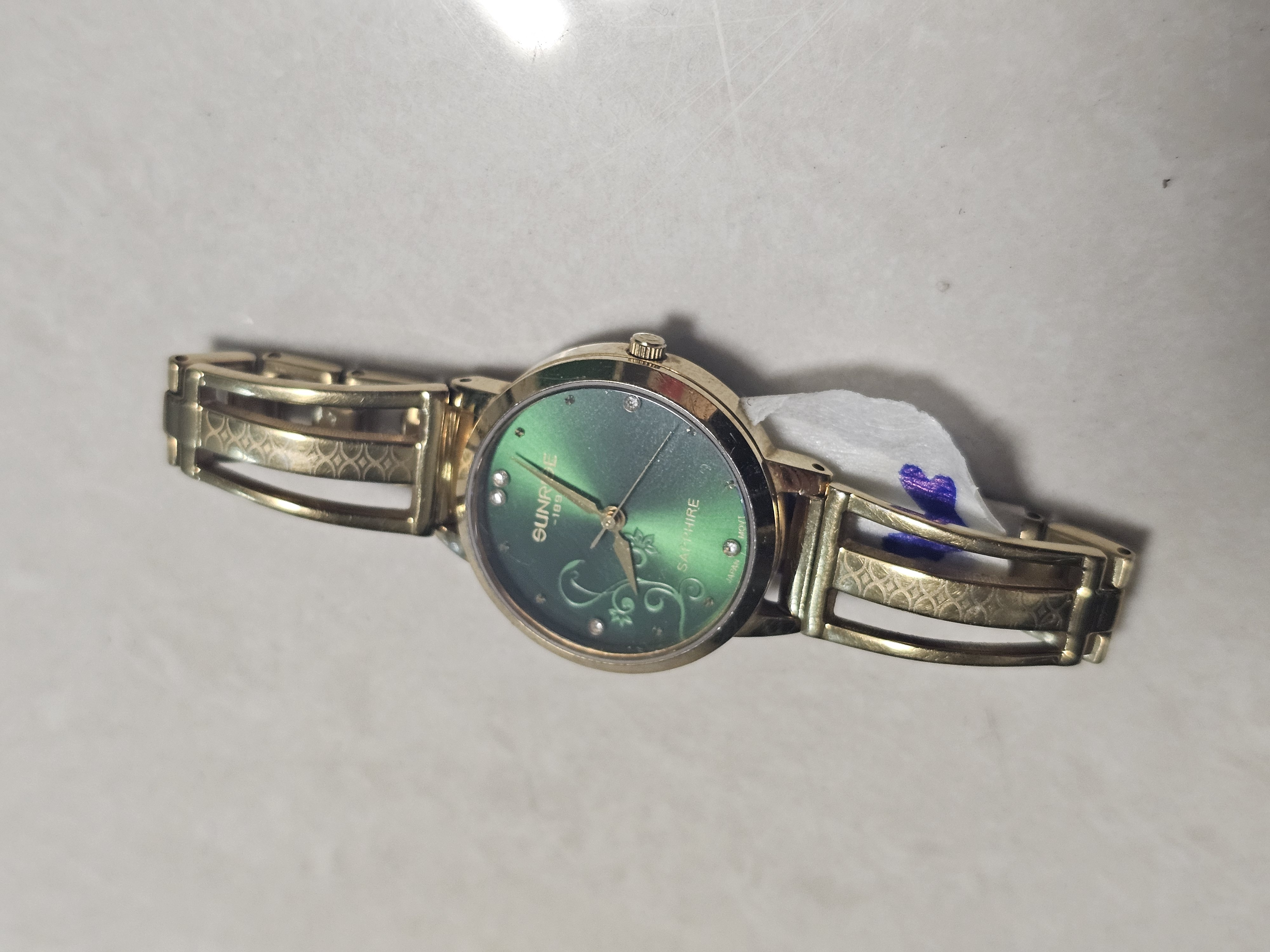 01 đồng hồ kim loại màu vàng, mặt màu xanh, hiệu SUNRISE, được tìm thấy vào ngày 25/04/2025