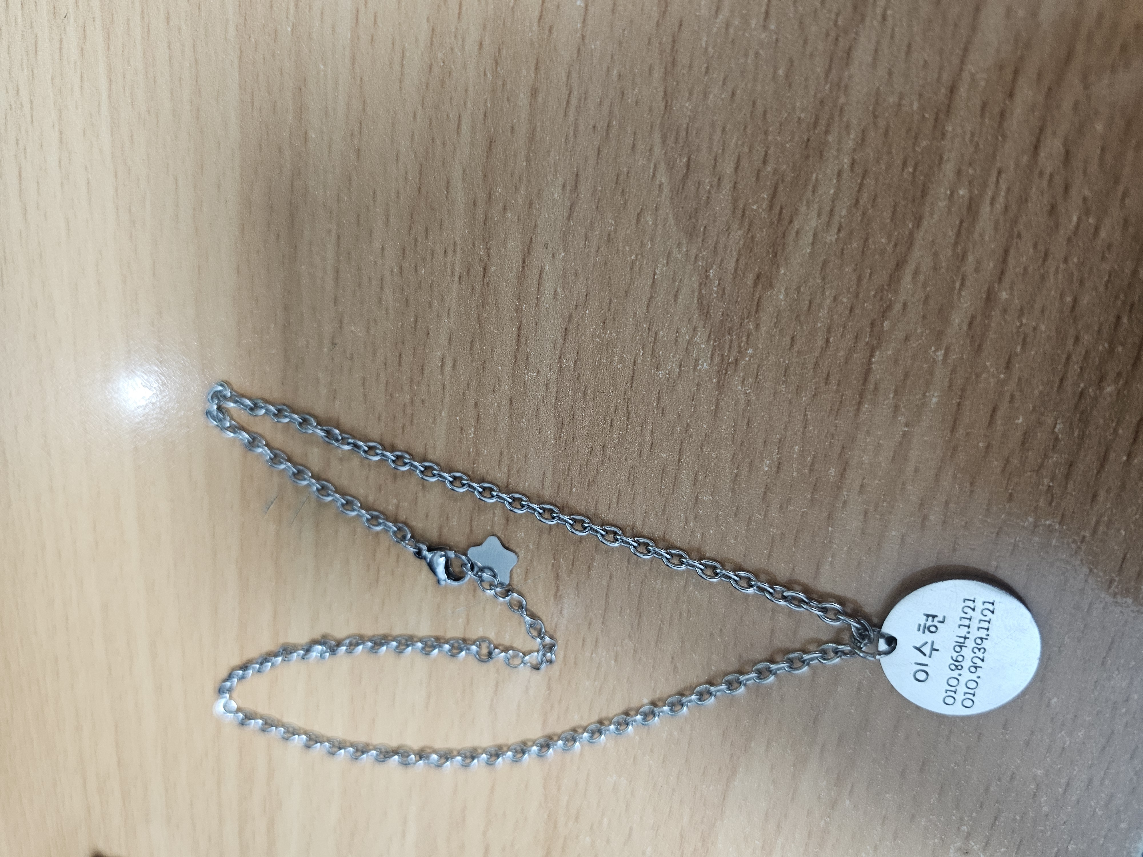 01 sợi dây chuyền kim loại màu trắng có chữ Lee Soo Hyun, được tìm thấy vào ngày 16/09/2024, được tìm thấy ở Sảnh check in Quốc tế (WC nữ).
