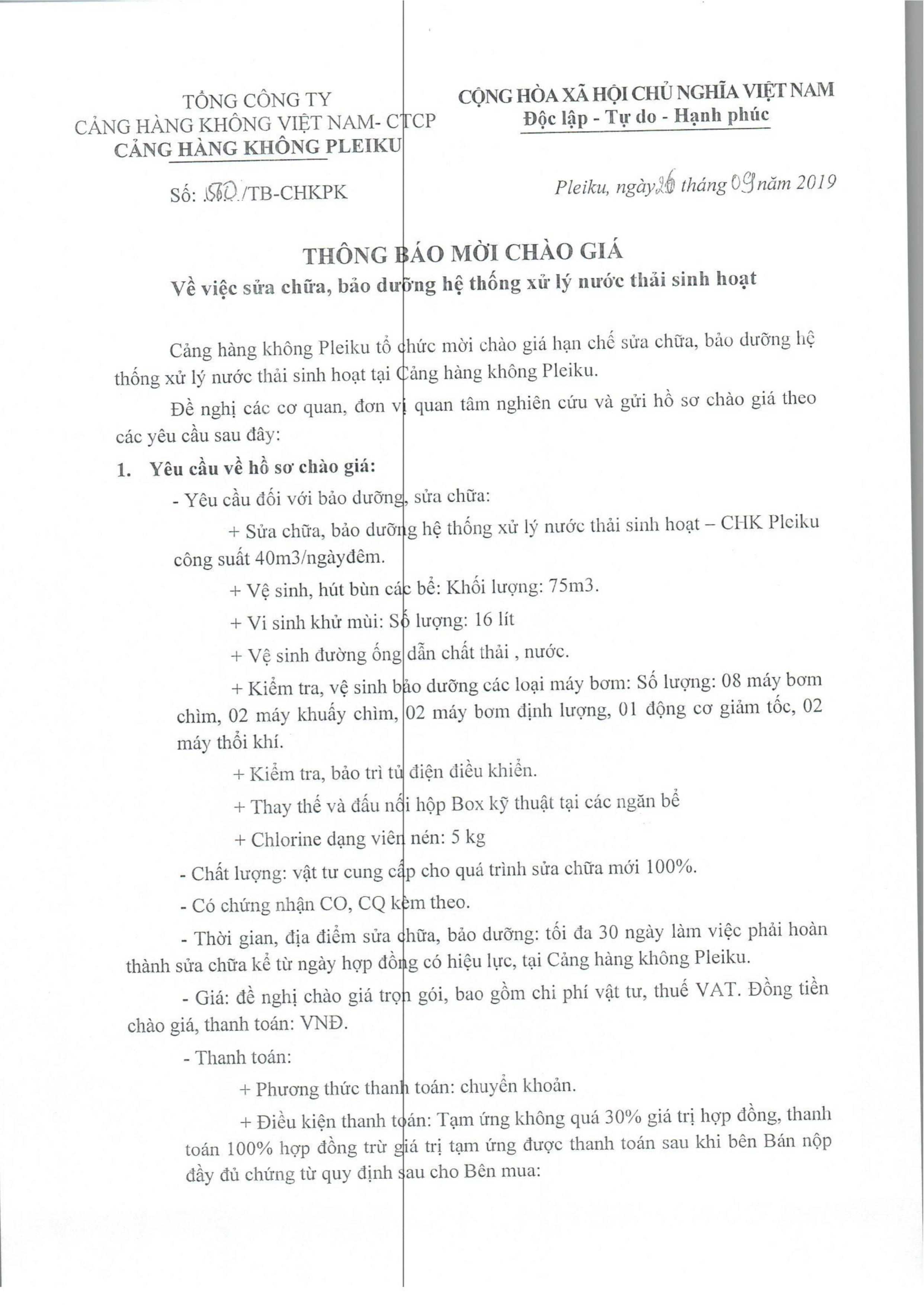 Thông báo về việc Kết quả chào giá “Bảo dưỡng định kỳ hệ thống xử lý nước thải sinh hoạt 06 tháng cuối năm 2025 tại Cảng hàng không Pleiku”