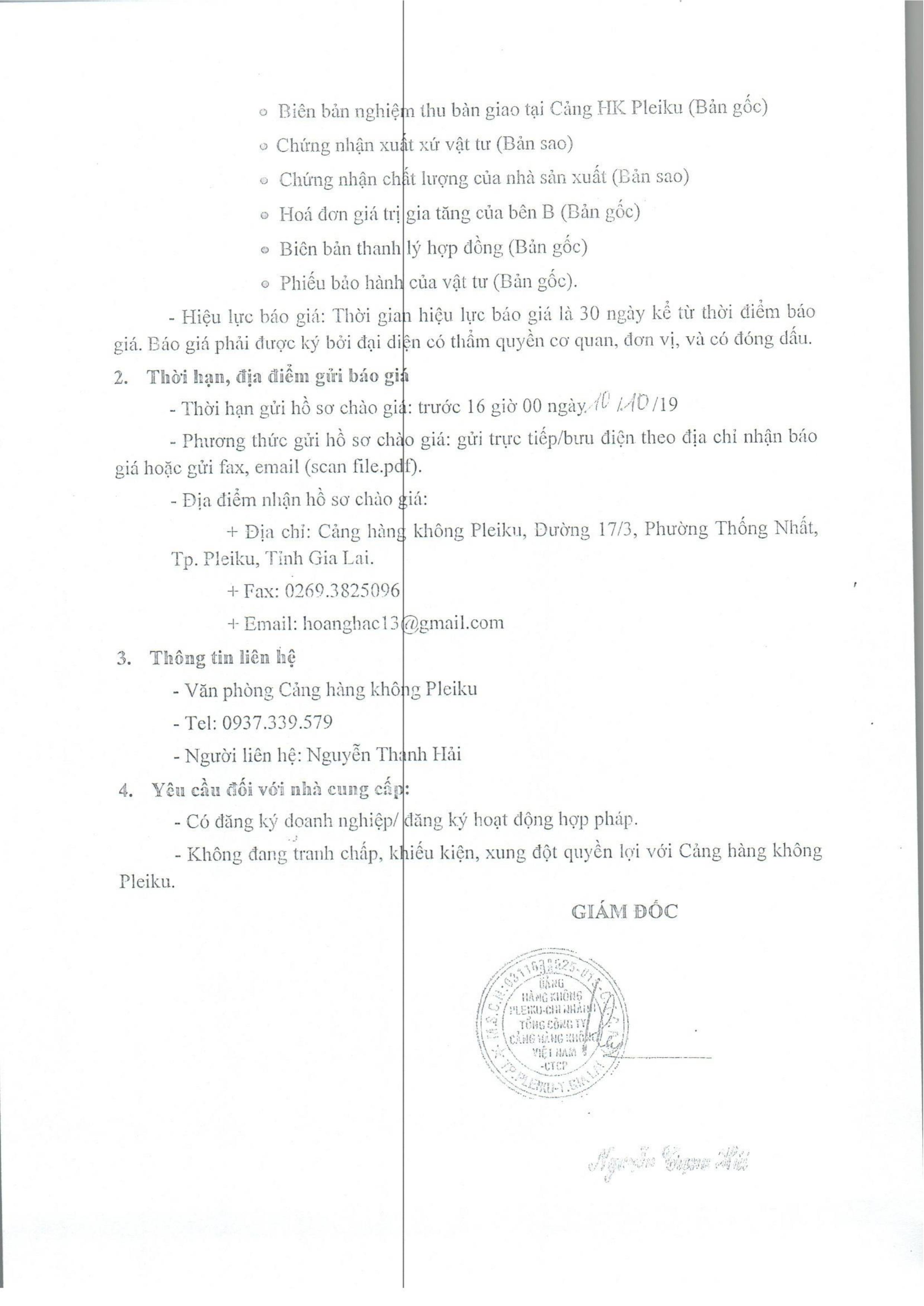 Thông báo mời chào giá về việc "Cung cấp và lắp đặt hệ thống cảnh báo an toàn cho xe thang hành khách tại Cảng hàng không Pleiku"