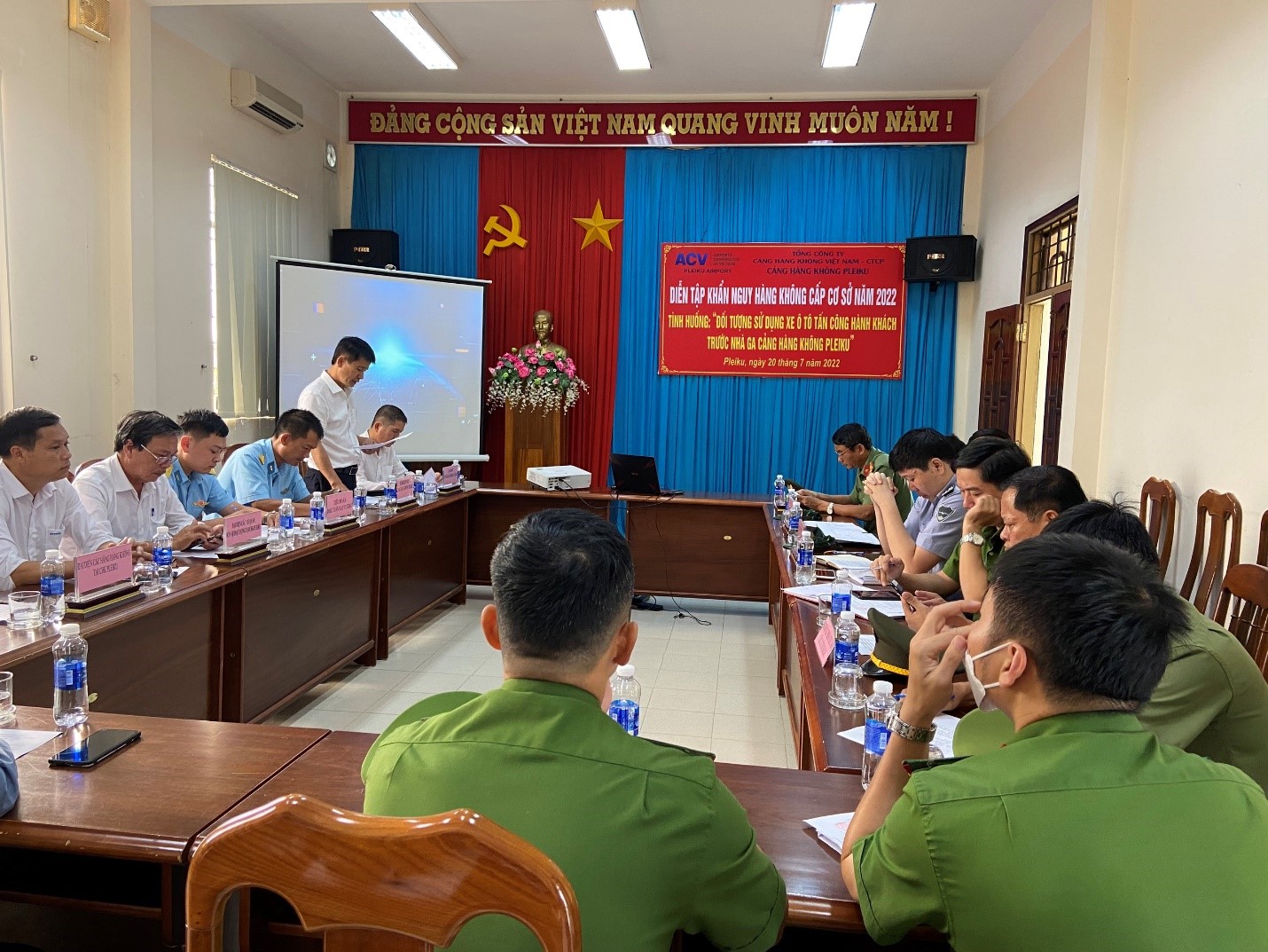 Cũng trong khuôn khổ các hoạt động công tác bảo đảm an ninh - an toàn hàng không, trước đó, ngày 20/7/2022, Cảng Hàng không Pleiku đã chủ trì, phối hợp với các cơ quan, đơn vị, lực lượng liên quan đã tổ chức diễn tập khẩn nguy cấp cơ sở đối phó với hành vi can thiệp bất hợp pháp năm 2022 với tình huống “ Đối tượng sử dụng xe ô tô tấn công hành khách trước nhà ga Cảng hàng không Pleiku”.