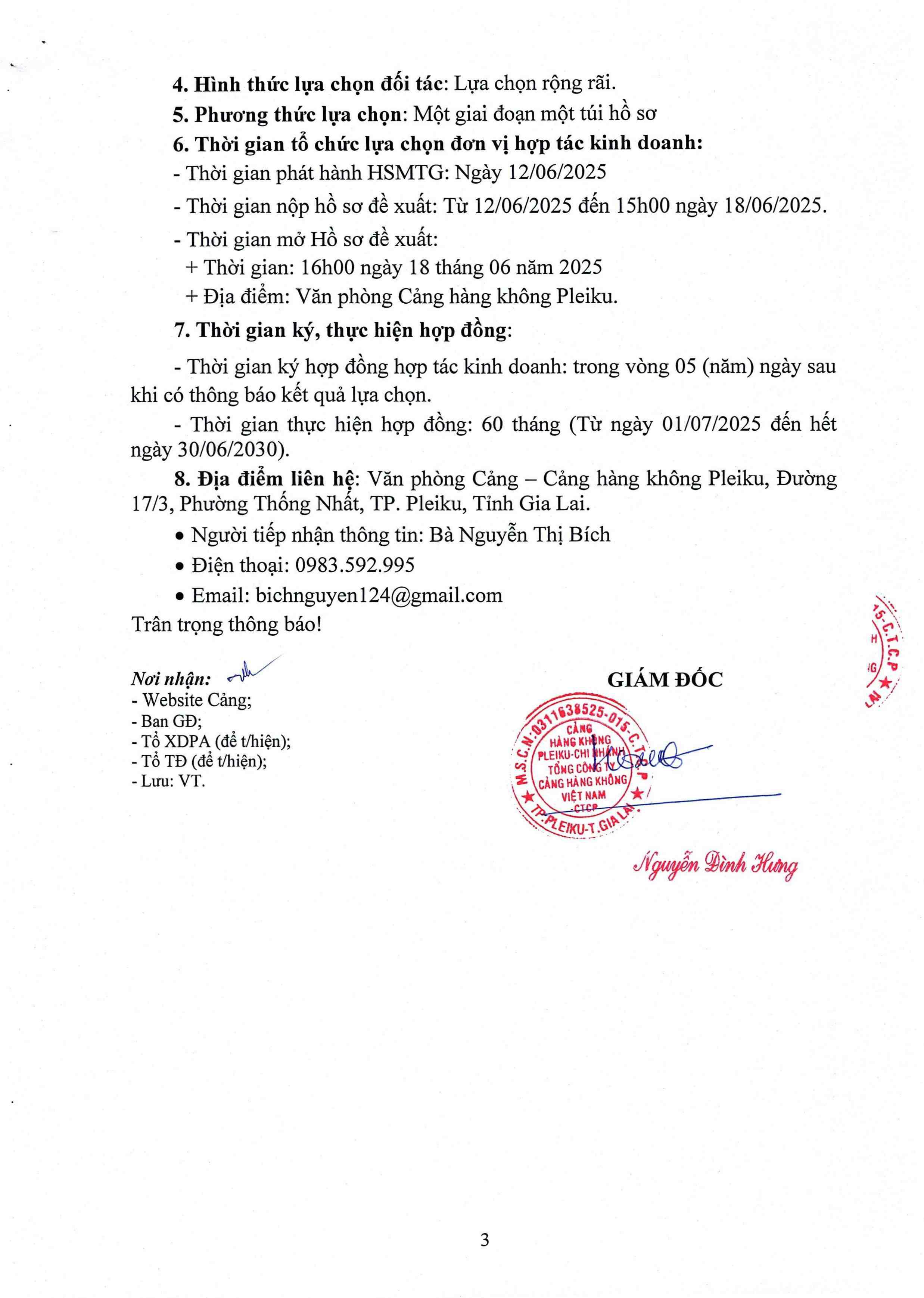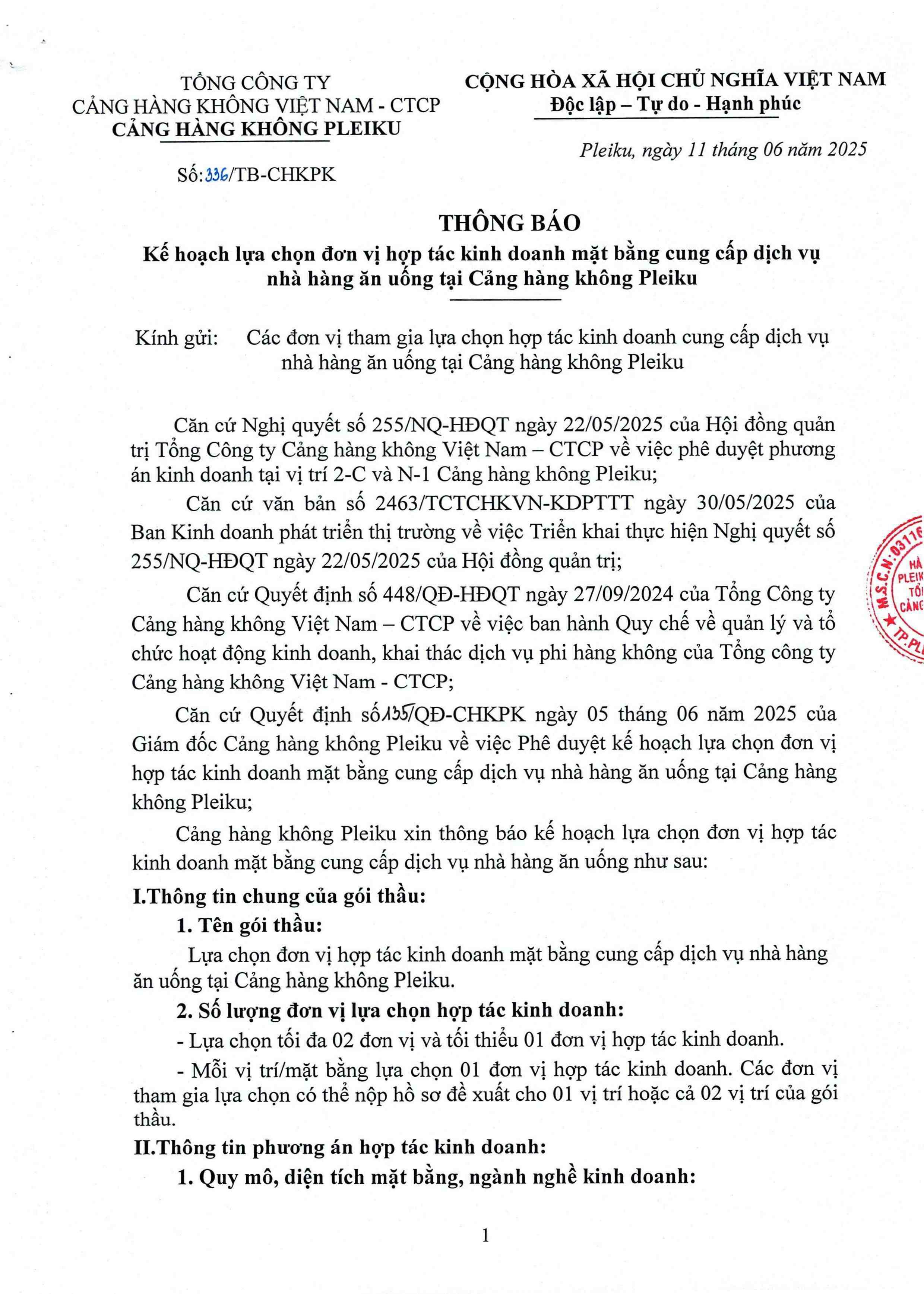 Thông báo kế hoạch lựa chọn đơn vị thuê mặt bằng cung cấp dịch vụ ăn uống tại Cảng hàng không Pleiku